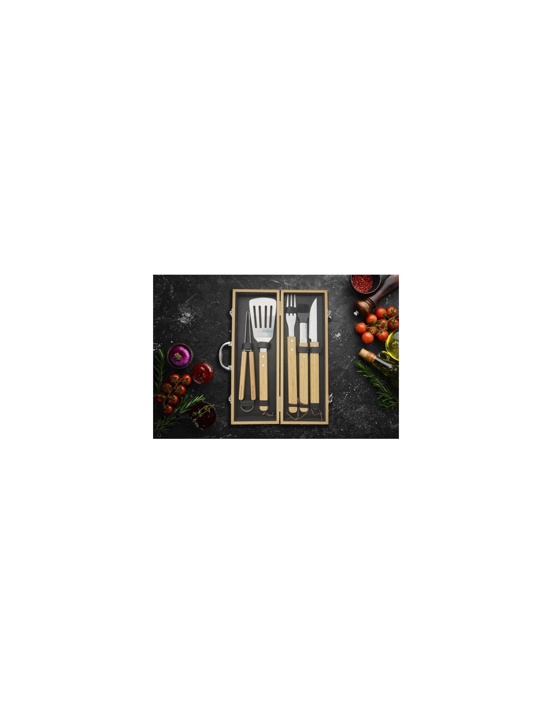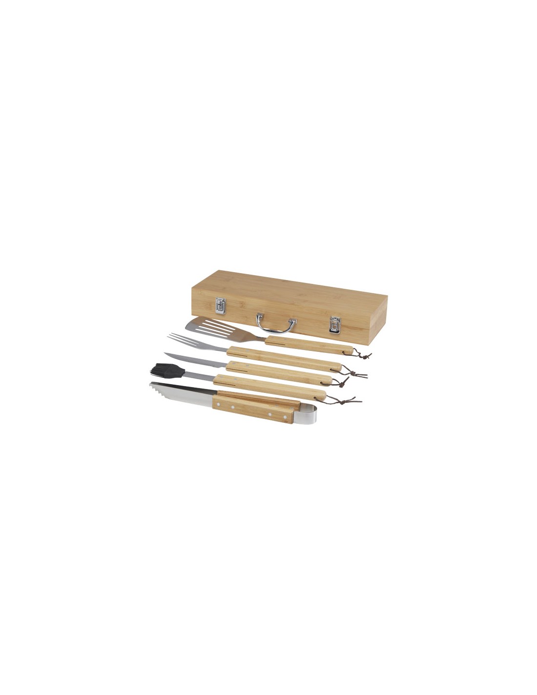 Set da barbecue in bambù composto da 3 pezzi: spatola (42 x 9,5 cm), pinza (46 x 2,2 cm) e forchettone (43 x 3,2 cm). Il set viene consegnato in una confezione regalo in bambù (51,5 x 18,2 x 7,2 cm). I manici e la confezione regalo sono realizzati in bambù ottenuto e prodotto in base a standard...
