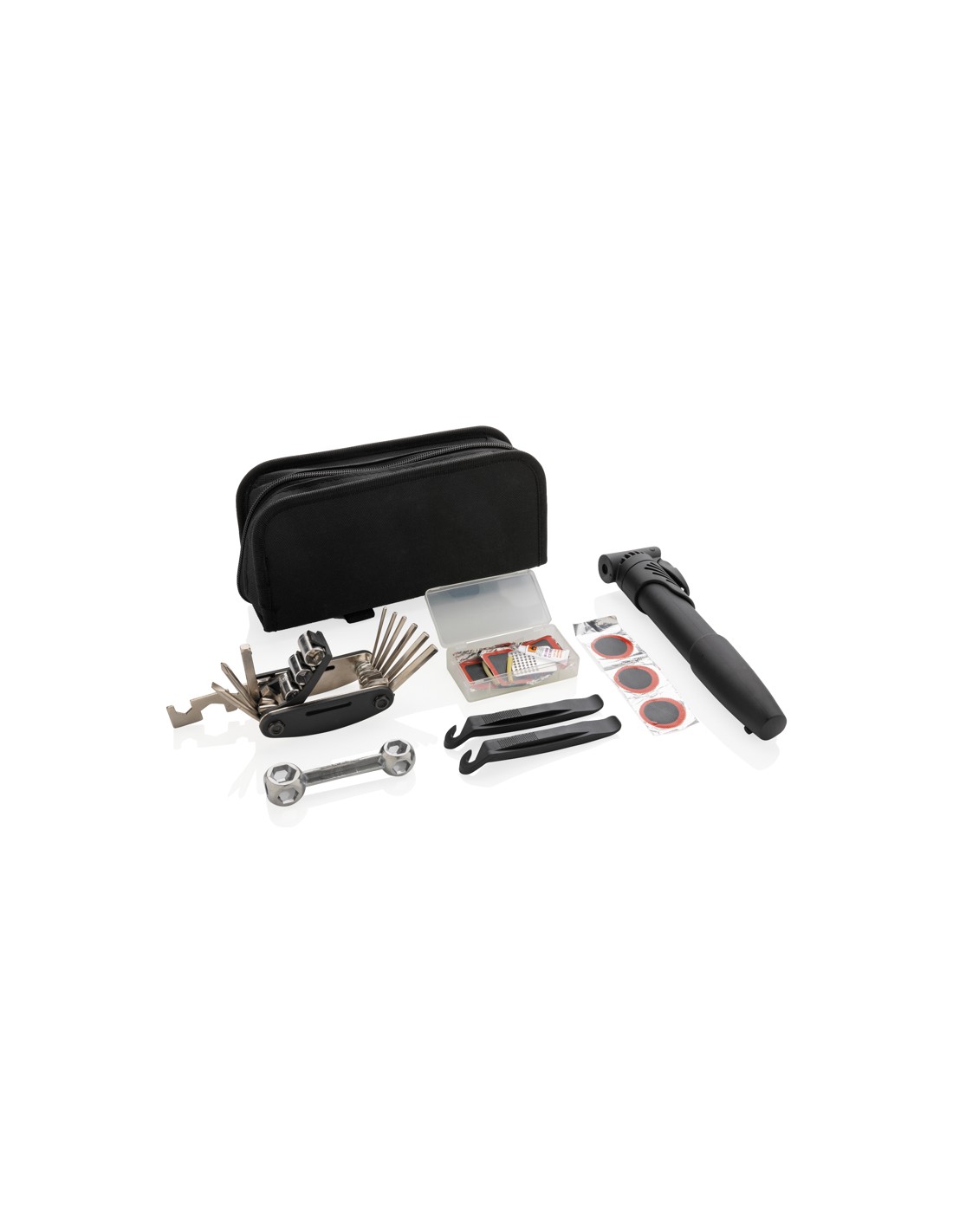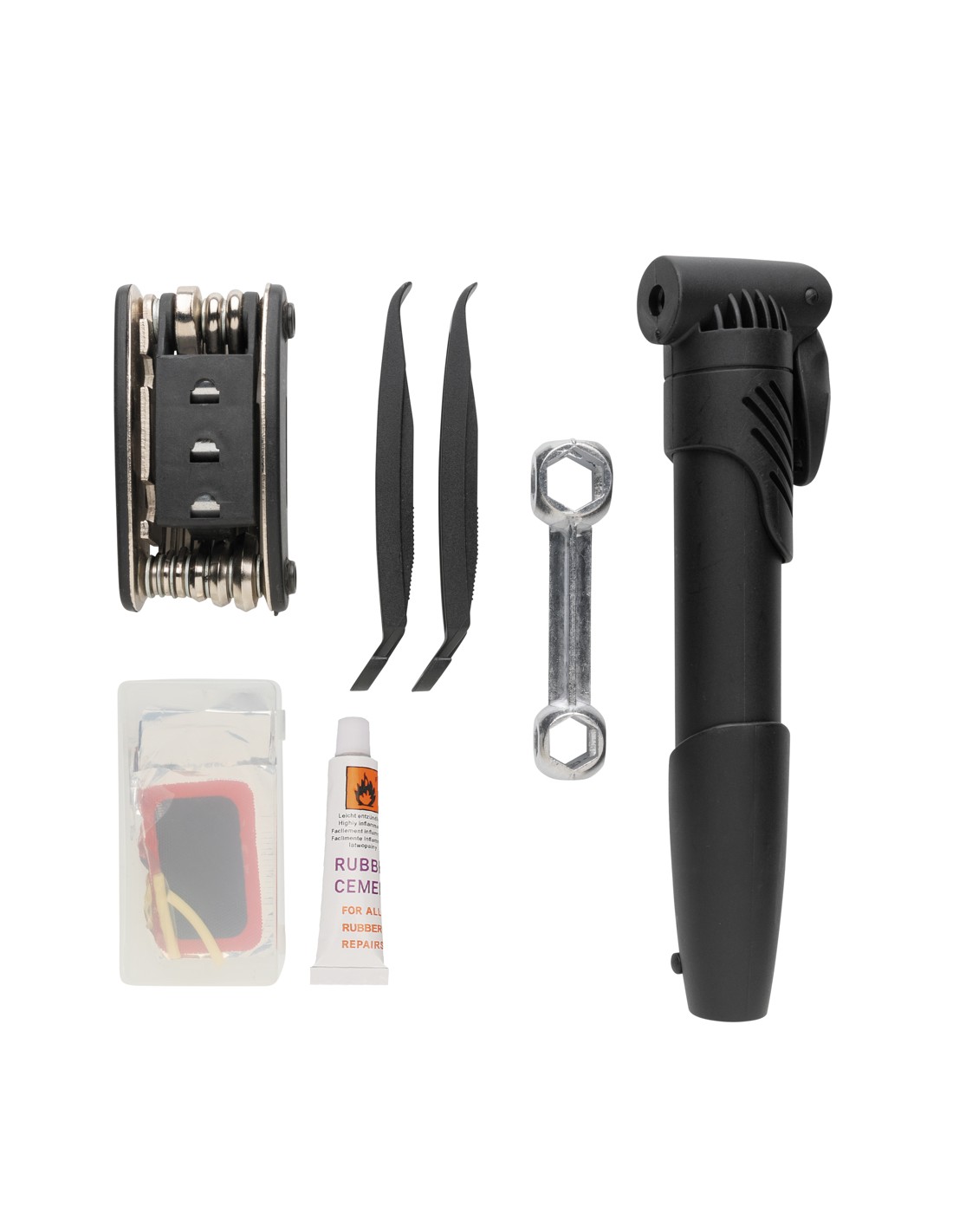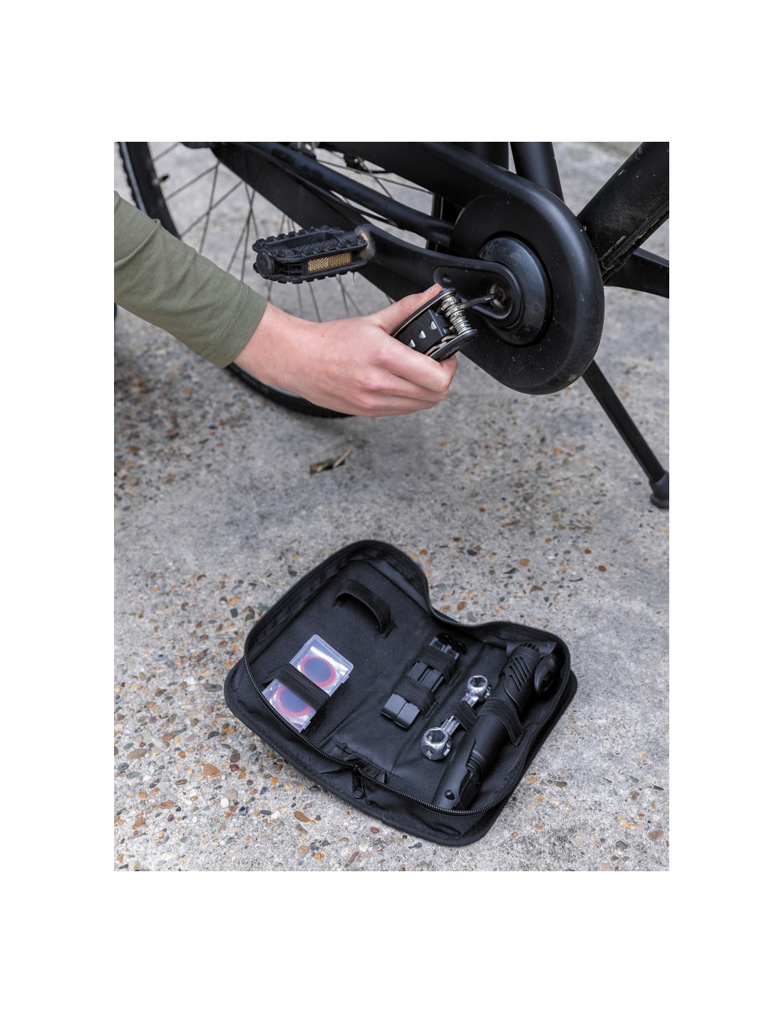 Bellissimo kit di riparazione bici in custodia 600D. Il set contiene 6 toppe di riparazione in gomma, 1 grattugia in banda stagnata, 2 tubi valvola in lattice, 1 colla, 2 leve in nylon, 1 chiave inglese in lega di alluminio, 1 multiutensile 16 in 1 in acciaio al carbonio, 1 pompa in nylon. La chiave 16 in 1 include: chiave esagonale da 2 mm/2,5 mm/3 mm/4 mm/5 mm/6 mm; chiave a bussola 8mm/9mm/10mm; cacciavite a taglio, cacciavite a croce, asta di prolunga con presa,; chiave piatta 8/10/15/mm, chiave per raggi/14GE.