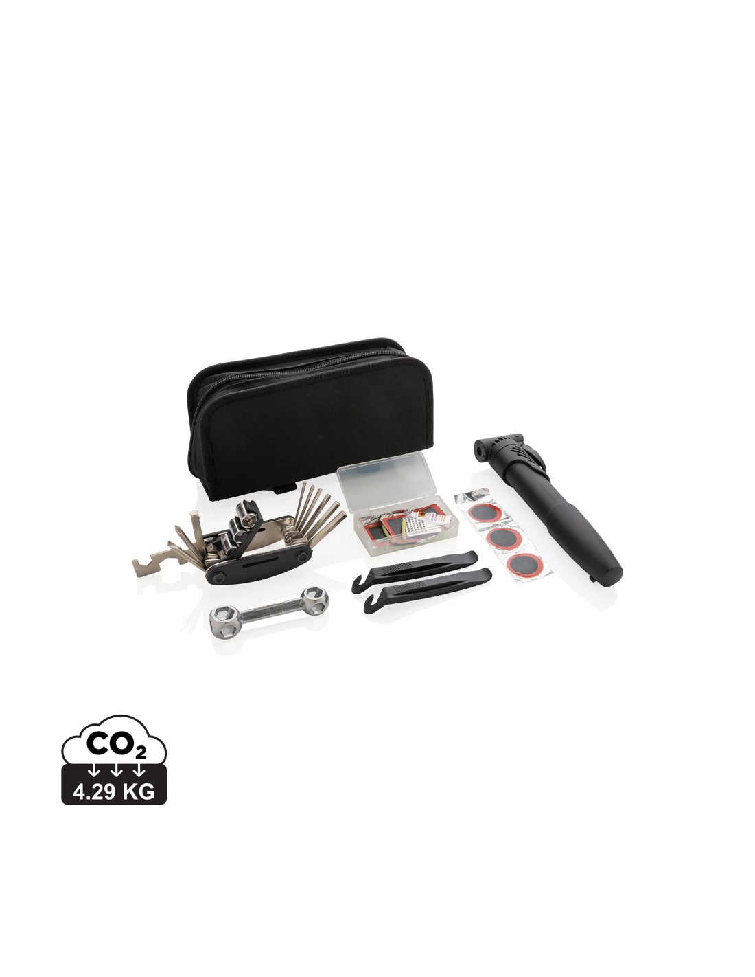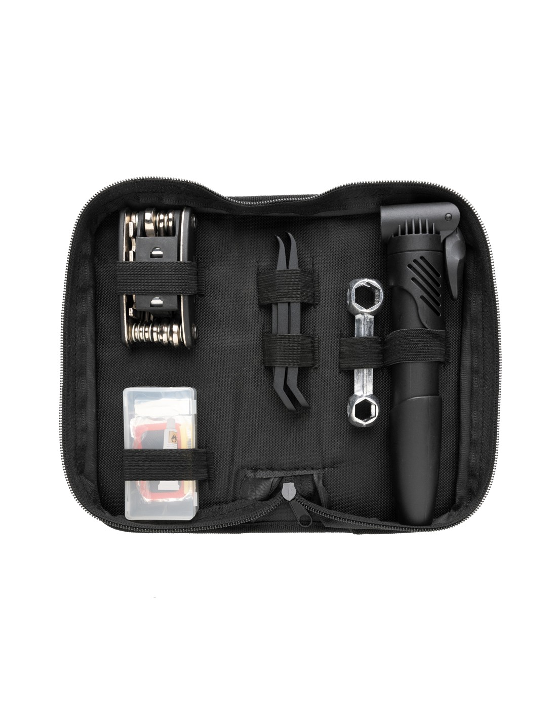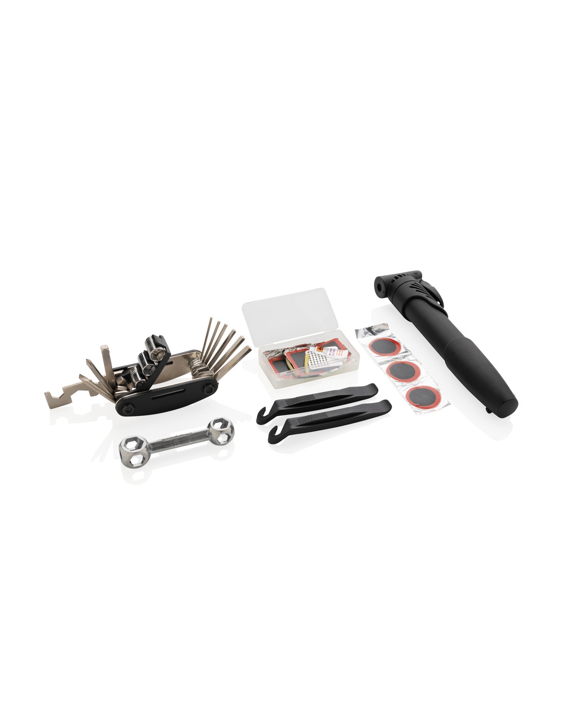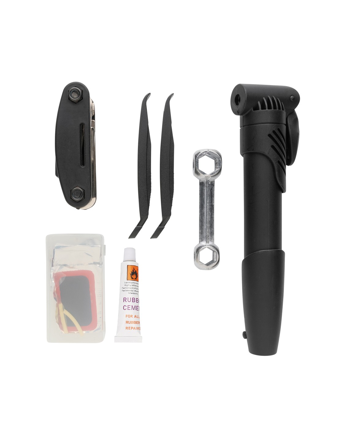 Bellissimo kit di riparazione bici in custodia 600D. Il set contiene 6 toppe di riparazione in gomma, 1 grattugia in banda stagnata, 2 tubi valvola in lattice, 1 colla, 2 leve in nylon, 1 chiave inglese in lega di alluminio, 1 multiutensile 16 in 1 in acciaio al carbonio, 1 pompa in nylon. La chiave 16 in 1 include: chiave esagonale da 2 mm/2,5 mm/3 mm/4 mm/5 mm/6 mm; chiave a bussola 8mm/9mm/10mm; cacciavite a taglio, cacciavite a croce, asta di prolunga con presa,; chiave piatta 8/10/15/mm, chiave per raggi/14GE.