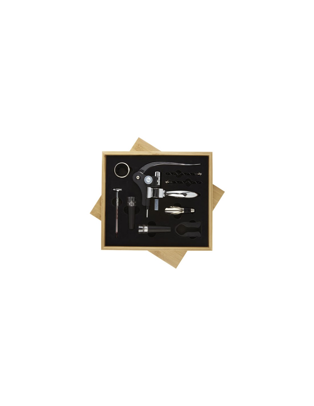 Set per vino composto da 9 pezzi con 1 cavatappi, 2 tappi, 1 versatore, 1 anello, 1 tagliacapsule, 1 termometro e 2 ricambi per cavatappi. Fornito in una confezione regalo in bambù di provenienza e produzione secondo standard sostenibili.