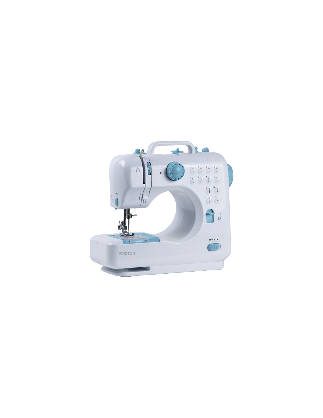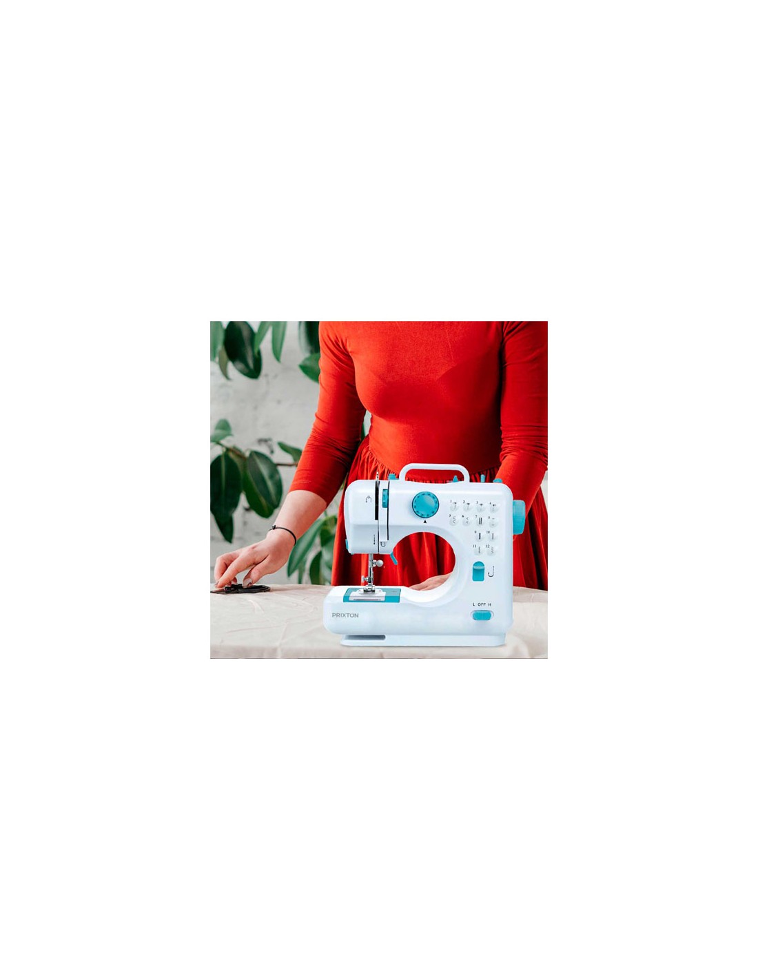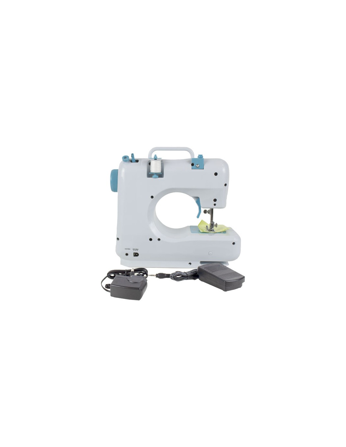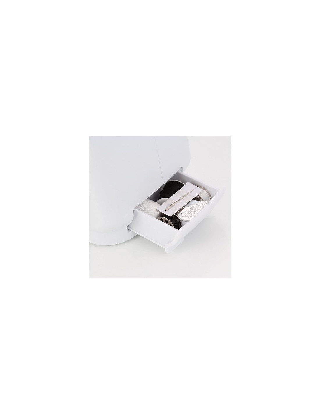 Macchina da cucire con 12 schemi di cucito incorporati. Cassetto integrato per riporre i fili, gli aghi e altri materiali. Luce per migliorare la visibilità mentre si cuce. Include il pedale e l'adattatore. Operazioni di cucito in avanti e indietro. La macchina si accende tramite l'interruttore manuale o il pedale. Può essere utilizzata collegandola a una presa di corrente oppure con le batterie (4 x AA). Regolatore di tensione. Manopola per la selezione. Tagliafilo. Volante avvolgimento spoletta.