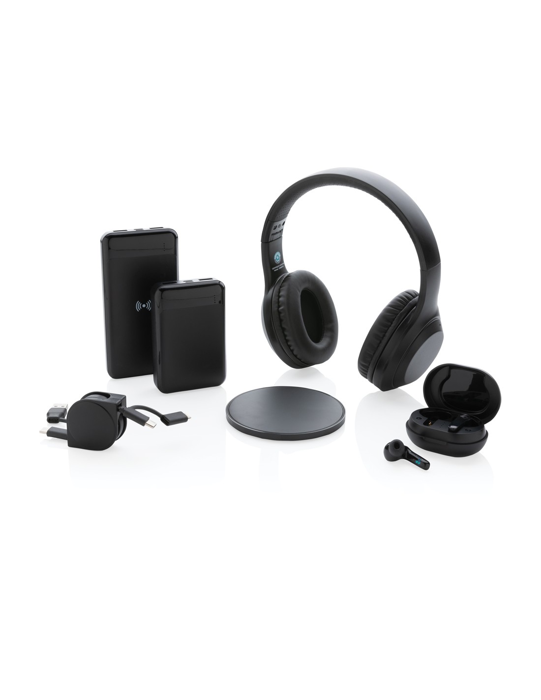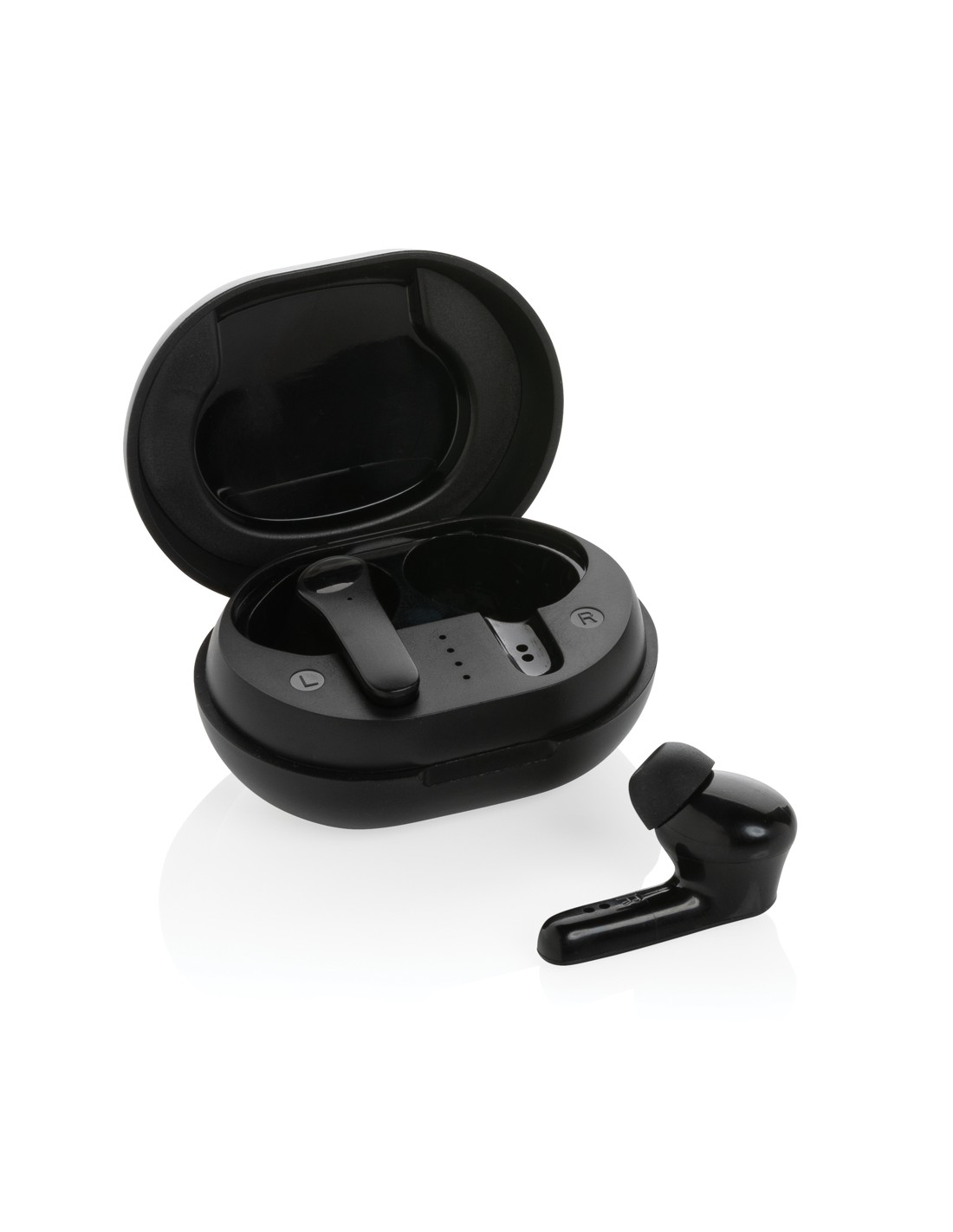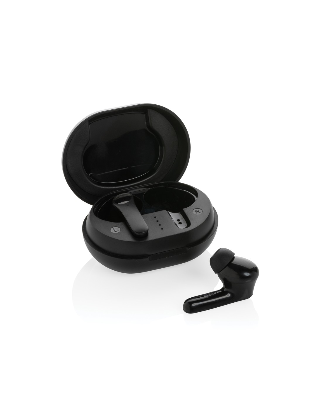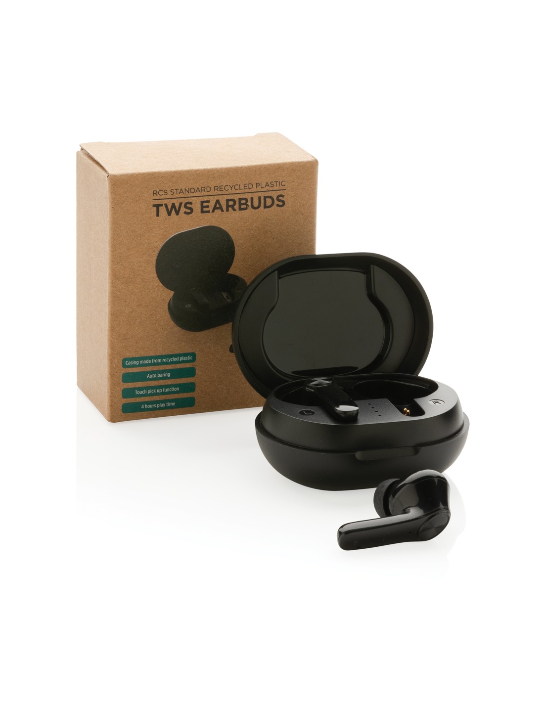 Auricolari TWS in cui l'auricolare e la custodia di ricarica sono realizzati in ABS riciclata certificata RCS. RCS (Recycled Claim Standard) è uno standard per verificare il contenuto riciclato di un prodotto lungo l'intera catena di fornitura. Contenuto totale riciclato: 67% in base al peso totale dell'articolo. RCS è lo standard che viene utilizzato quando una parte dell'articolo è stata realizzata con materiali riciclati. La cuffia wireless utilizza BT 5.0 per una connessione super fluida e un tempo di riproduzione di lunga durata. La batteria da 40 mAh per batteria consente un tempo di riproduzione fino a 4 ore e può essere completamente ricaricata nella custodia di ricarica da 300 mAh in 1,5 ore. Distanza operativa fino a 10 metri. Con microfono e funzione touch di risposta alle chiamate.Articolo e accessori non contengono PVC. Includono cavo di ricarica in materiale TPE riciclato senza PVC.