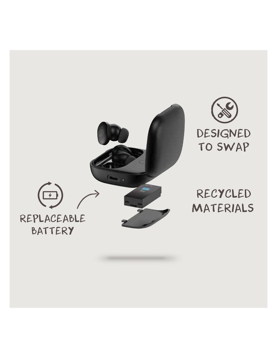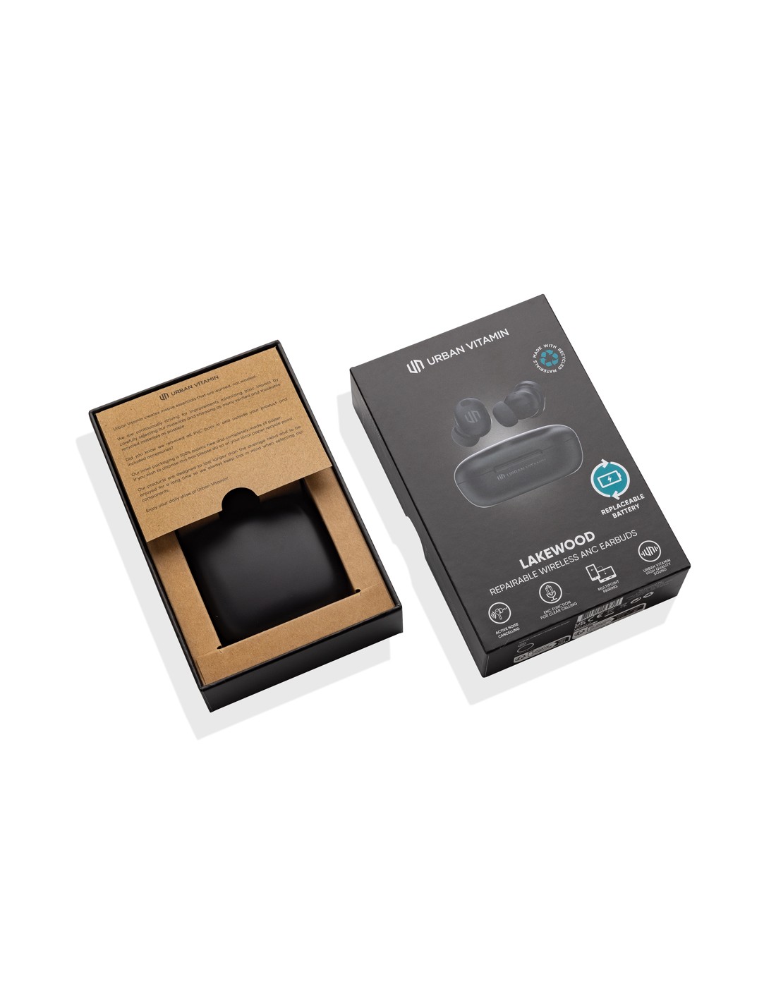 Vi presentiamo il futuro in cui gli oggetti durano più a lungo e sono progettati per essere facilmente riparati. Gli auricolari Lakewood offrono una qualità audio Hi-Fi di alto livello. Con ANC di alta qualità (32 DB) e modalità ENC per chiamate super nitide. Dotati di 6 microfoni e di assistente vocale per migliorare ulteriormente la qualità delle chiamate. La funzione ANC può anche essere commutata in modalità neutra. L'alloggiamento di Lakewood è progettato con una batteria rimovibile che può essere facilmente sostituita quando necessario per prolungare la durata degli auricolari. Modalità di connessione doppia per collegare più dispositivi. Lakewood offre 6 ore di ascolto con una sola carica e altre 20 ore con la custodia. Gli auricolari hanno una classificazione IPX5, che li rende resistenti alle intemperie e adatti allo sport. Oltre a essere riparabili, gli auricolari sono realizzati con plastica PC riciclata. Contenuto totale di materiale riciclato: 36% in base al pesp totale.
