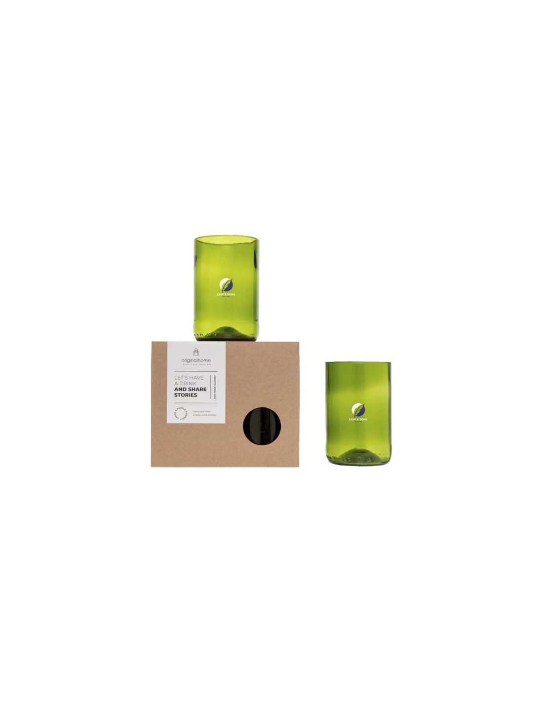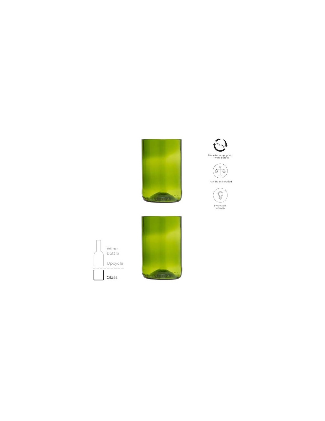 Set di due bicchieri da 280 ml realizzati a mano con bottiglie di vino riciclate creativamente provenienti da Zanzibar, in Tanzania. Le bottiglie di vino vengono raccolte da hotel, ristoranti e bar, quindi vengono selezionate, pulite e tagliate in forme e dimensioni diverse. Questi bicchieri si adattano perfettamente a qualsiasi tipo di bevanda e sono ideali sia per l'uso quotidiano che per le occasioni speciali. Forniti in una confezione regalo.