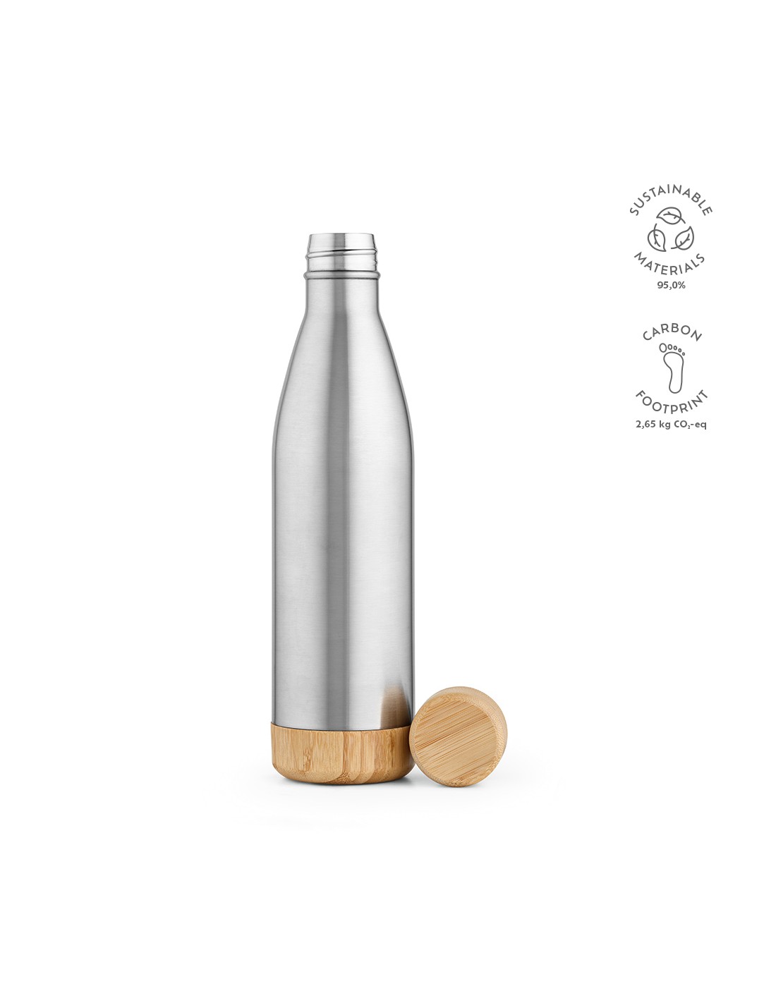 Borraccia Congo 780ml (750ml netti) in acciaio inox riciclato con tappo e fondo in bambù. L’isolamento a doppia parete mantiene le bevande calde per 14 ore e fredde per 48 ore. A tenuta stagna. Confezionata singolarmente in scatola kraft.