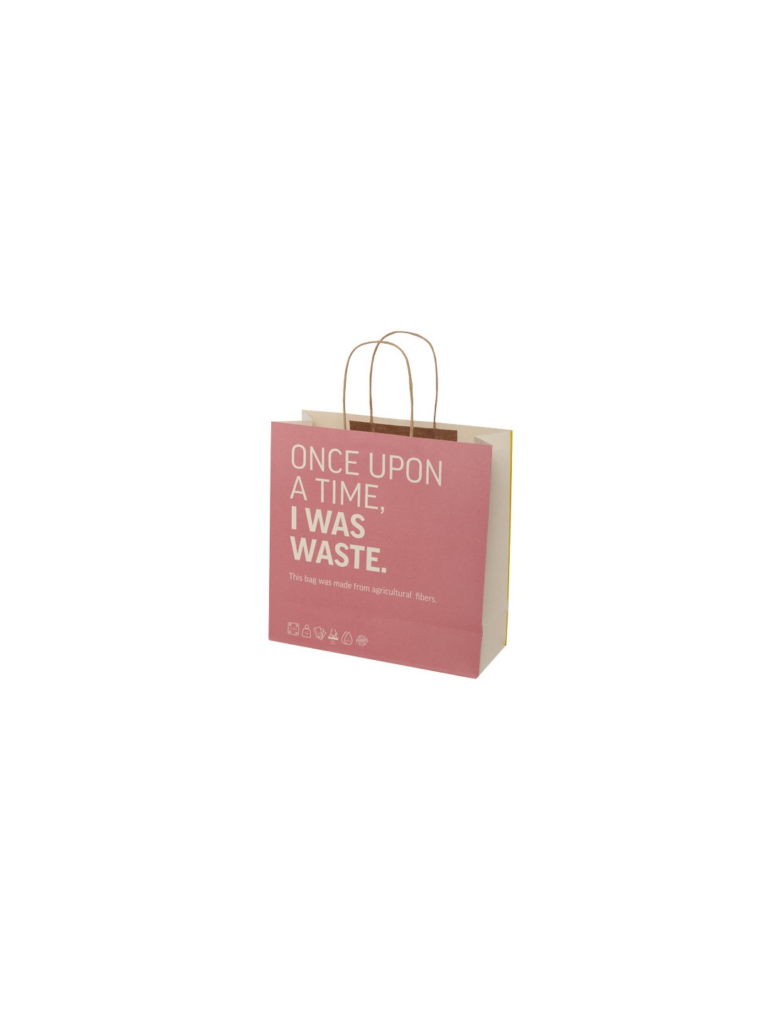 Shopper in carta extra large da 150 g/m² (31 x 12 x 31 cm) realizzato con scarti agricoli e caratterizzato da manici di carta intrecciati. La parte anteriore e posteriore personalizzabili offrono un ampio spazio per stampare un logo o qualsiasi altro design, rendendolo un ottimo strumento di marketing aziendale. Realizzato in Europa e riciclabile al 100%, questo sacchetto è una scelta più sostenibile per aziende e persone attente all'ambiente in cerca di una soluzione per il confezionamento sostenibile.