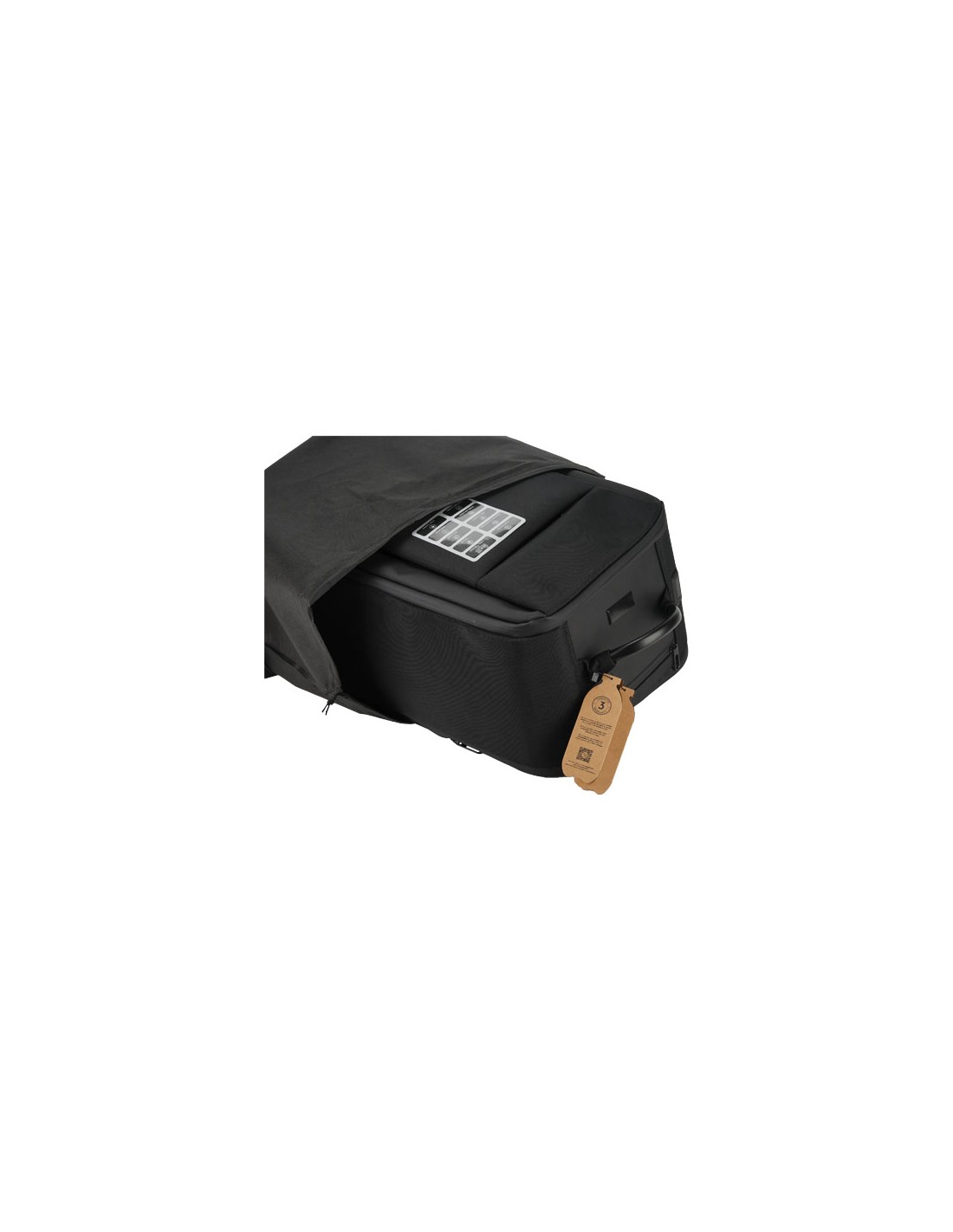 Zaino trolley per portatili convertibile (55 x 34 x 22 cm) in tessuto impermeabile 1680D realizzato in PET riciclato (equivalente a 31 bottiglie riciclate). Grazie alla struttura indeformabile e all'imbottitura inferiore, protegge perfettamente gli oggetti riposti al suo interno. Presenta uno scomparto imbottito per portatili o tablet, una maniglia in metallo e un power bank rimovibile per la sicurezza aeroportuale. È anche dotato di una tasca di sicurezza con protezione RFID e di un lucchetto per mantenere gli oggetti al sicuro. Da una tasca sul retro si estraggono gli spallacci che convertono il trolley in uno zaino. È inoltre dotato di un power bank a ricarica rapida da 10.000 mAh e di un cavo di ricarica luminoso in PET riciclato. Tramite il cavo, il power bank può essere caricato direttamente con il connettore USB/Android all'esterno dello zaino (senza la necessità di rimuoverlo). La personalizzazione può essere effettuata sul pannello anteriore e su un lato del cavo 3 in 1 in PET riciclato. Fornito con una custodia.