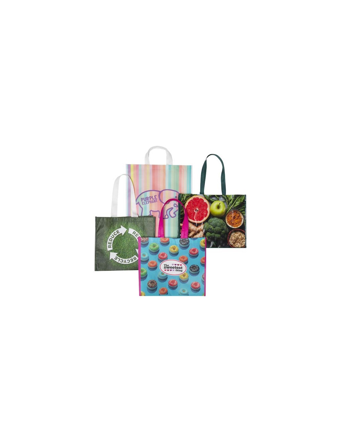 Confezione di tote bag laminate assortite con 4 dimensioni diverse: Tote laminata in tessuto PET riciclato da 140 g/m² (36 x 32 x 12 cm), tote laminata in tessuto non tessuto da 120 g/m² (40 x 45 x 17 cm), tote laminata in tessuto non tessuto da 120 g/m² (40 x 35 x 20 cm) e tote laminata in tessuto da 140 g/m² (42 x 32 x 16 cm).