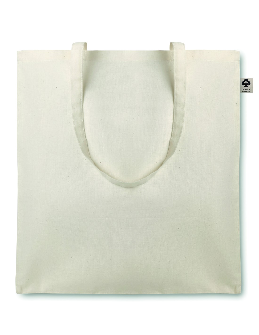 Shopper in cotone organico con manici lunghi. 105 gr / m². Questo prodotto è certificato OEKO-TEX® STANDARD 100.