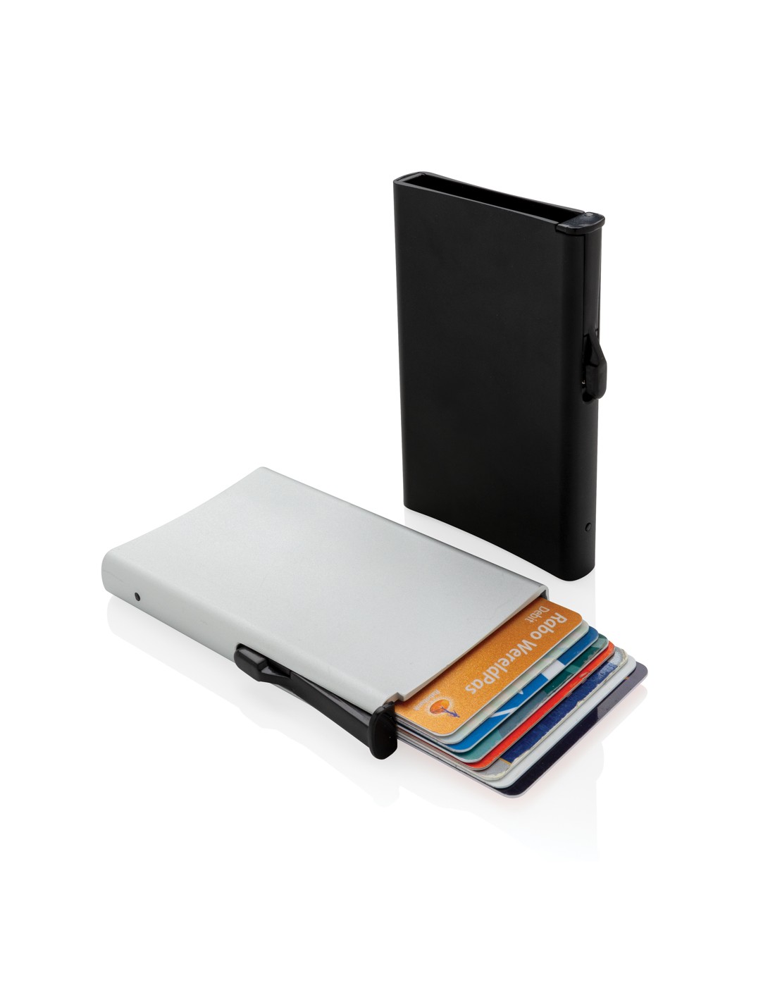 Questo porta carte ultra fine, super leggero e con la sicurezza RFID ha un design moderno. Blocca i tentativi di furto dei tuoi dati. Ha quattro fessure porta carte che ne possono contenere fino a 8. Design registrato®. Blocco della tecnologia NFC (13,56 MHz).