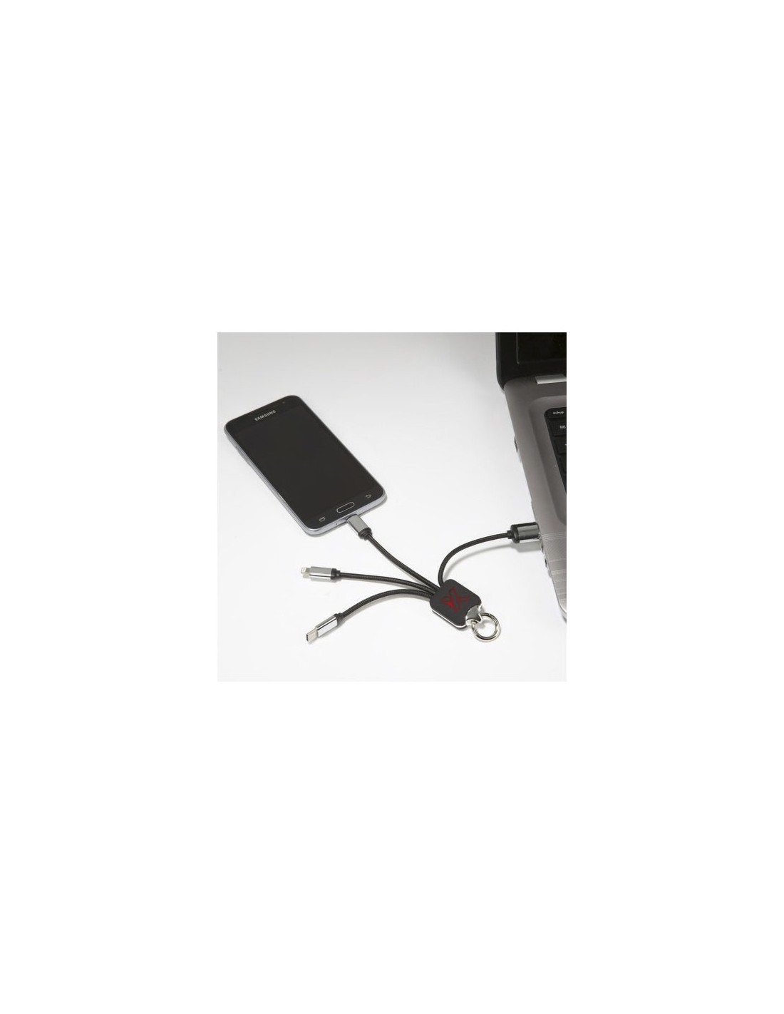 Cavo di ricarica 5 in 1 in PET riciclato con logo luminoso e stazione di ricarica in bambù da 10 W. Dispone di 3 connettori (tipo C, micro USB, iPhone) e di un connettore USB doppio per uso universale. Fornito in un astuccio in TPU, con un biglietto in carta kraft. Lunghezza del cavo: 1 metro....