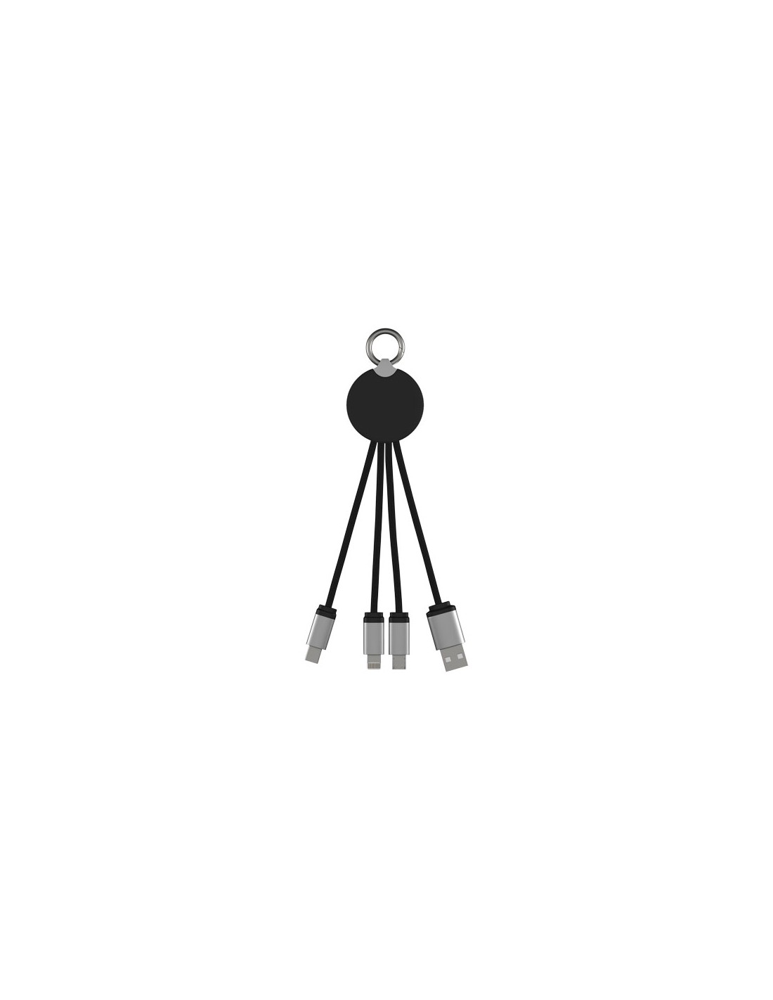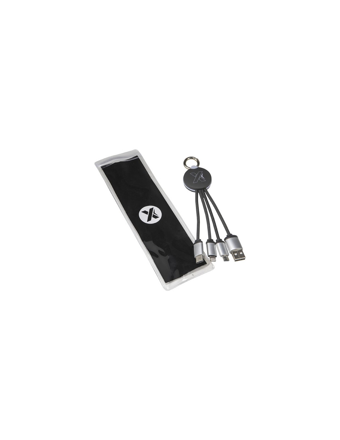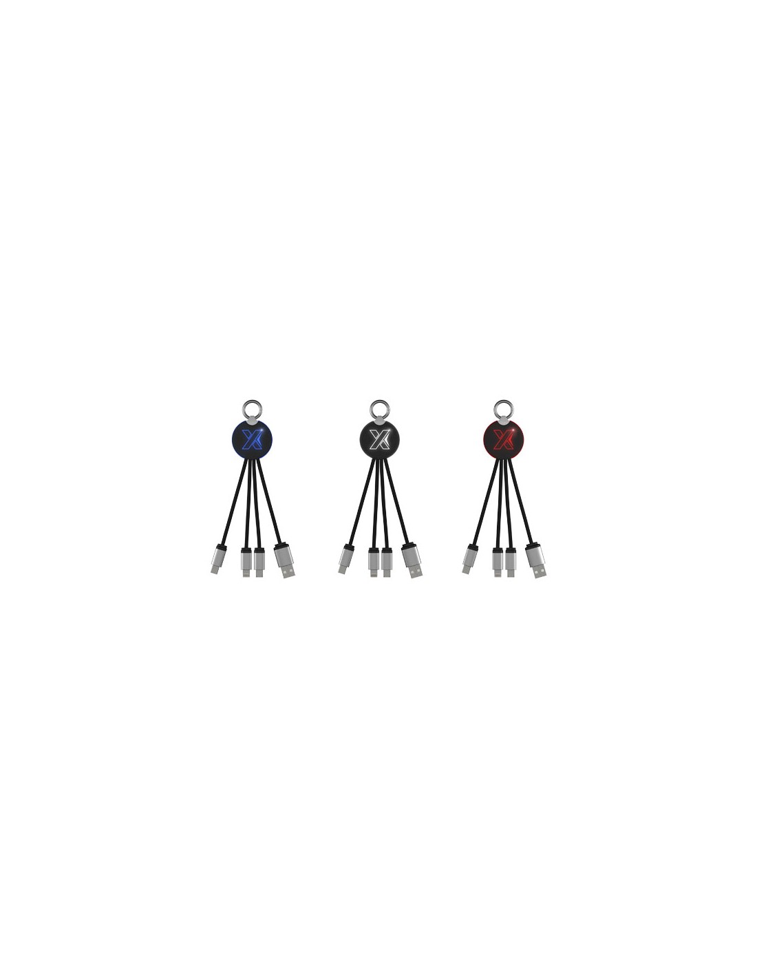 Cavo di ricarica con logo luminoso, finitura in gomma e dotato di tre connettori (tipo C, Android, iPhone). È possibile caricare fino a tre dispositivi contemporaneamente. Lunghezza dei cavi (spine incluse): 10 cm. Cavo in plastica PET riciclata ed'imballaggio realizzato in carta e plastica riciclata.