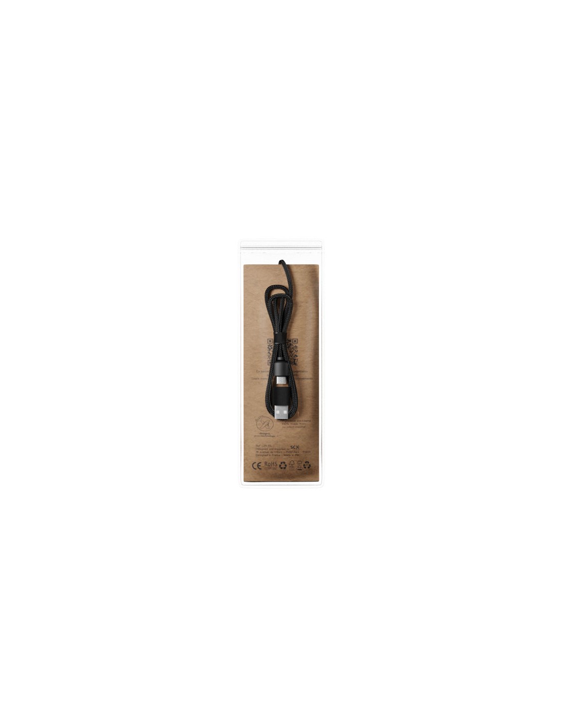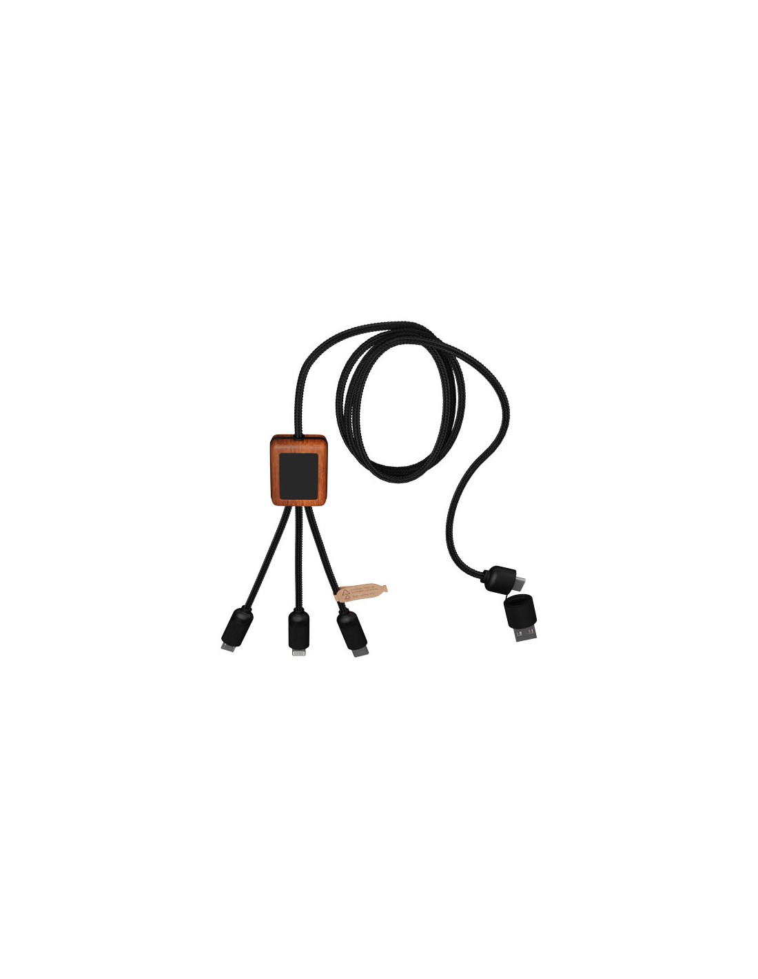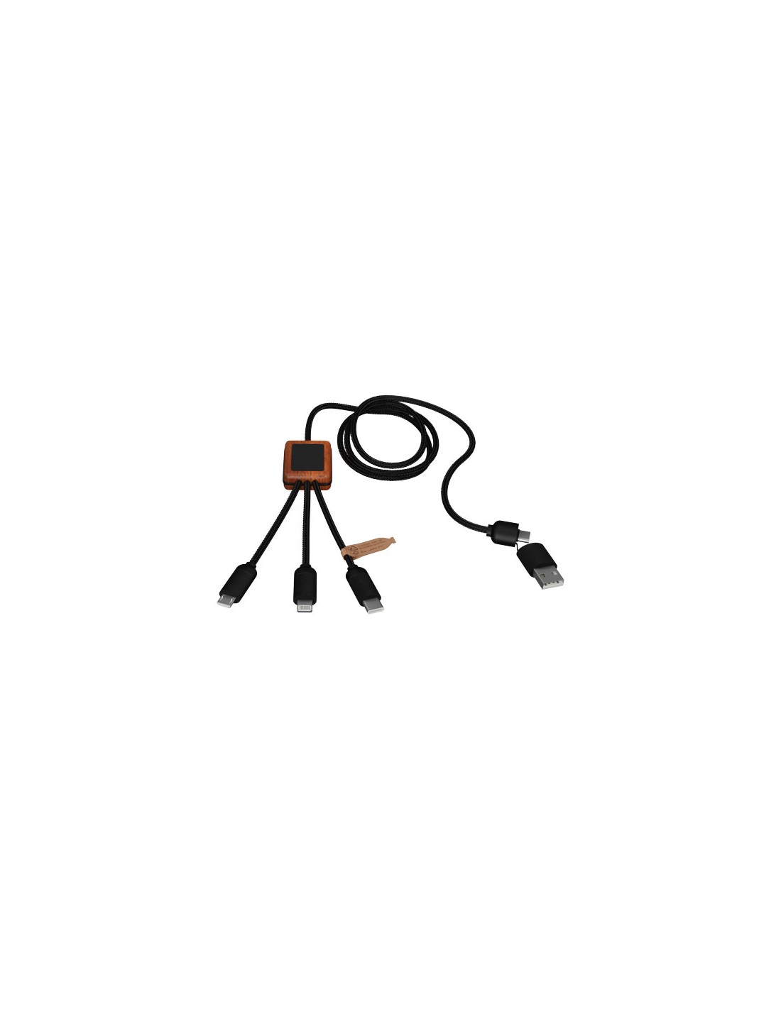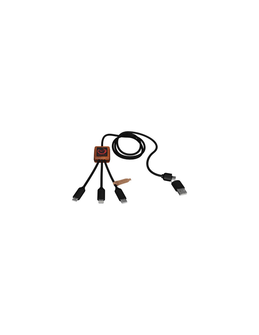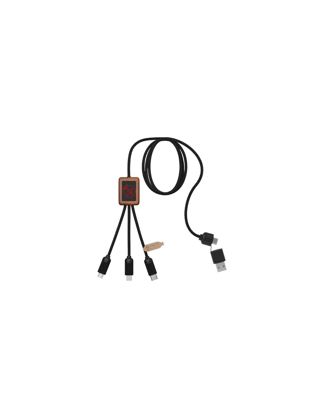Cavo di ricarica 5 in 1 in PET riciclato con logo luminoso e stazione di ricarica in bambù da 10 W. Dispone di 3 connettori (tipo C, micro USB, iPhone) e di un connettore USB doppio per uso universale. Fornito in un astuccio in TPU, con un biglietto in carta kraft. Lunghezza del cavo: 1 metro....