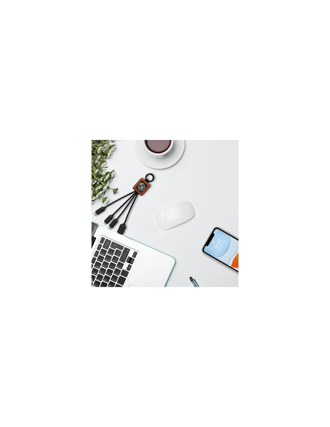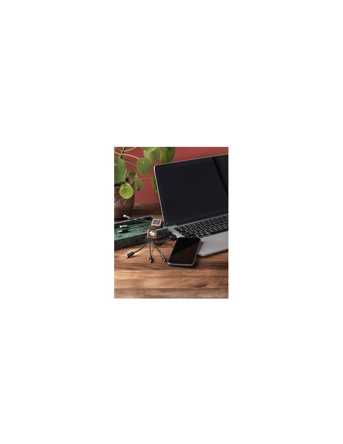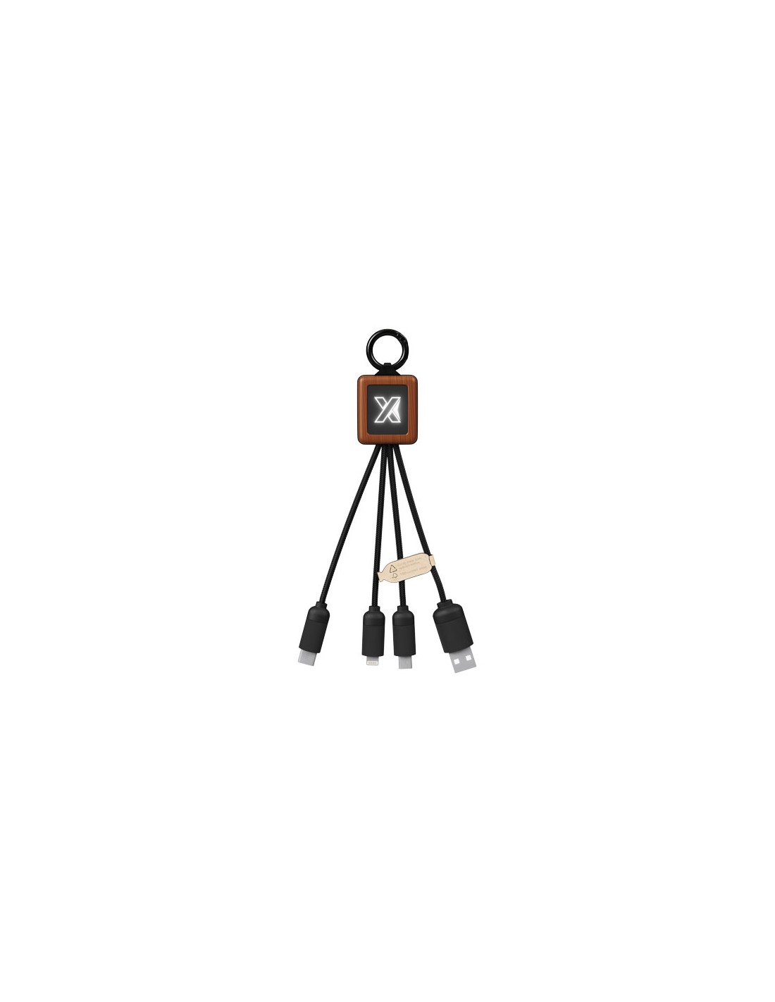 Cavo 3 in 1 da 20 W in legno con logo luminoso e 3 connettori (tipo C/micro USB/iPhone), e cavi realizzati in plastica PET riciclata. Il cavo può caricare fino a 3 dispositivi contemporaneamente. Brevetto EUIPO EUROPA.