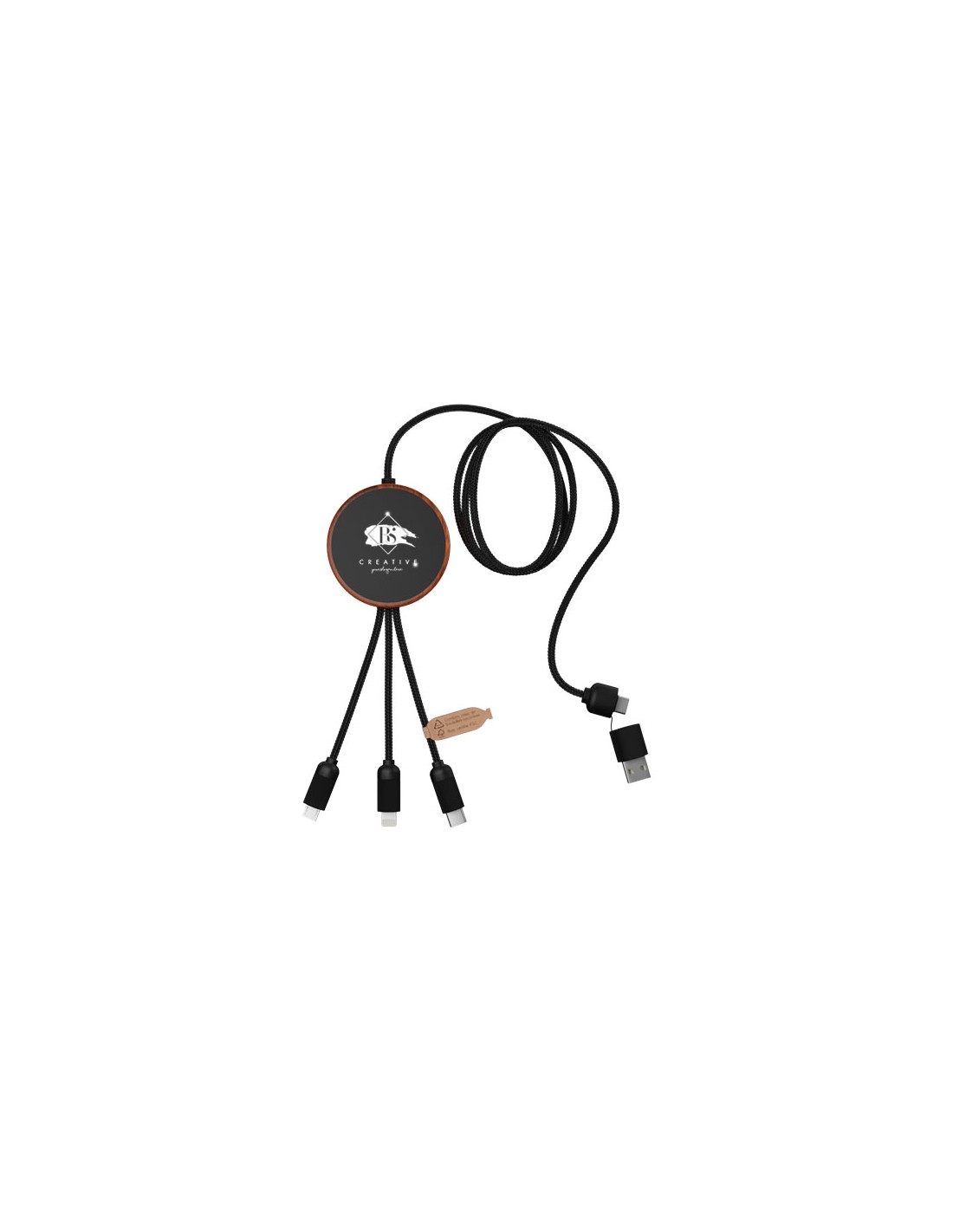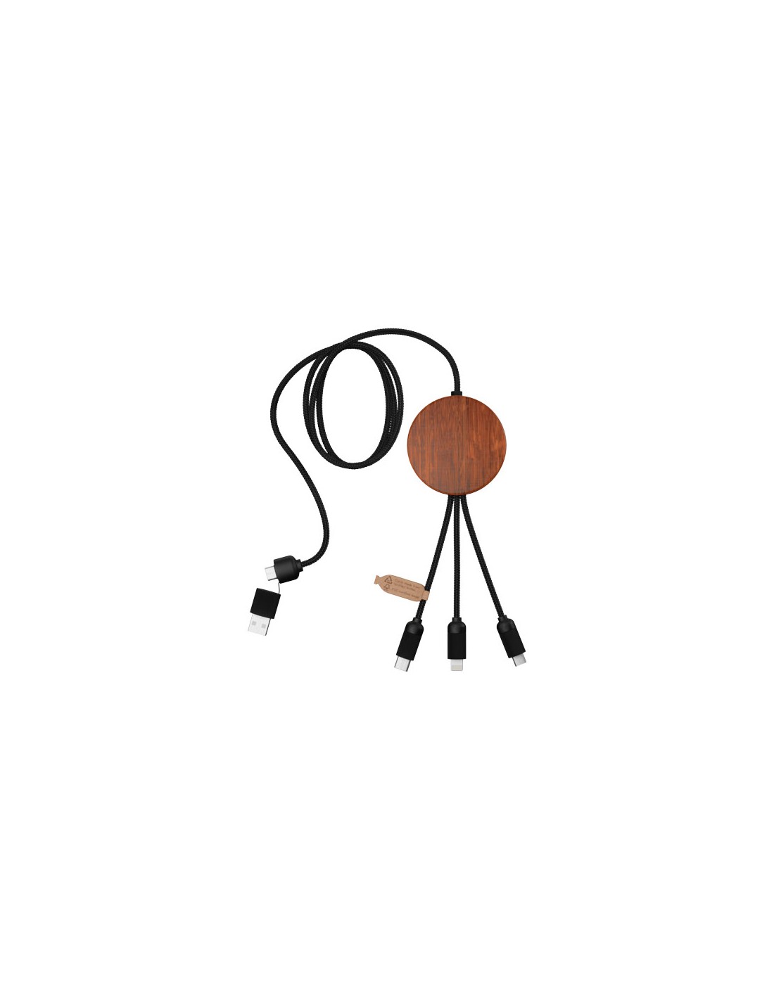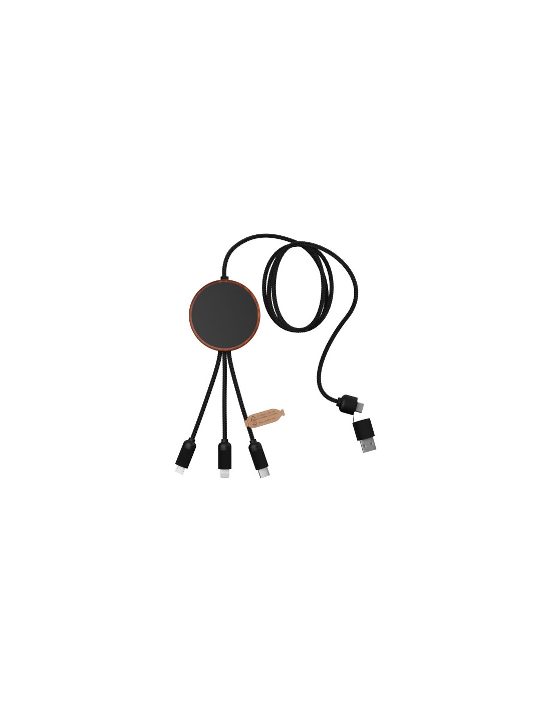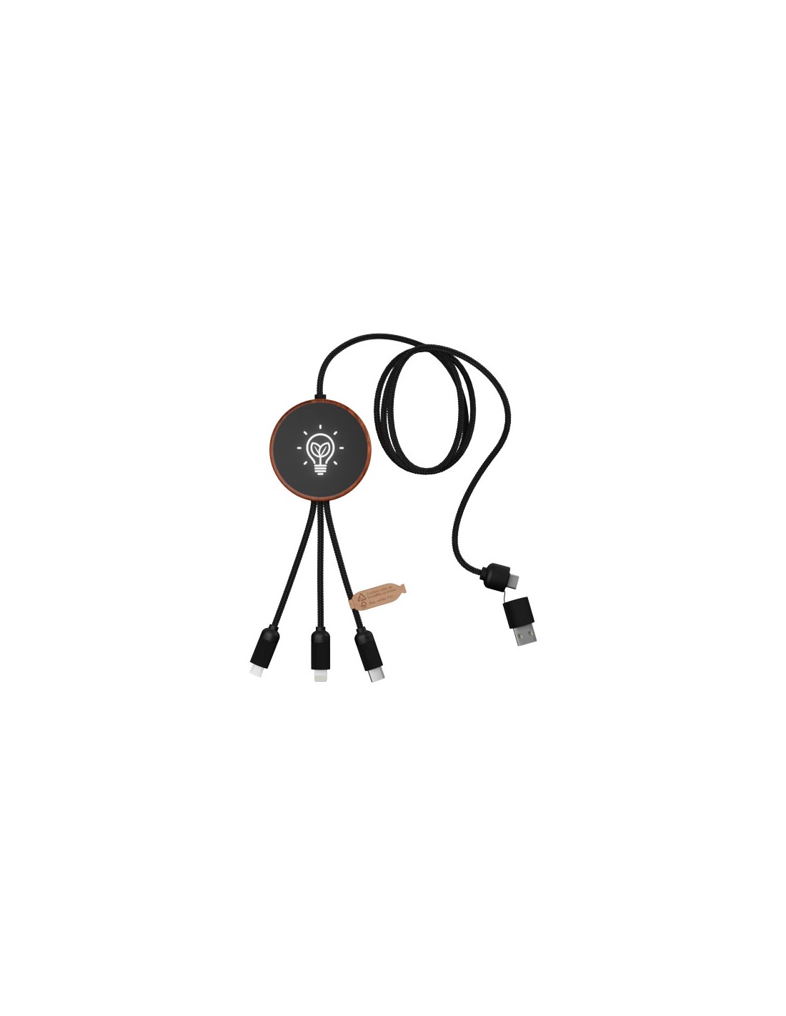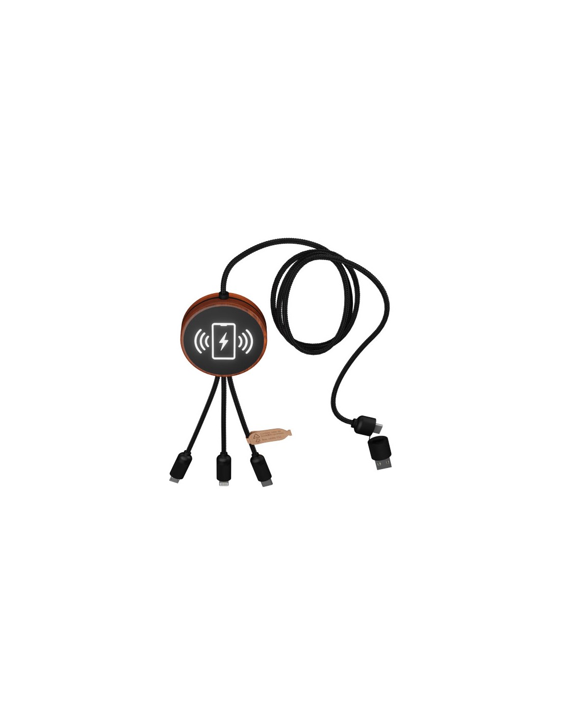 Cavo di ricarica 5 in 1 in PET riciclato con logo luminoso e stazione di ricarica in bambù da 10 W. Dispone di 3 connettori (tipo C, micro USB, iPhone) e di un connettore USB doppio per uso universale. Fornito in un astuccio in TPU, con un biglietto in carta kraft. Lunghezza del cavo: 1 metro. Garanzia di 3 anni inclusa.
