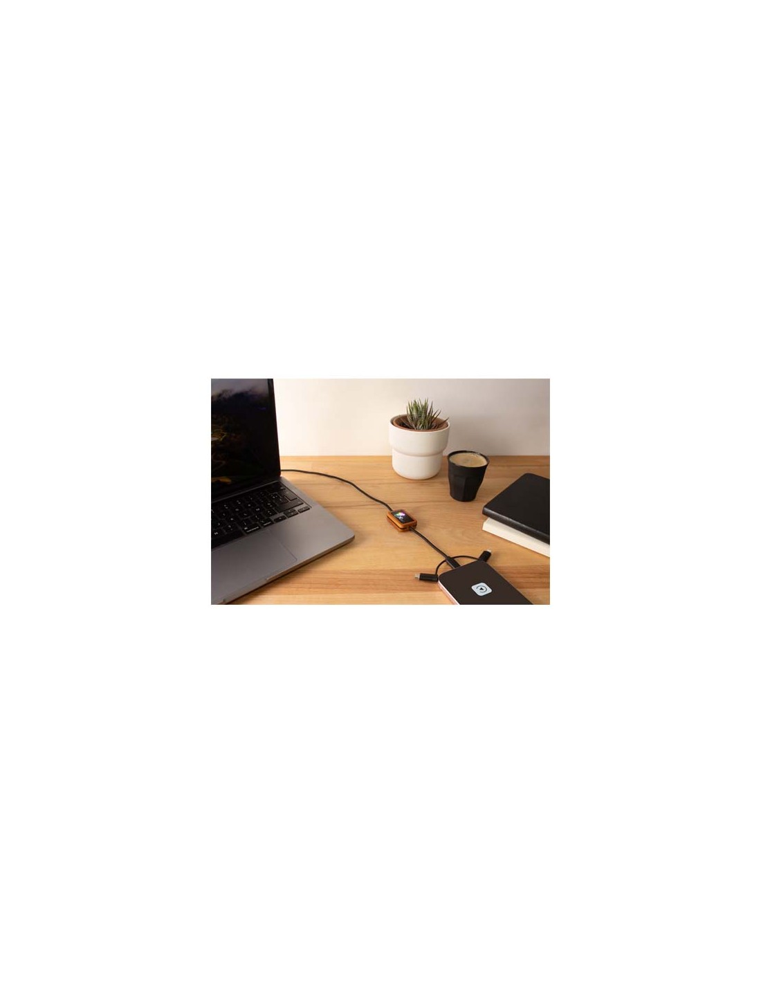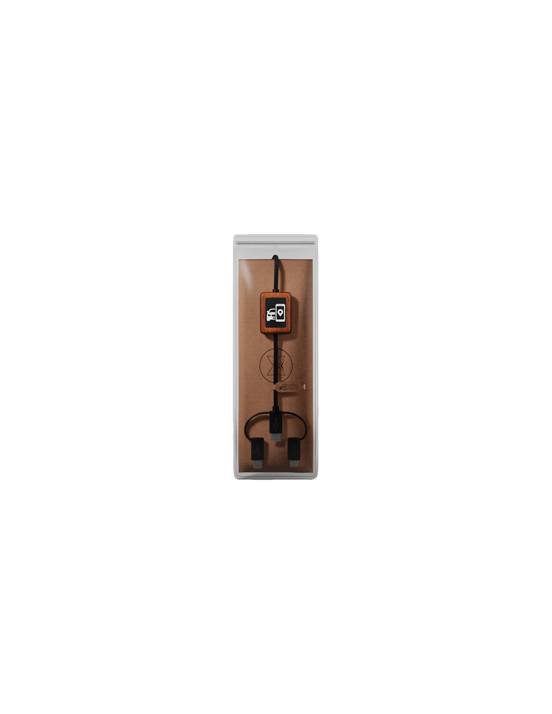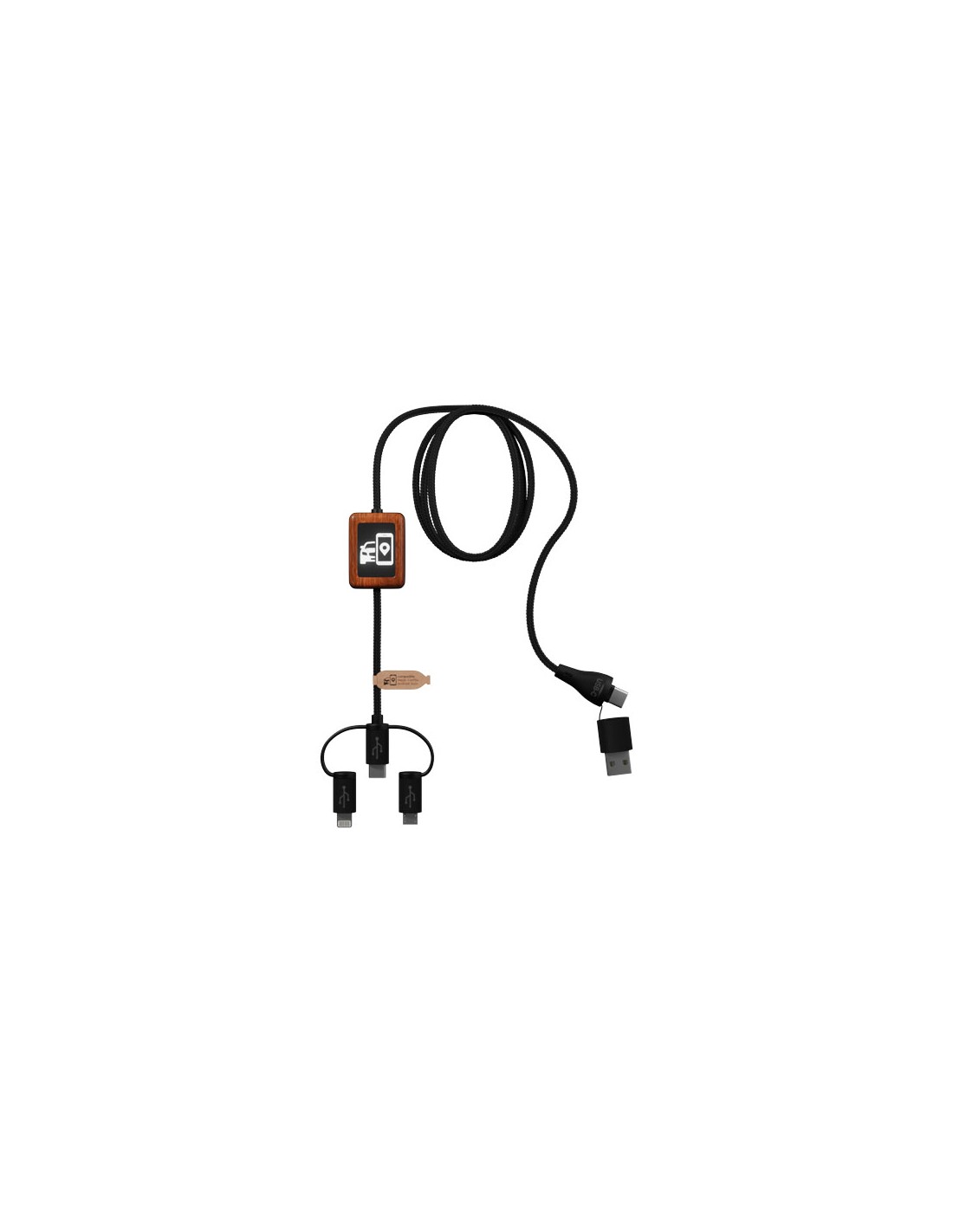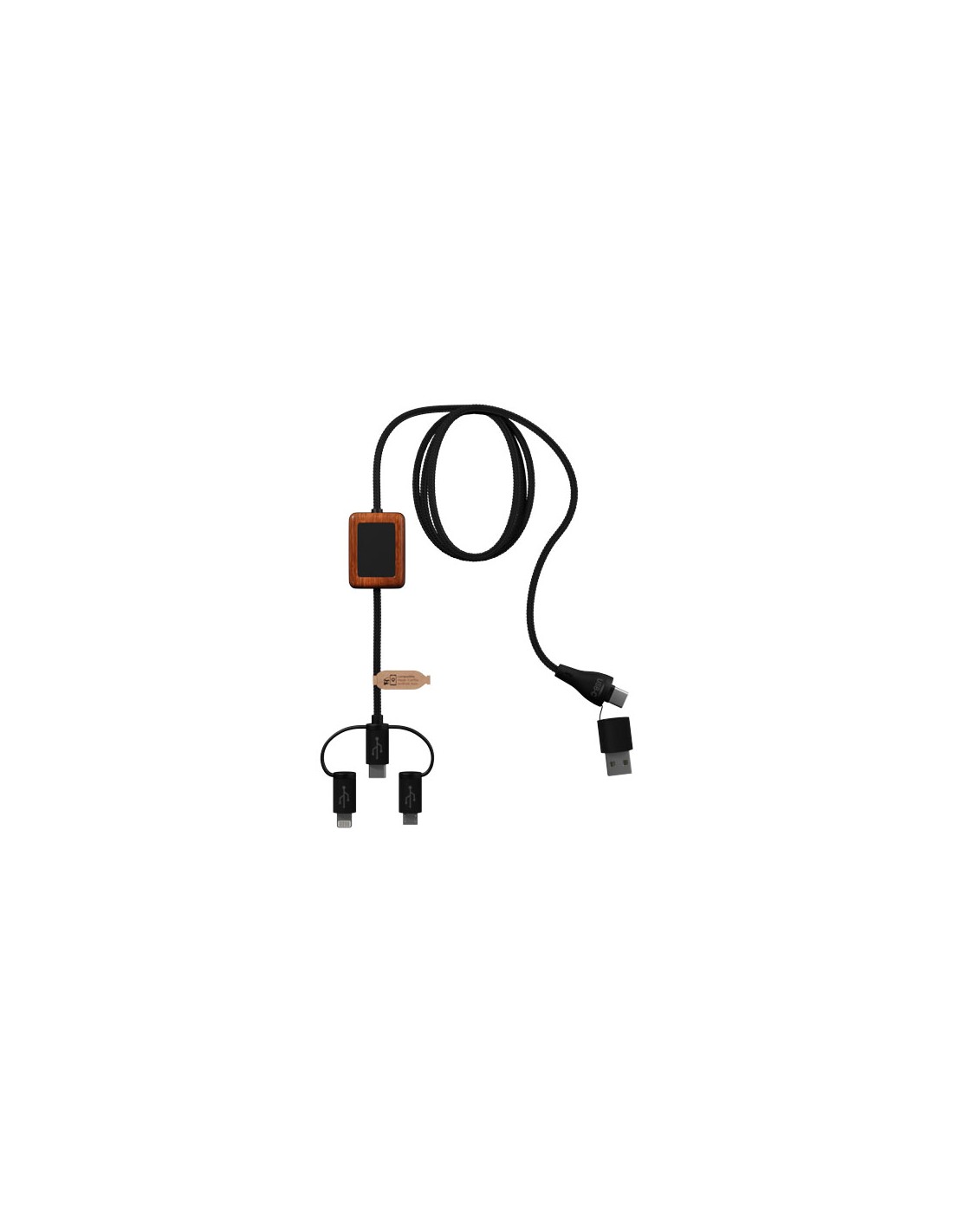 Cavo di ricarica in gomma dalla finitura in bambù con trasferimento dati e doppio logo luminoso. Il cavo è realizzato con materiali sostenibili: plastica ABS riciclata e bottiglie in rPET riciclato. Si può utilizzare con Apple CarPlay e Android Auto per le app auto. Grazie alla sua doppia uscita USB-A + USB-C, il cavo è compatibile con i computer più recenti presenti sul mercato (USB-C). Il cavo può essere personalizzato con due loghi luminosi (uno su ogni lato). Lunghezza del cavo: 1 metro. Fornito in un astuccio in TPU (17,5 x 5,5 cm) e un biglietto di carta. Garanzia di 3 anni inclusa.