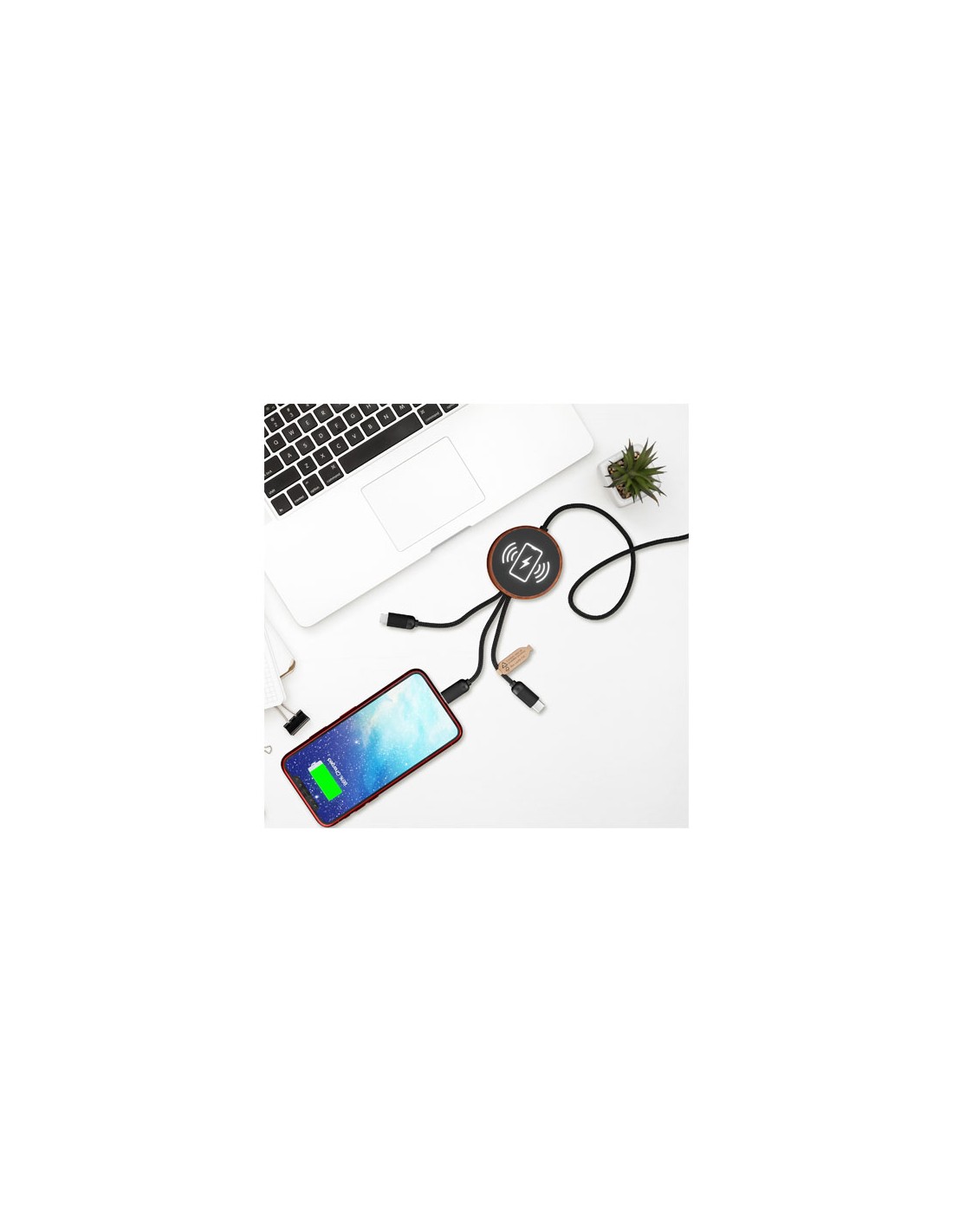 Cavo di ricarica 5 in 1 in PET riciclato con logo luminoso e stazione di ricarica in bambù da 10 W. Dispone di 3 connettori (tipo C, micro USB, iPhone) e di un connettore USB doppio per uso universale. Fornito in un astuccio in TPU, con un biglietto in carta kraft. Lunghezza del cavo: 1 metro. Garanzia di 3 anni inclusa. Questo articolo può essere stampato anche con la stampa digitale, che ti permette di aggiungere un logo luminoso a colori sull'area designata.