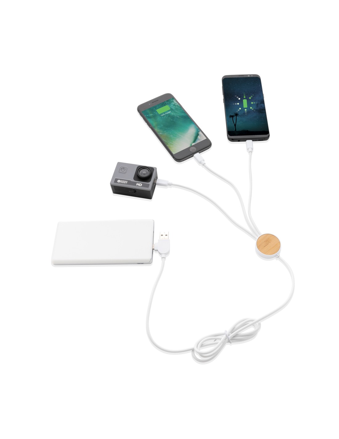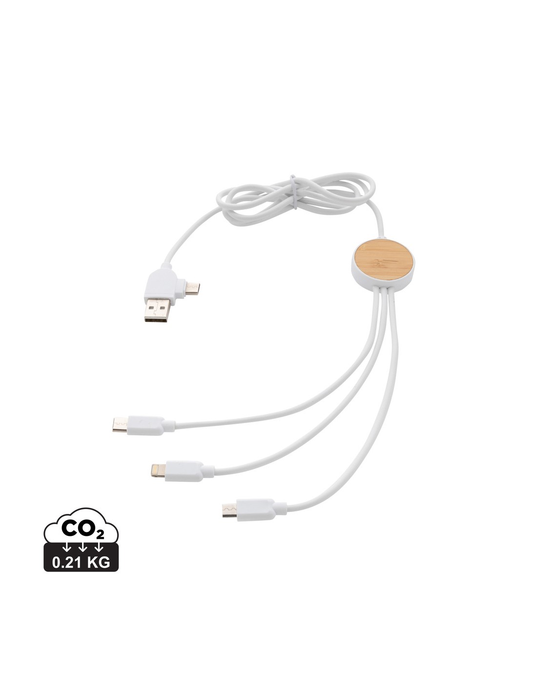 Cavo multiplo lungo 120 cm realizzato con materiali riciclati certificati. Viene fornito con 5 diversi connettori: input USB C, USB A, output type C, output IOS e micro USB. Ciò consente di utilizzare il cavo anche con dispositivi con output type C come la nuova generazione di smartphone e computer MacBook. Il cavo ha anche una porta USB A in modo che possa caricare qualsiasi dispositivo da qualsiasi sorgente. Struttura in bambù FSC® e ​​ABS certificato RCS. I cavi sono in TPE certificato RCS al 100%. Contenuto totale riciclato: 62% in base al peso totale dell'articolo. Lunghezza massima del cavo: 120 cm. Confezionato in busta kraft FSC® mix. Senza PVC.