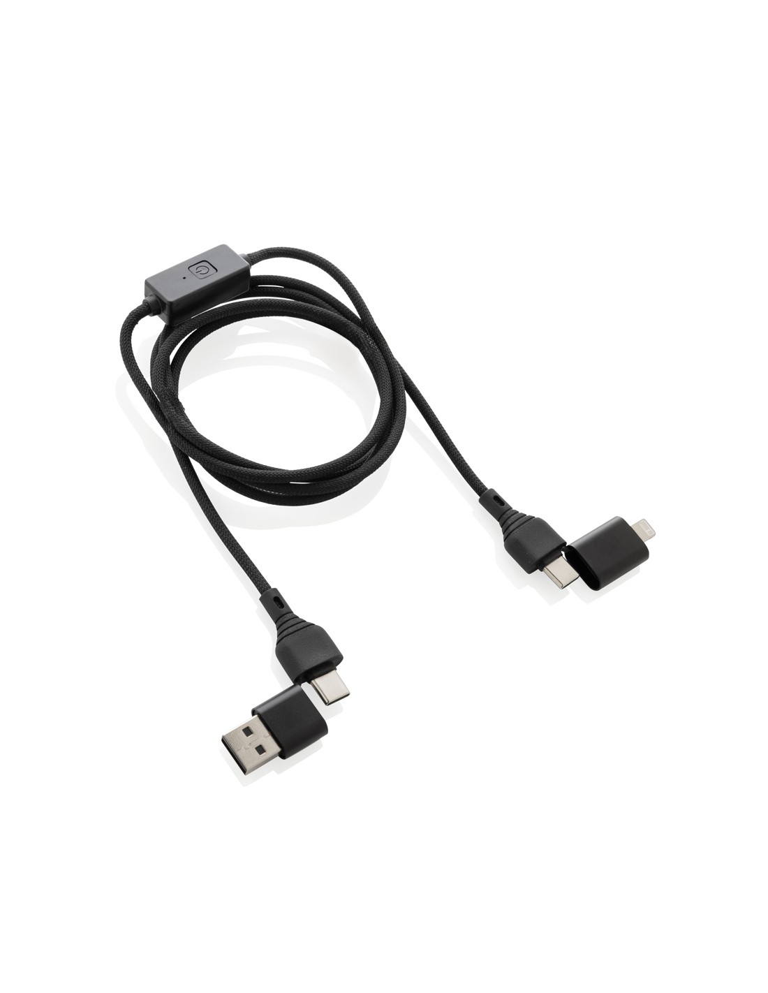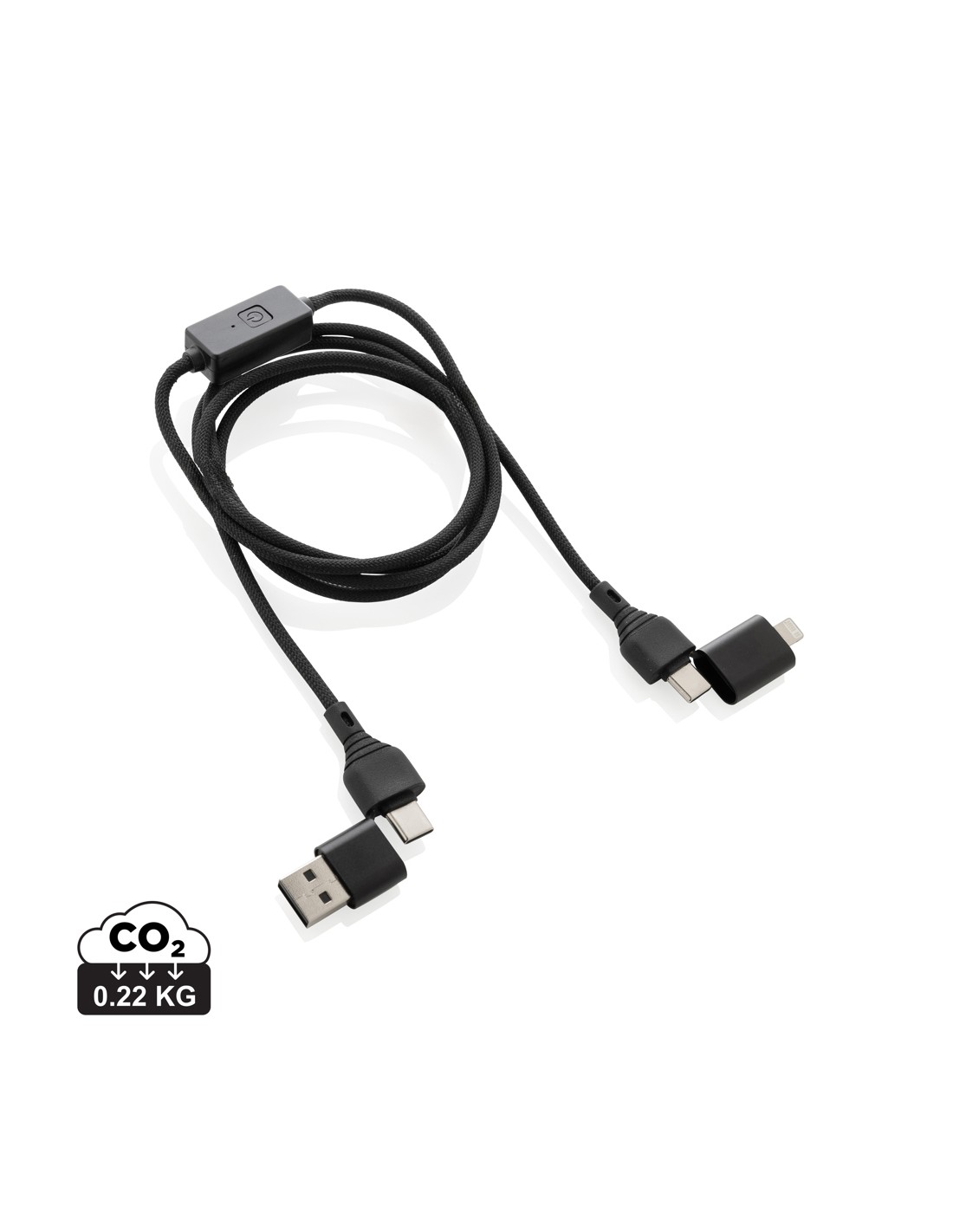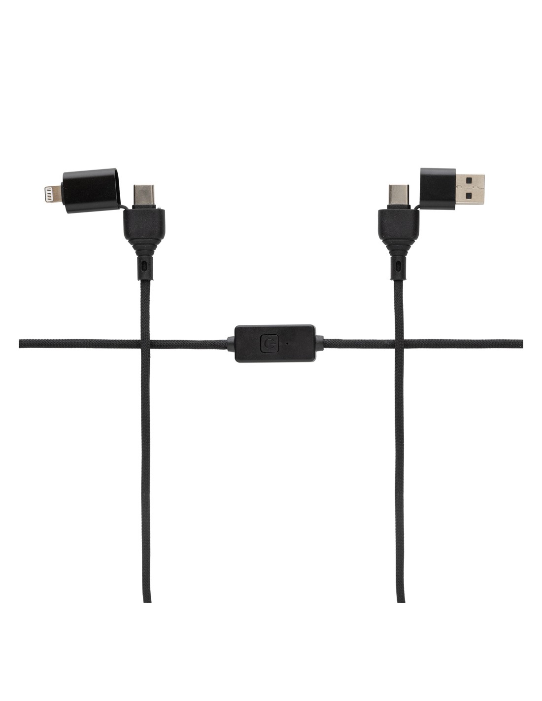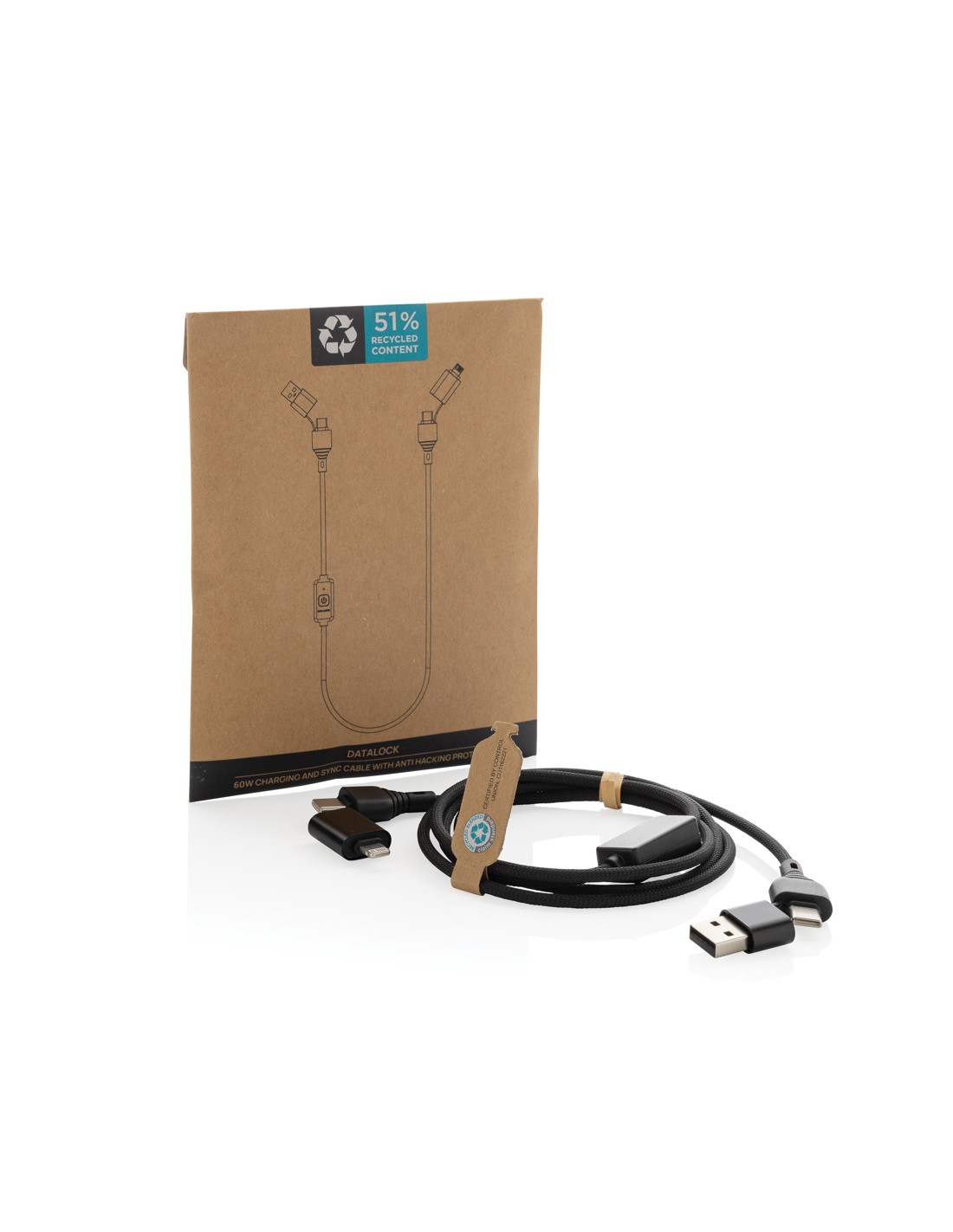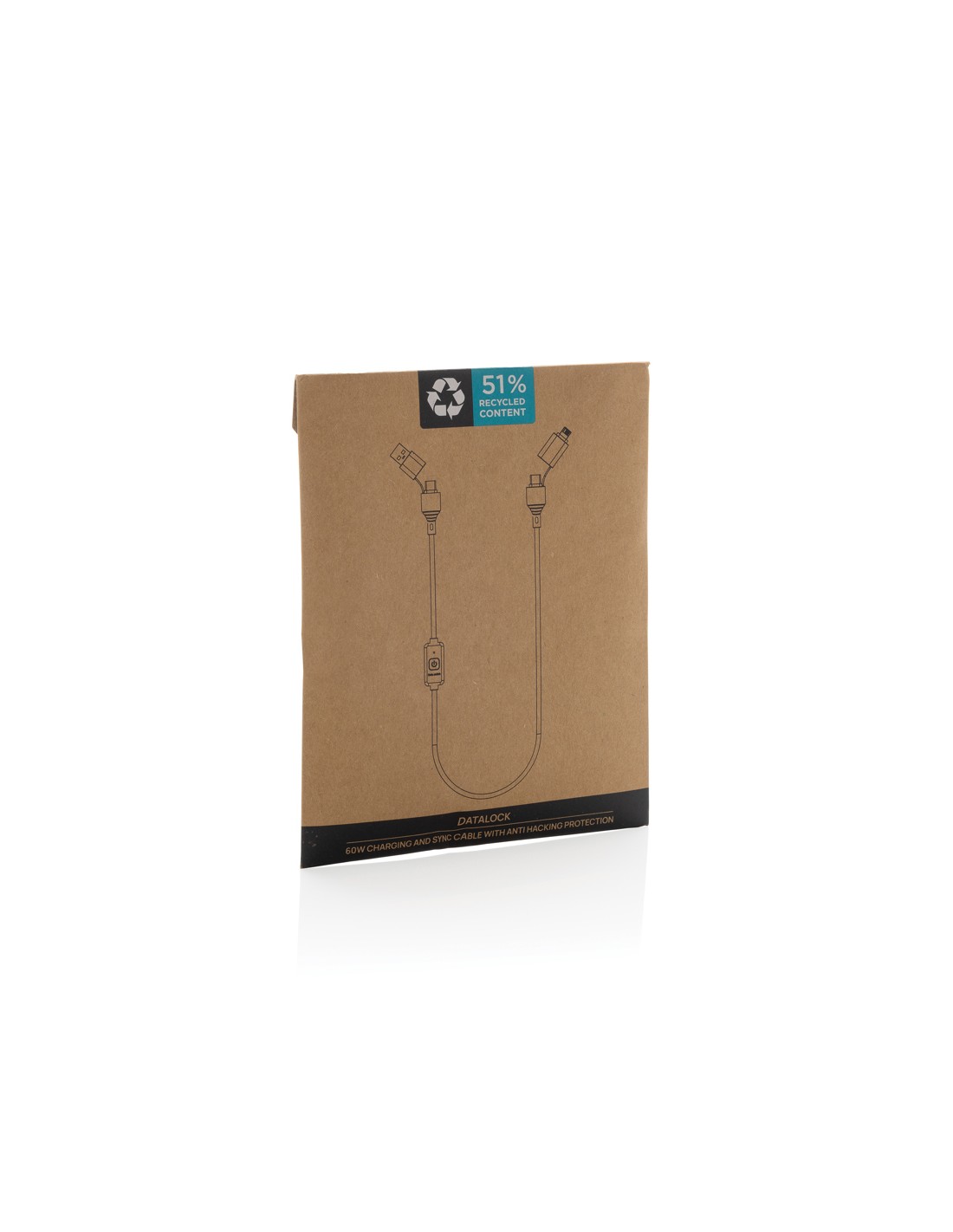 Caricabatterie e cavo dati da 60W che ricarica tutti i dispositivi mobili alla massima velocità e supporta anche la ricarica dei computer portatili. Il cavo è dotato di un esclusivo pulsante incorporato che disattiva la funzione di trasferimento dati quando si utilizza il cavo in pubblico, per evitare il furto di dati o l'accesso al telefono da parte di hacker. È sufficiente premere il pulsante per attivare la modalità di protezione. Il cavo è realizzato in TPE, PET, ABS e alluminio riciclati. Lungo 120 cm, supporta Car Play e Android Auto (solo da type C a type C). Contenuto totale di materiale riciclato: 52% in base al peso totale del prodotto. La certificazione RCS garantisce una catena di approvvigionamento di materiali riciclati completamente certificata. Confezionato in scatola FSC mix. Senza PVC.