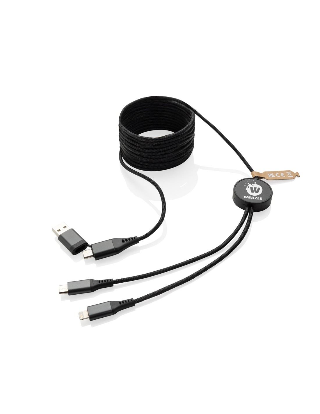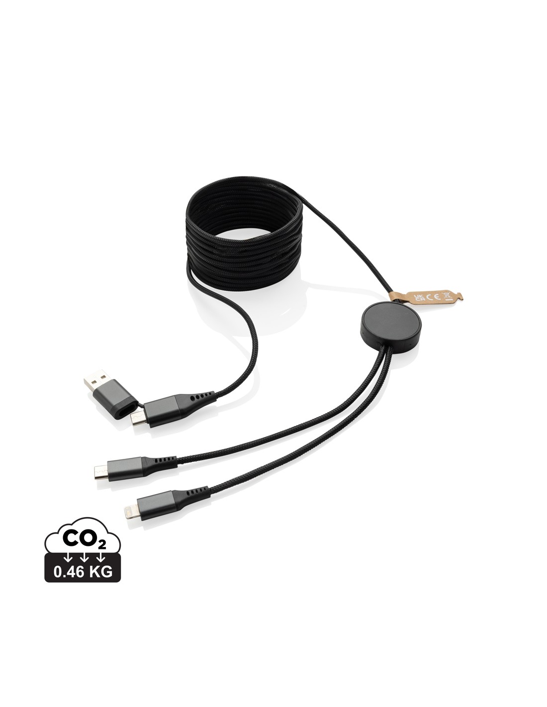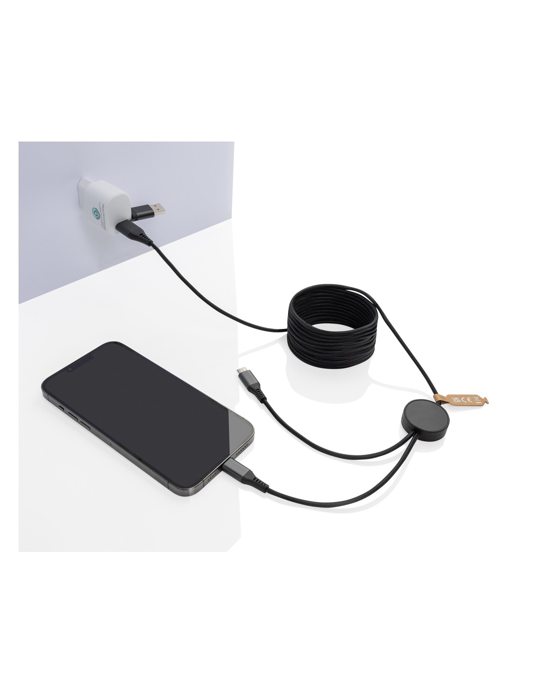 Cavo di ricarica extra-lungo da 3 metri realizzato con alluminio riciclato certificato RCS (Recycled Claim Standard), TPE riciclato, ABS riciclato e pet riciclato. Contenuto totale riciclato: 53% in base al peso totale dell'articolo. La certificazione RCS garantisce una filiera completamente certificata dei materiali riciclati. L'alluminio non perde le sue caratteristiche nel processo di riciclaggio e può essere riciclato all'infinito. Con doppio connettore di ingresso: USB A e type-C. Doppio output: Apple Lightning e type C. Per un totale di 4 opzioni di ricarica. Con cavo in rPET intrecciato certificato RCS di 300 cm di lunghezza. Confezionato in un imballaggio FSC® mix. Adatto solo per la ricarica. Supporta una ricarica fino a 5 V/2 A. 100% senza PVC.