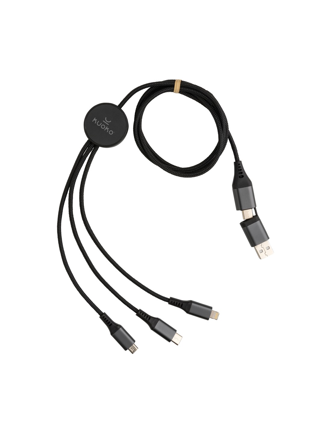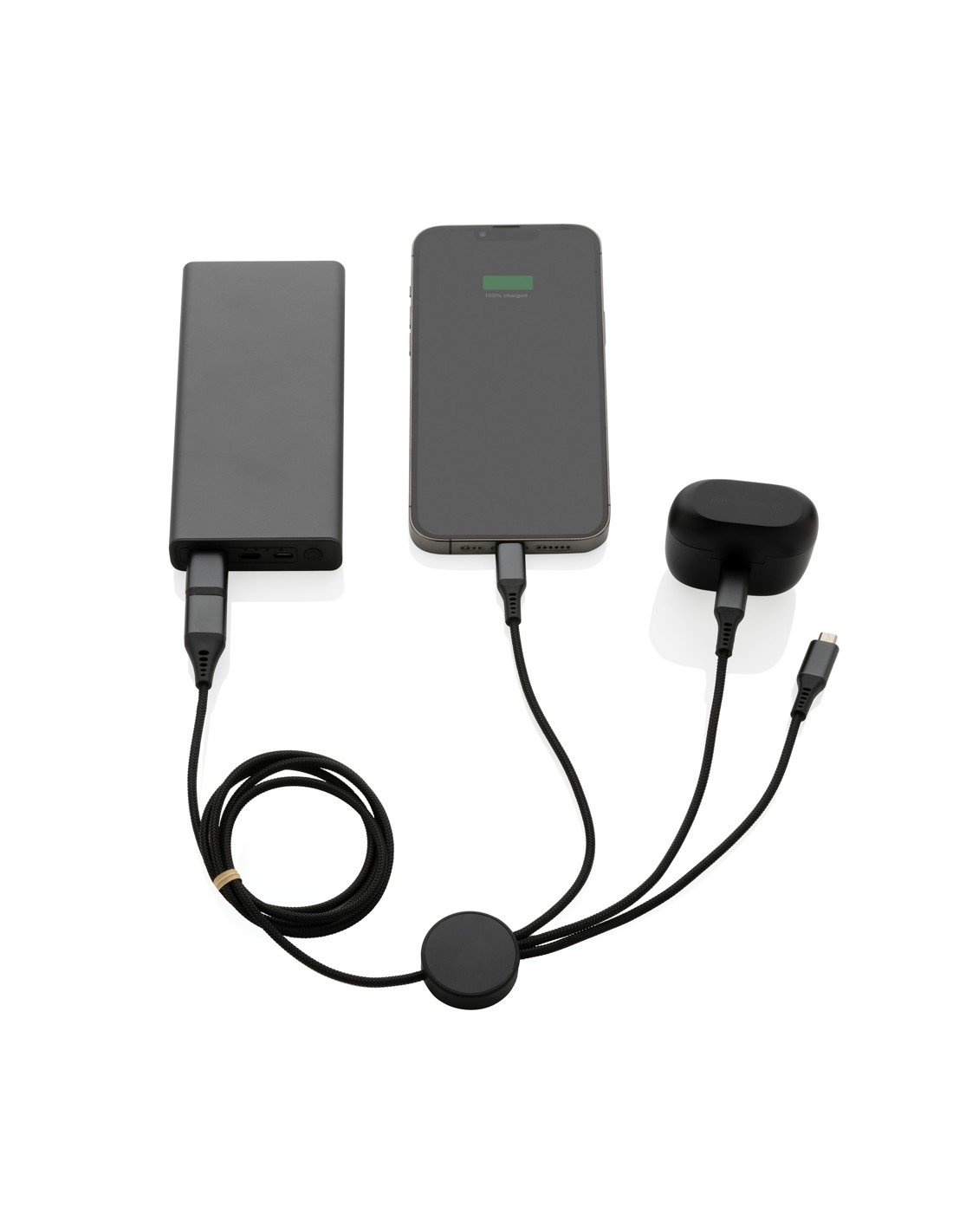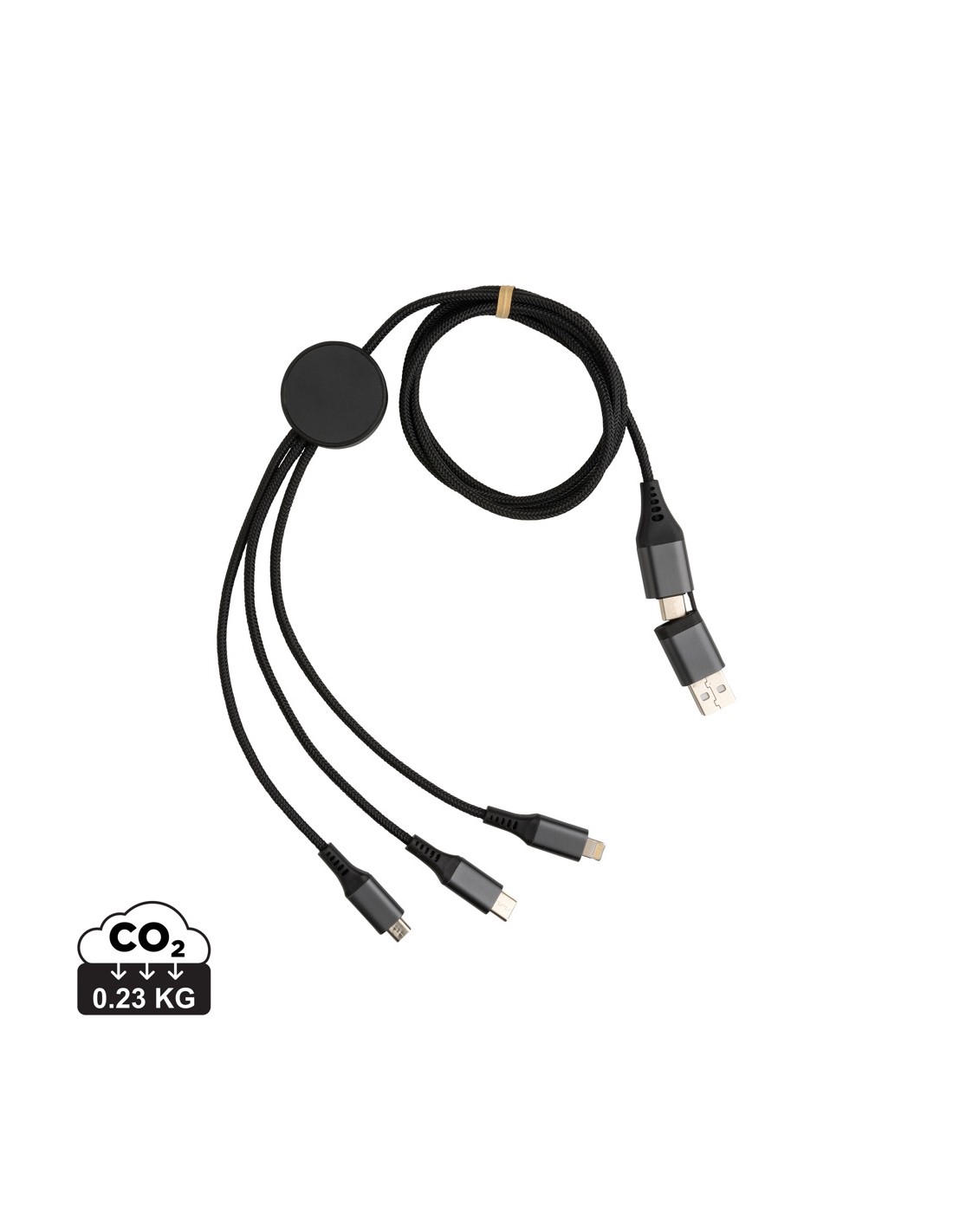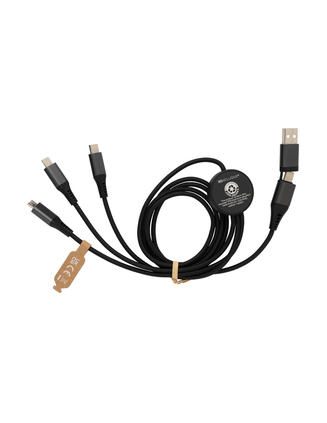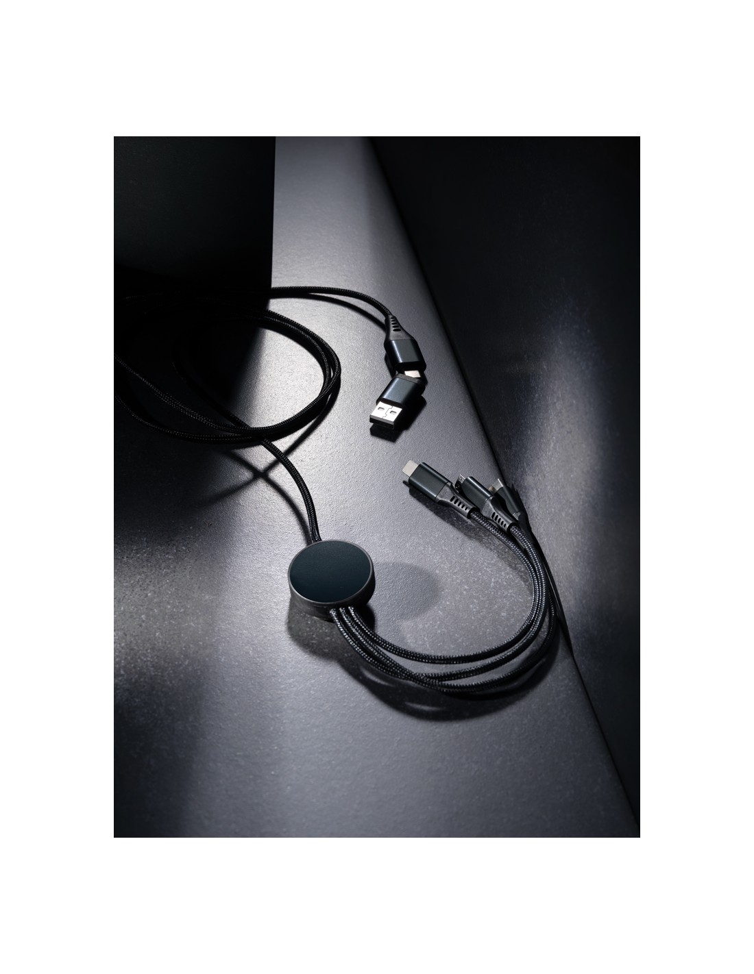 Cavo di ricarica realizzato con alluminio riciclato certificato RCS (Recycled Claim Standard), TPE riciclato e pet riciclato. Contenuto totale riciclato: 65% in base al peso totale dell'articolo. La certificazione RCS garantisce una filiera completamente certificata dei materiali riciclati. L'alluminio non perde le sue caratteristiche nel processo di riciclaggio e può essere riciclato all'infinito. Con doppio connettore di ingresso: USB A e type C. Tripla uscita: Apple Lightning/Micro e Type C, per un totale di 6 opzioni di ricarica. Con cavo intrecciato in PET riciclato certificato RCS con una lunghezza di 120 cm. Confezionato in scatola FSC® mix. Adatto per la ricarica, la sincronizzazione e compatibile con l'utilizzo in auto (solo da type C a type C). Supporta la ricarica rapida fino a 9 V/2A.