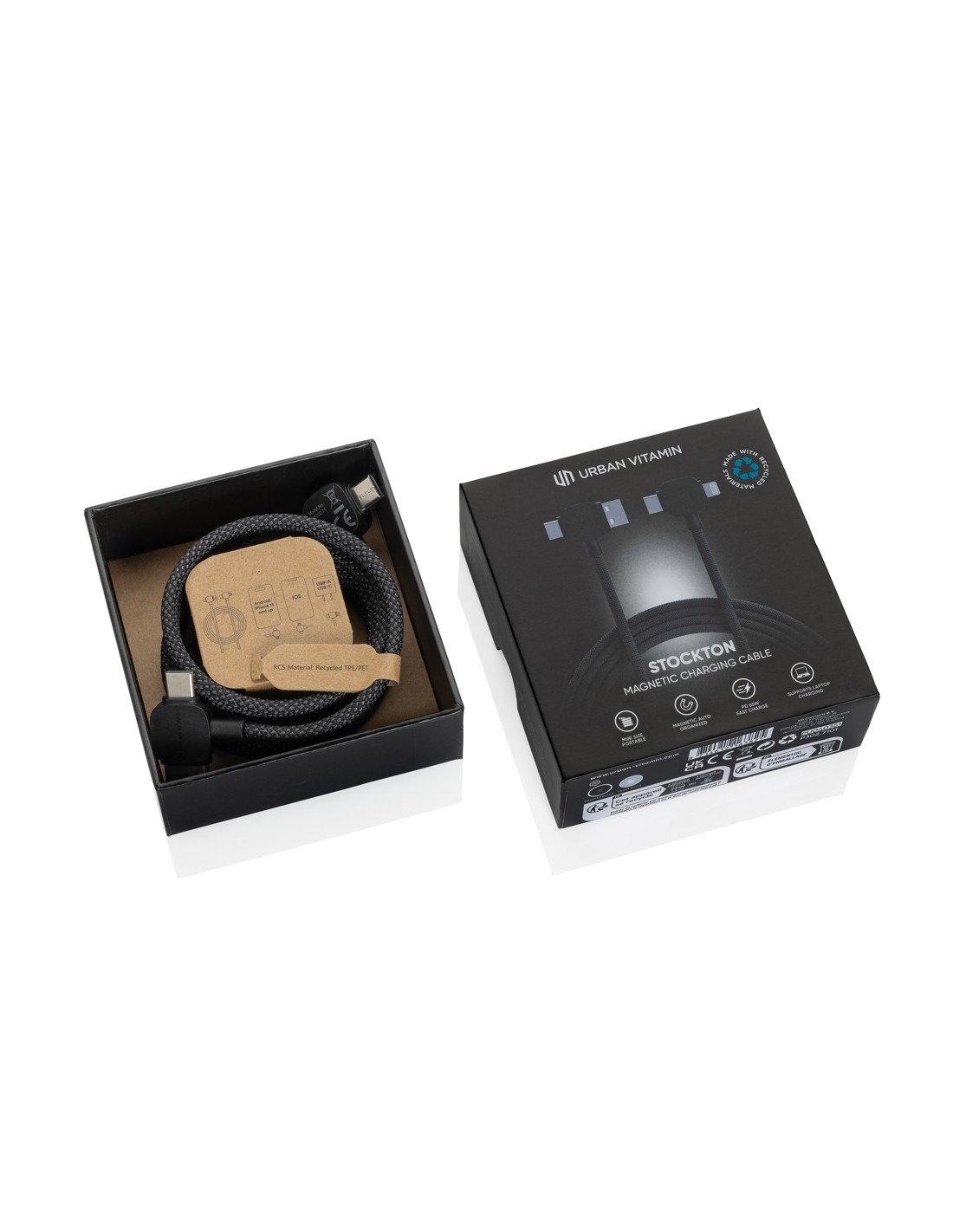 Il cavo di ricarica magnetico di ultima generazione da 120 cm che garantisce una connettività perfetta! Dite addio ai cavi aggrovigliati, è progettato per rivoluzionare la vostra esperienza di ricarica. Grazie al suo design magnetico, semplifica l'organizzazione dei cavi, evita che si aggroviglino e può essere portato ovunque. Si adatta al vostro stile di vita in movimento, offrendo sia input USB Type-C che USB-A, garantendo la compatibilità con diversi dispositivi. Grazie agli output iOS e type-C, è sufficientemente versatile per ricaricare iPhone, dispositivi Android o laptop! Stockton non è solo un cavo di ricarica, ma è anche la soluzione ideale per il trasferimento di dati, per sincronizzare file, foto e musica tra i dispositivi. Con una potente capacità di ricarica da 65W, è un prodotto innovativi sia per i dispositivi mobili che per i computer portatili. Stockton è realizzato con ABS riciclato certificato RCS (Recycled Claim Standard). Contenuto riciclato totale dell'articolo.