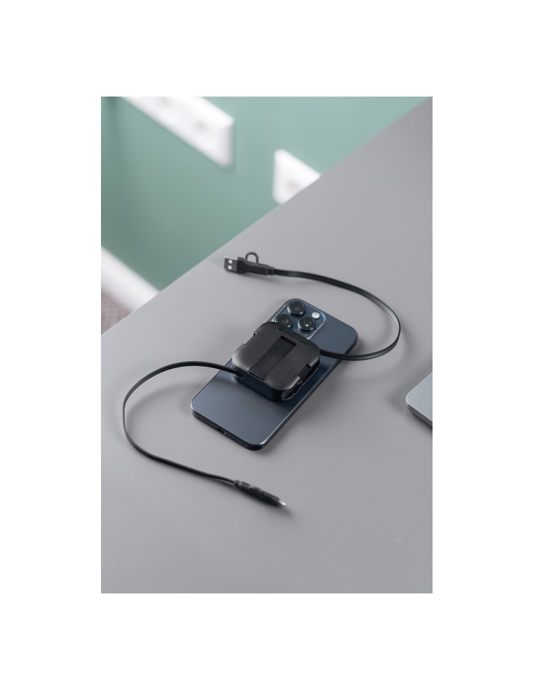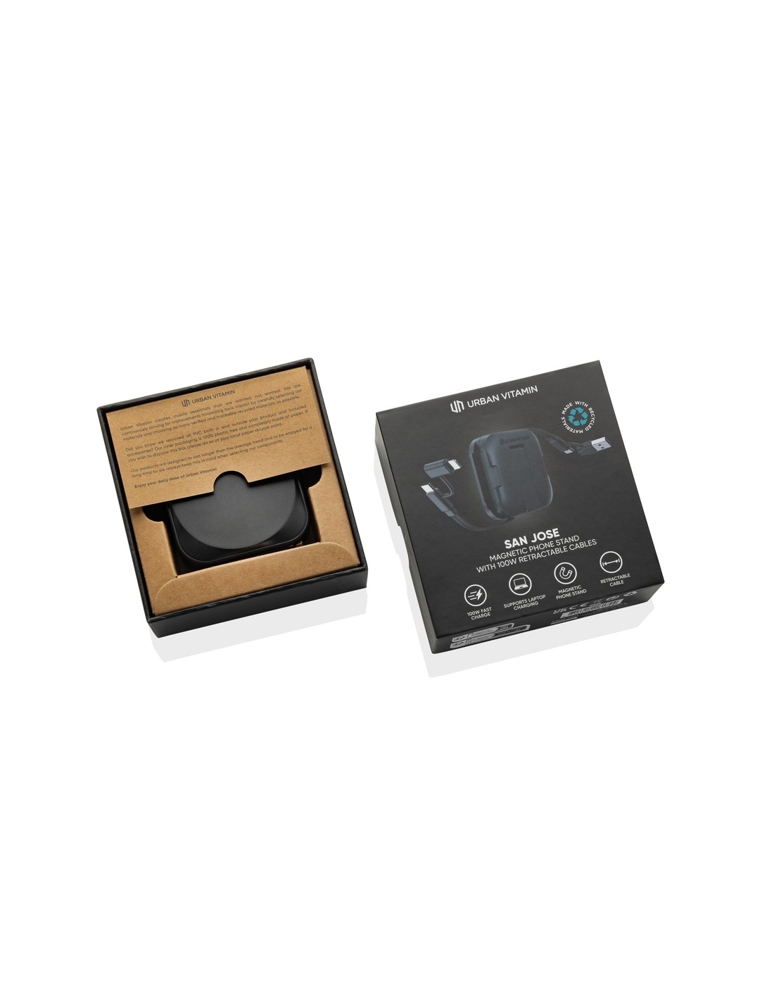 La soluzione di ricarica all-in-one definitiva. San Jose è un supporto per smartphone da 100W con cavo di ricarica retrattile integrato che offre una ricarica super veloce e la massima praticità. Grazie al supporto magnetico e al cavalletto, San Jose mantiene il telefono al sicuro e inclinato all'angolazione perfetta per l'uso a mani libere, sia che tu stia guardando video, effettuando videochiamate o utilizzando CarPlay. Il cavo retrattile in rTPE si estende fino a 100 cm e offre una ricarica super veloce, supportando fino a 100W di potenza con il cavo da type C a type C. È inoltre dotato di connettori da USB A a type C e da USB A a iOS, che lo rendono versatile per ricaricare un'ampia gamma di dispositivi. Inoltre, supporta il trasferimento dei dati per una sincronizzazione dei file senza interruzioni durante la ricarica. San Jose è realizzato con materiali rABS e rTPE certificati RCS (Recycled Claim Standard). Contenuto totale riciclato: 59% in base al peso dell'articolo. Gli artico