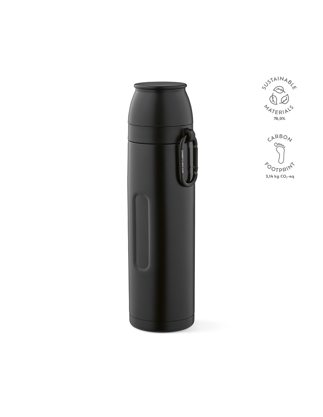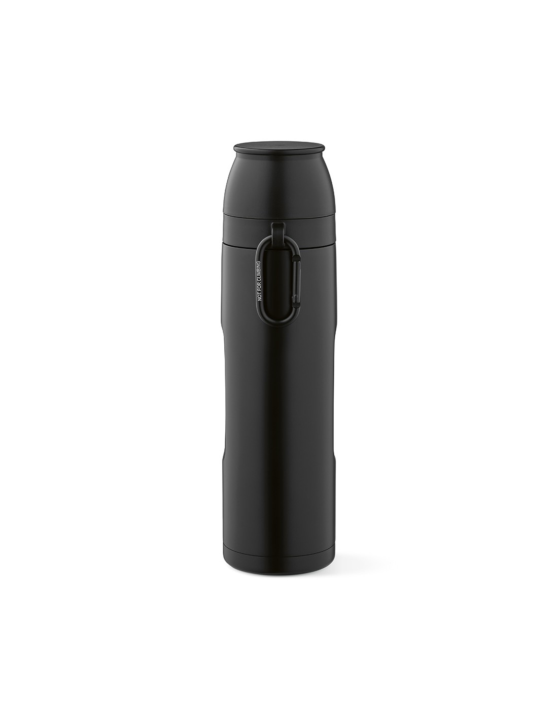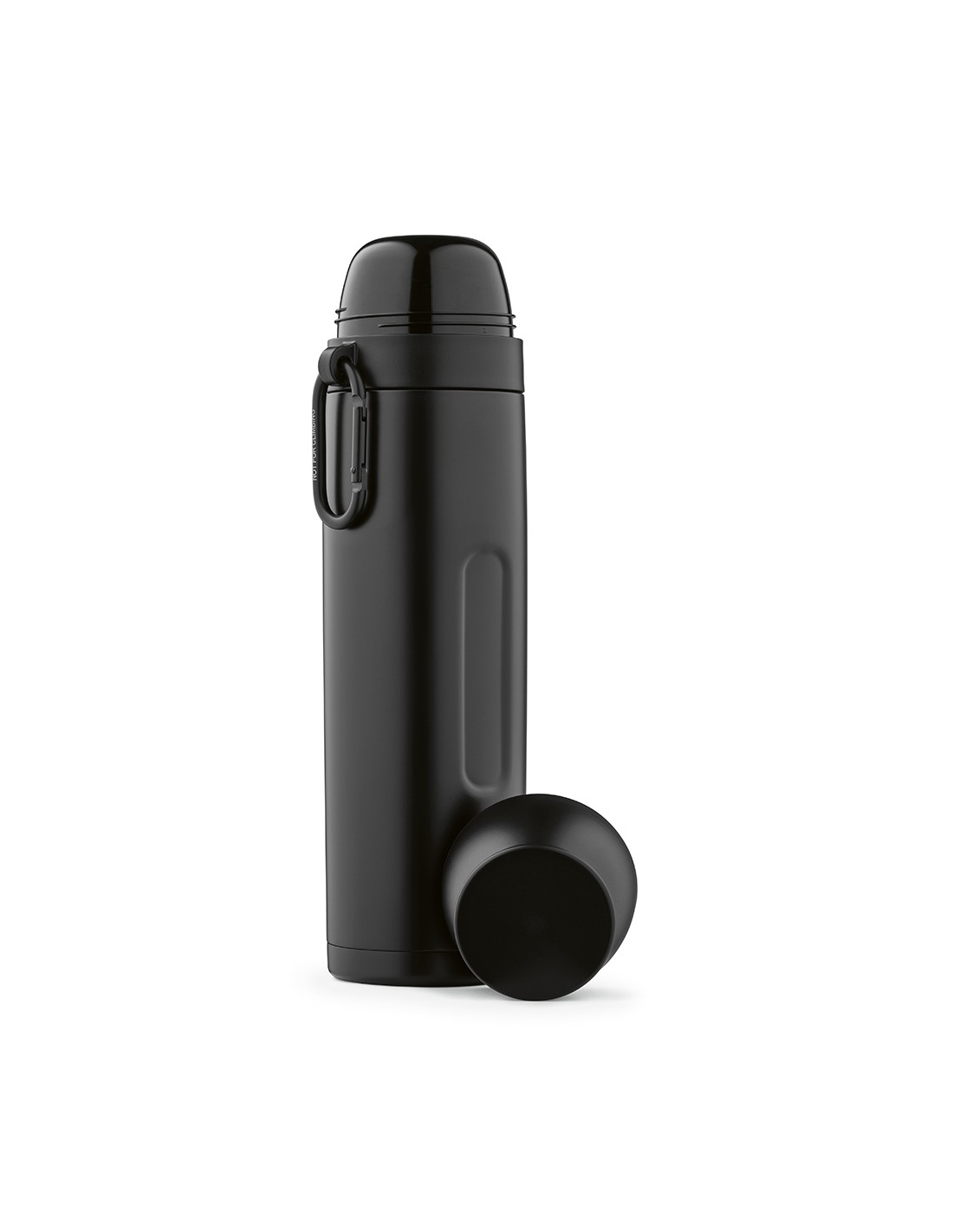 Flinders thermos 1080ml (1000ml net) realizzato in acciaio inox riciclato. Dotato di moschettone per un facile trasporto. L’isolamento a doppia parete mantiene le bevande calde per 20 ore o fredde per 55 ore. Include 2 bicchieri da 19cl e 22cl. Disponibile in 5 colori e confezionato singolarmente in scatola kraft.