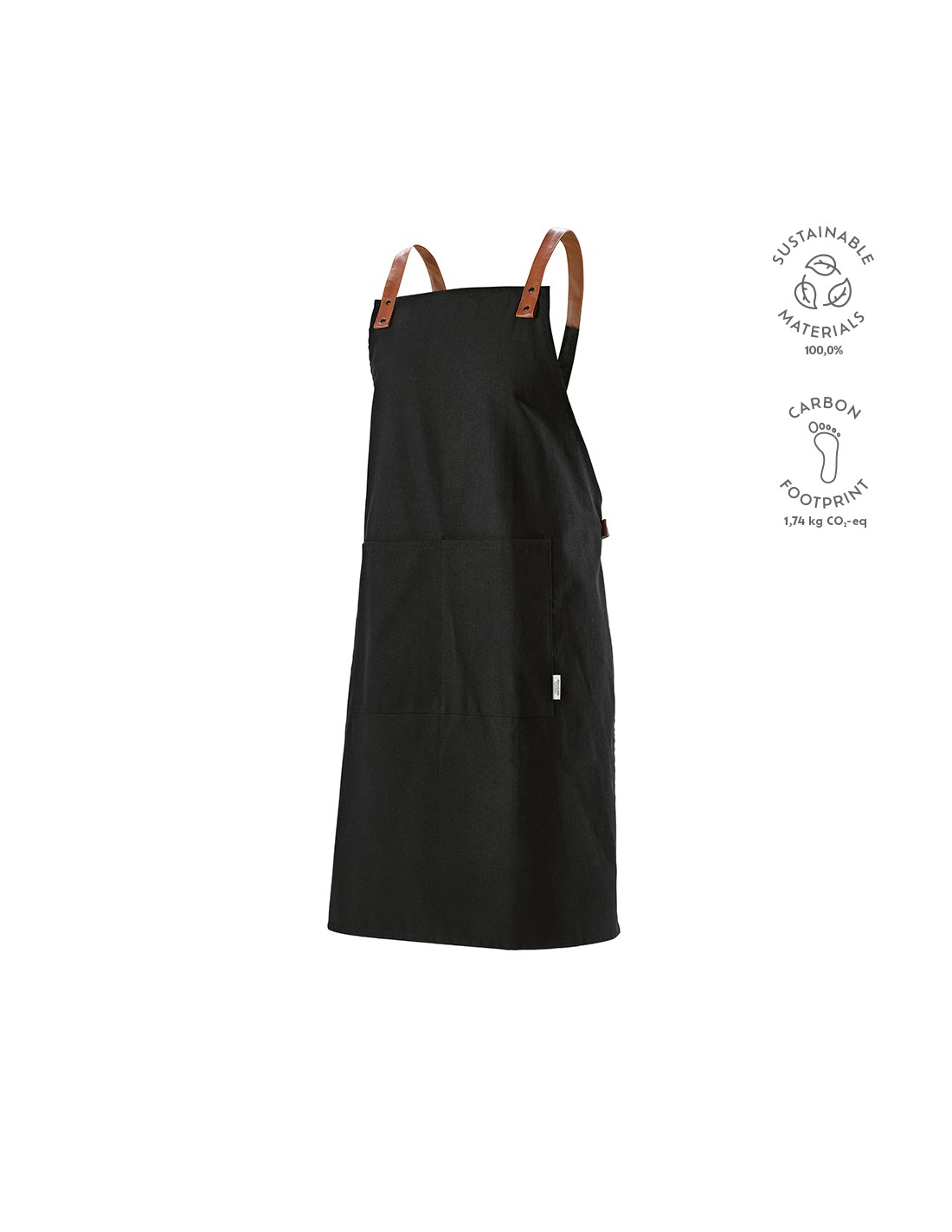 Grembiule sostenibile realizzato in cotone biologico da 200 g/m². Dispone di 2 tasche adiacenti con una dimensione combinata di 45 x 20 cm e di un'allacciatura posteriore da 1 metro. Lunghezza del laccetto per il collo: 55 cm.