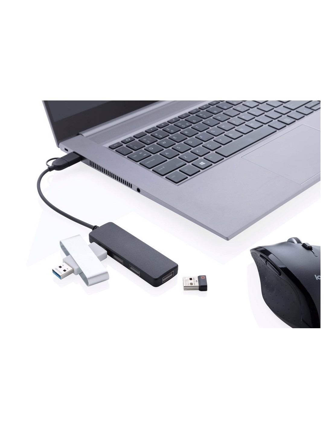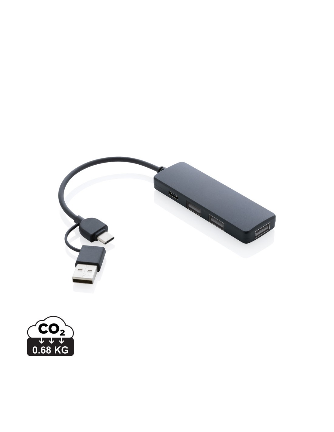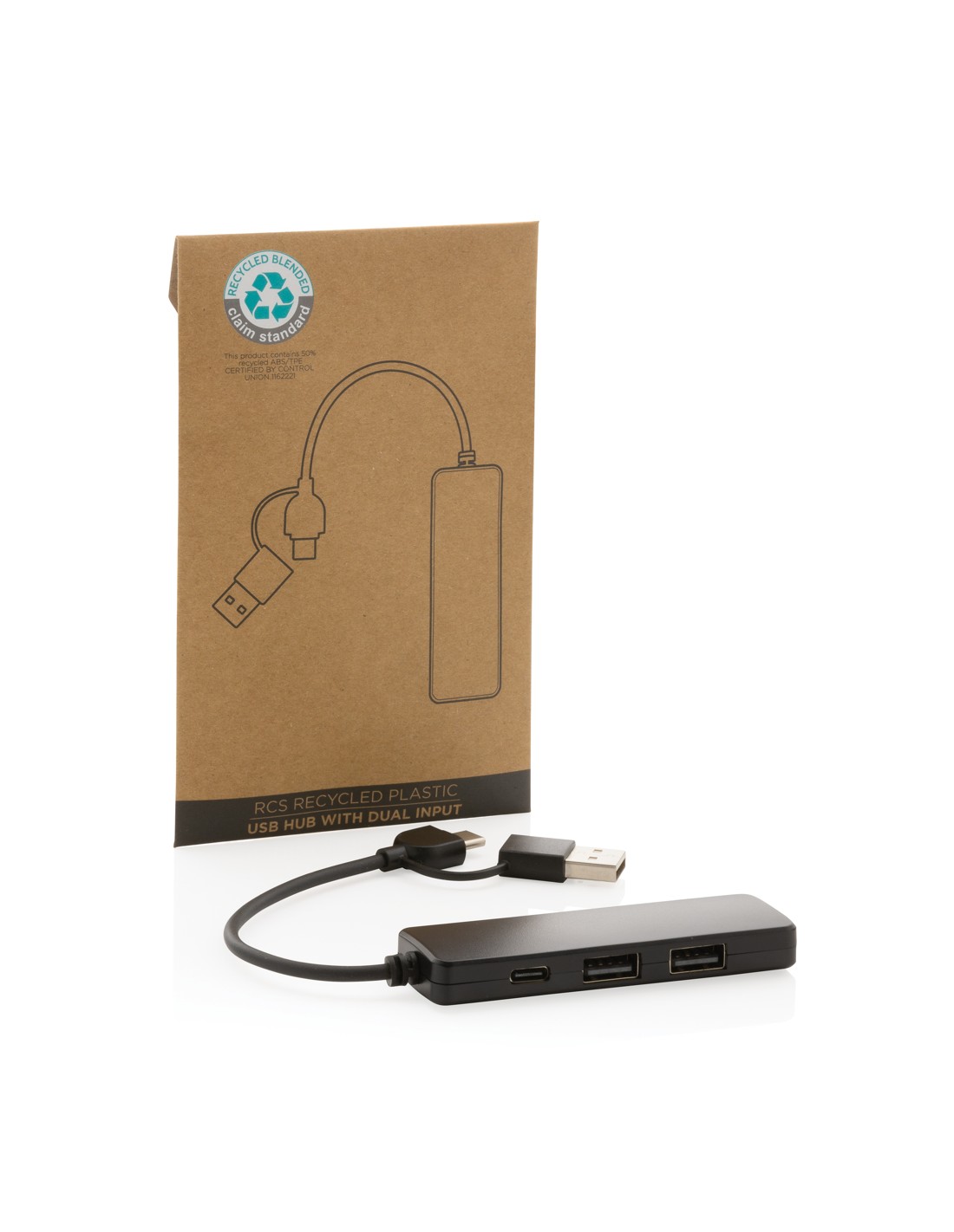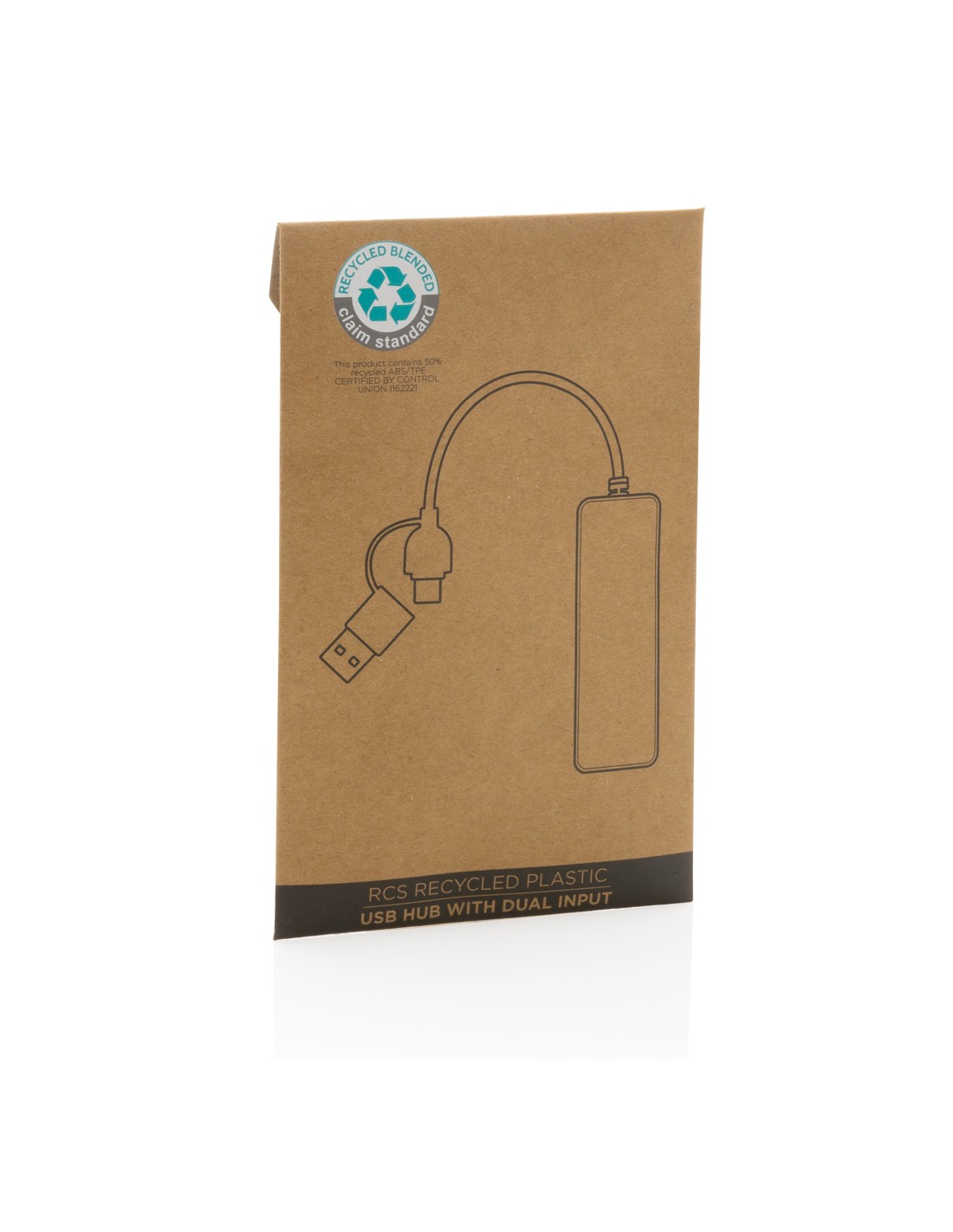 Hub USB realizzato al 100% in plastica ABS riciclata secondo gli standard RCS. RCS (Recycled Claim Standard) è uno standard per verificare il contenuto riciclato di un prodotto lungo l'intera filiera produttiva. Include 3 porte USB A 2.0, una porta type C e un cavo integrato da 8,5 cm in TPE riciclato al 100% certificato RCS. Contenuto riciclato totale: 50% in base al peso totale dell'articolo. Doppio connettore in input, quindi adatto sia ai computer type C che USB A. Articolo e accessori 100% senza PVC. Confezionato in scatola FSC mix.