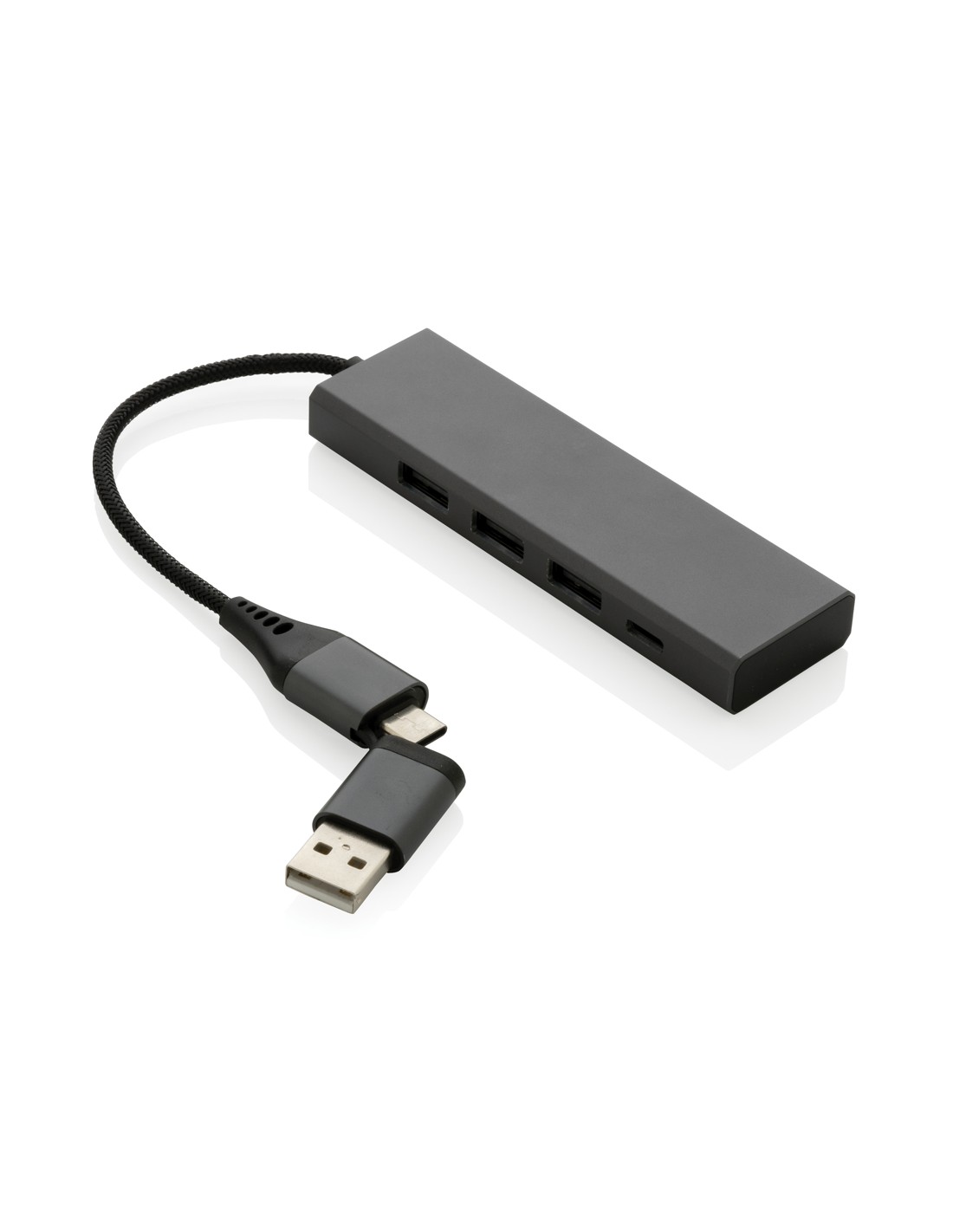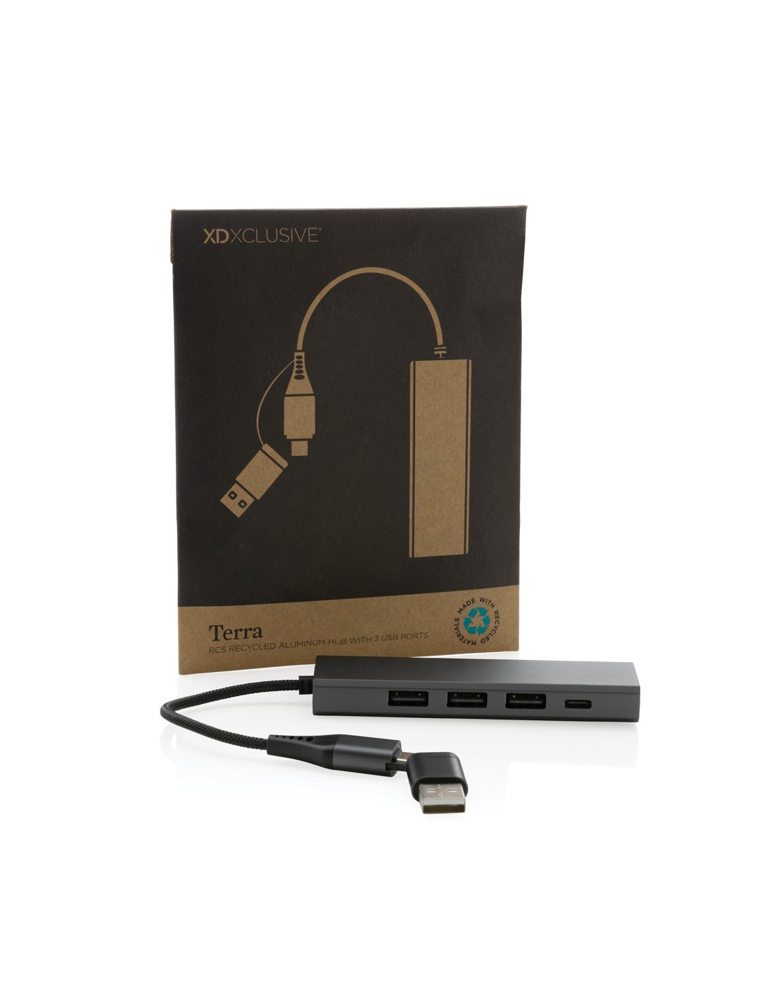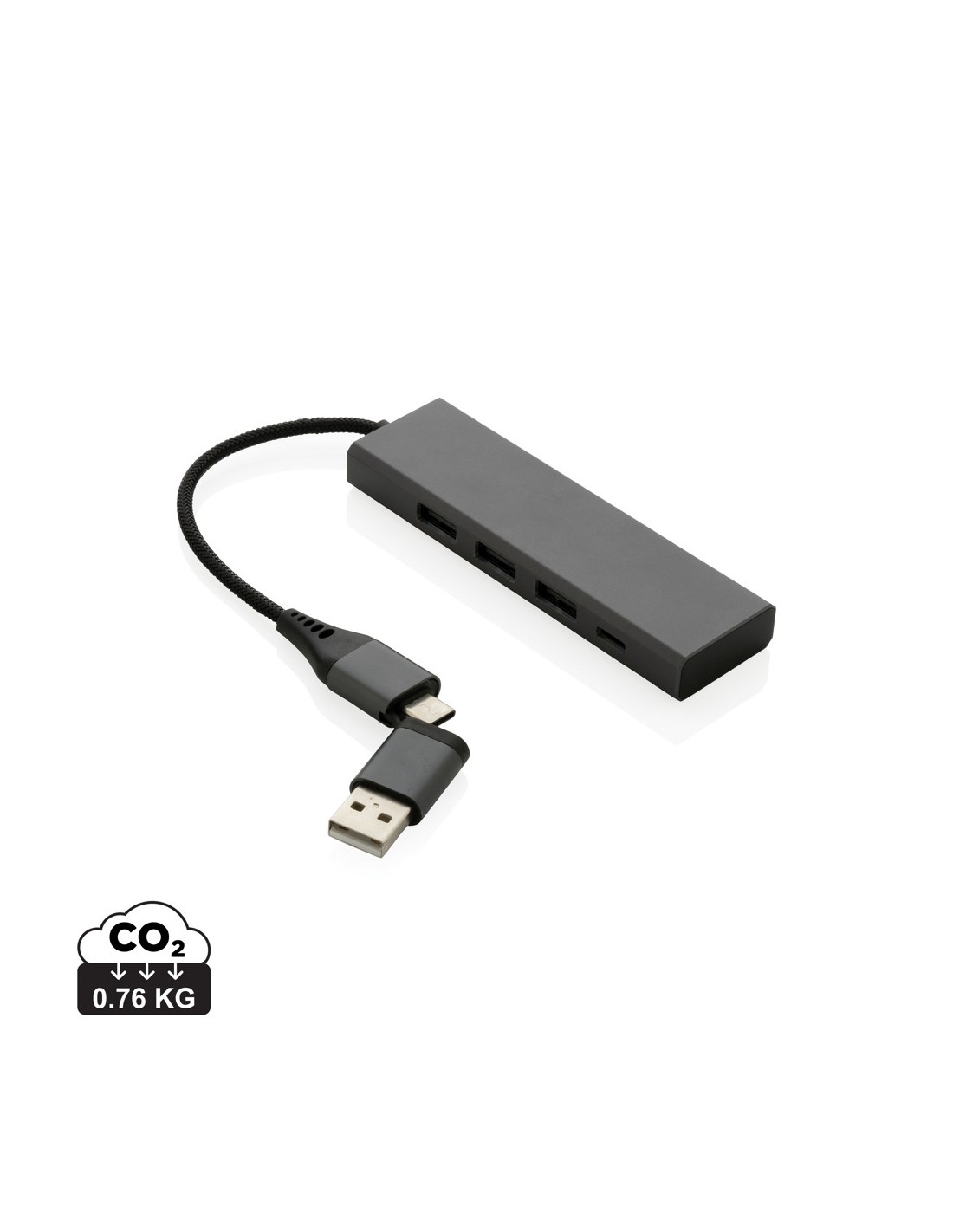 Hub USBrealizzato con alluminio riciclato certificato RCS (Recycled Claim Standard), ABS, TPE e PET. Con 3 porte USB A 2.0 e 1 porta type C. L'HUB ha un cavo integrato da 10 cm realizzato con materiale TPE/PET riciclato certificato RCS. Contenuto totale riciclato: 75% in base al peso totale dell'articolo. La certificazione RCS garantisce una filiera completamente certificata dei materiali riciclati. Include doppio connettore di ingresso, quindi è adatto sia per dispositivi type C che USB A. L'alluminio non perde le sue caratteristiche nel processo di riciclaggio e può essere riciclato all'infinito. Articolo e accessori 100% non contengono PVC. Confezionato in scatola FSC mix.