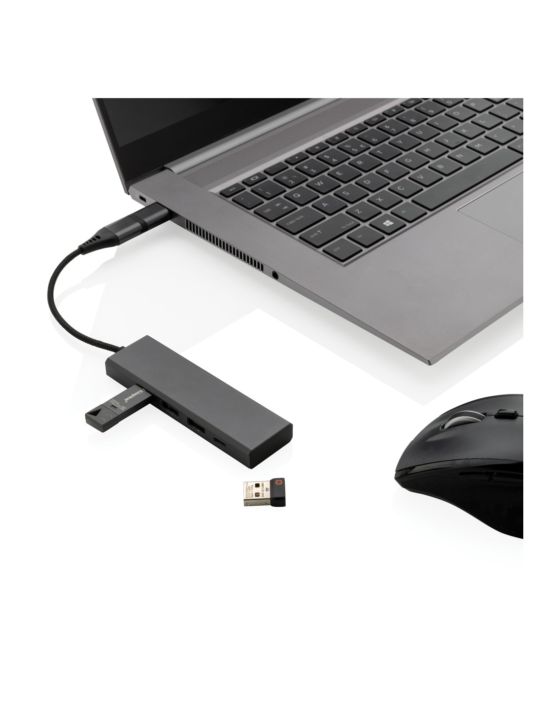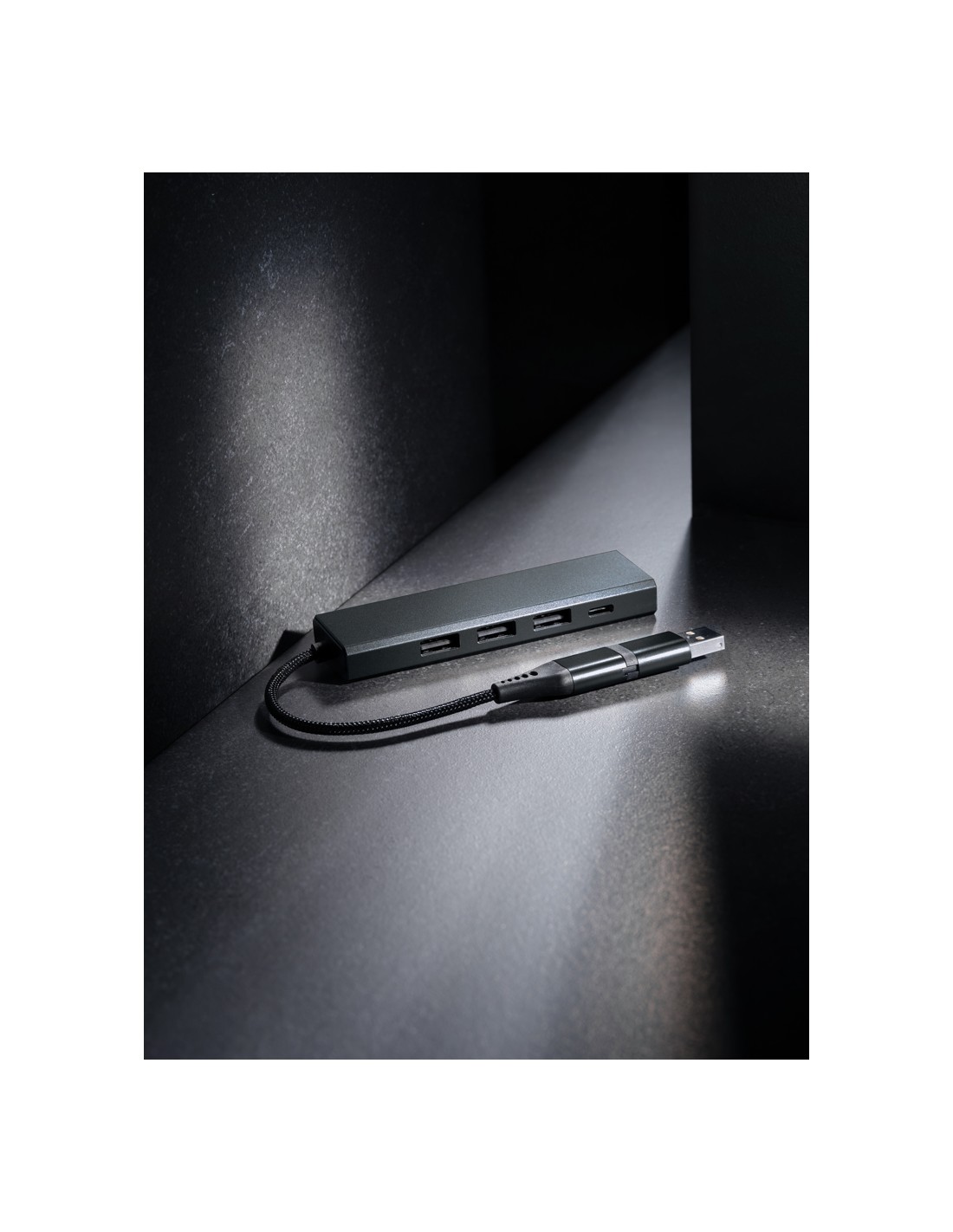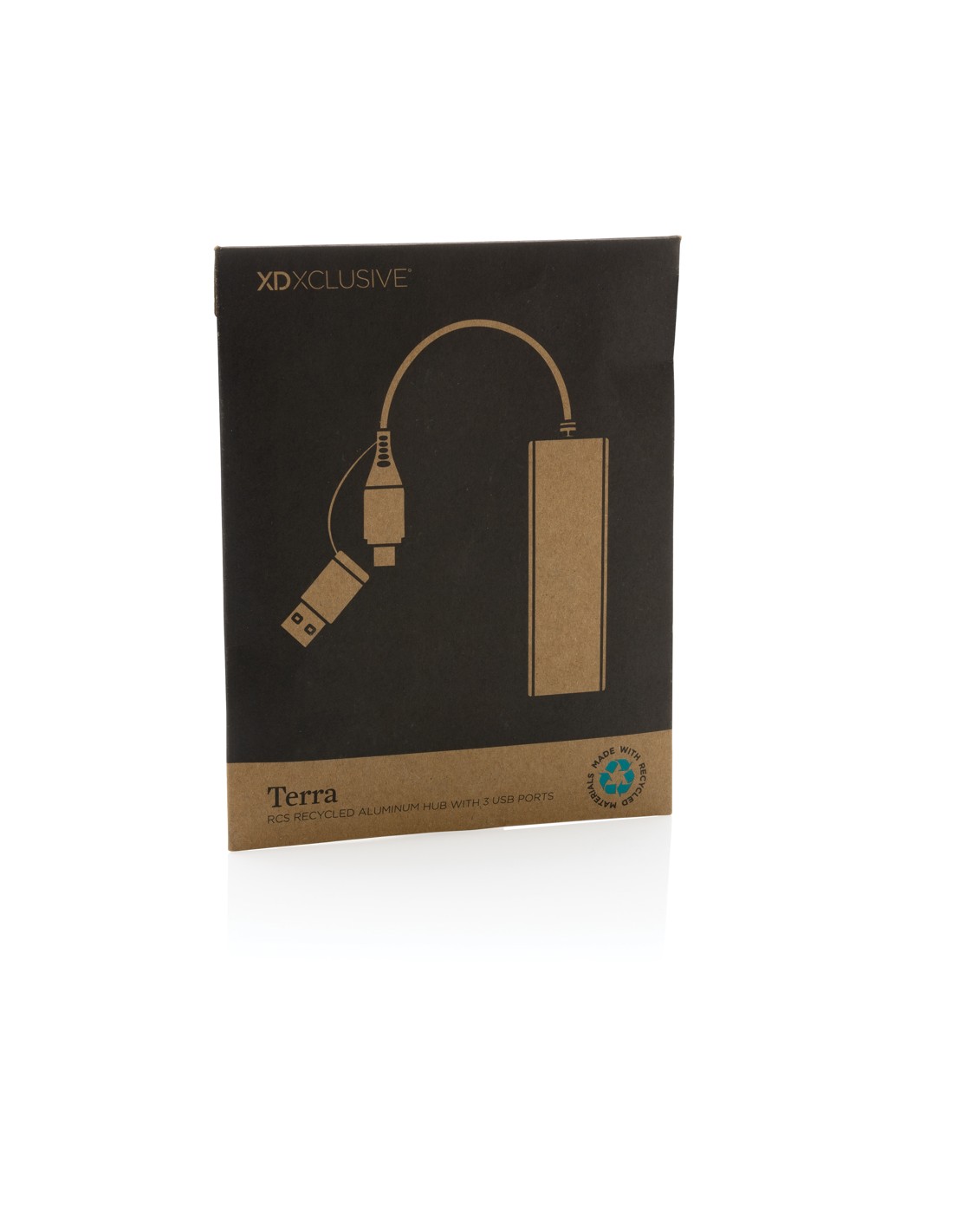 Hub USBrealizzato con alluminio riciclato certificato RCS (Recycled Claim Standard), ABS, TPE e PET. Con 3 porte USB A 2.0 e 1 porta type C. L'HUB ha un cavo integrato da 10 cm realizzato con materiale TPE/PET riciclato certificato RCS. Contenuto totale riciclato: 75% in base al peso totale dell'articolo. La certificazione RCS garantisce una filiera completamente certificata dei materiali riciclati. Include doppio connettore di ingresso, quindi è adatto sia per dispositivi type C che USB A. L'alluminio non perde le sue caratteristiche nel processo di riciclaggio e può essere riciclato all'infinito. Articolo e accessori 100% non contengono PVC. Confezionato in scatola FSC mix.