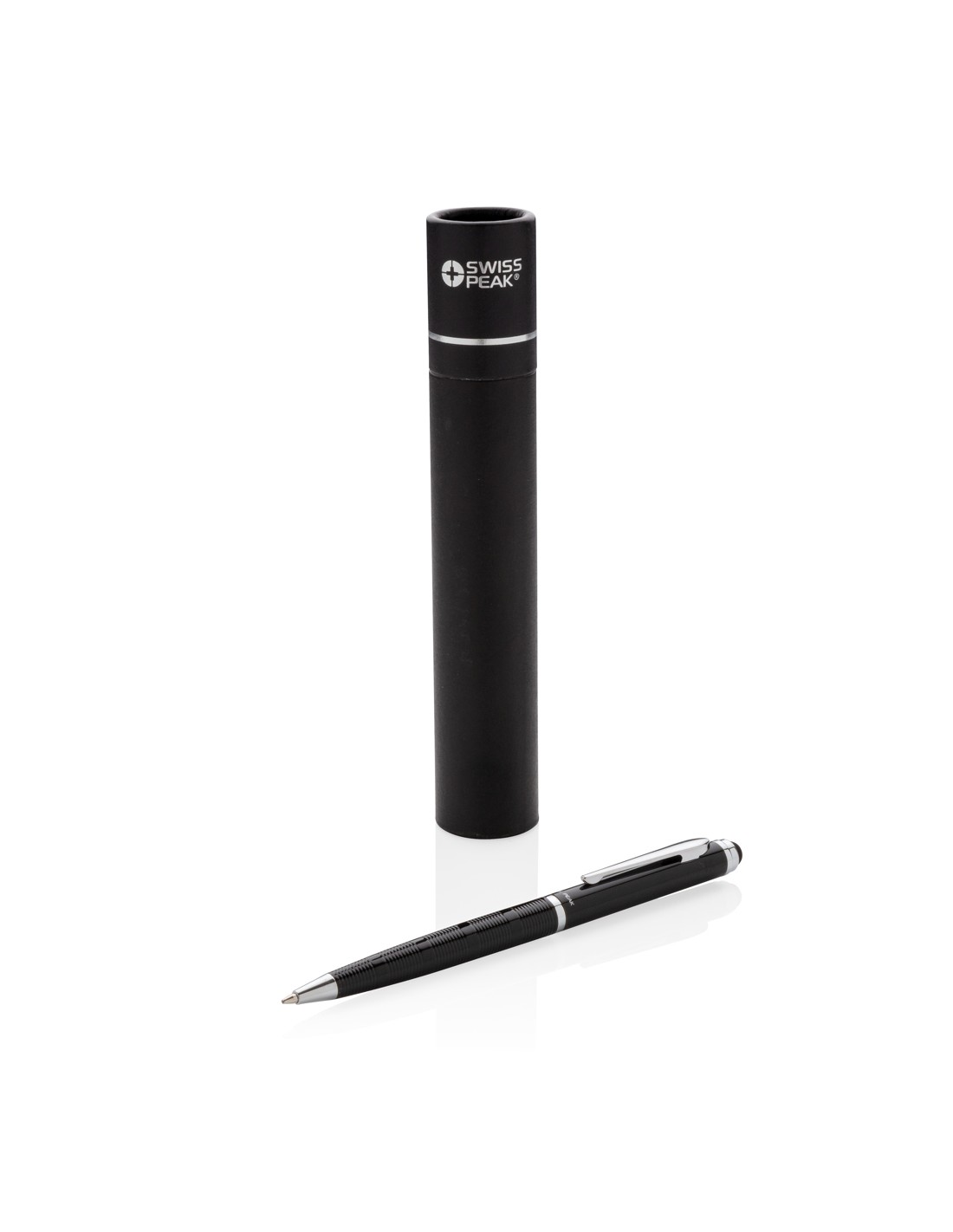Penna touch con elegante motivo a righe sul fusto. Il suo design sofisticato la rende un regalo perfetto. Include confezione da regalo a tubo Swiss Peak. Refill blu.