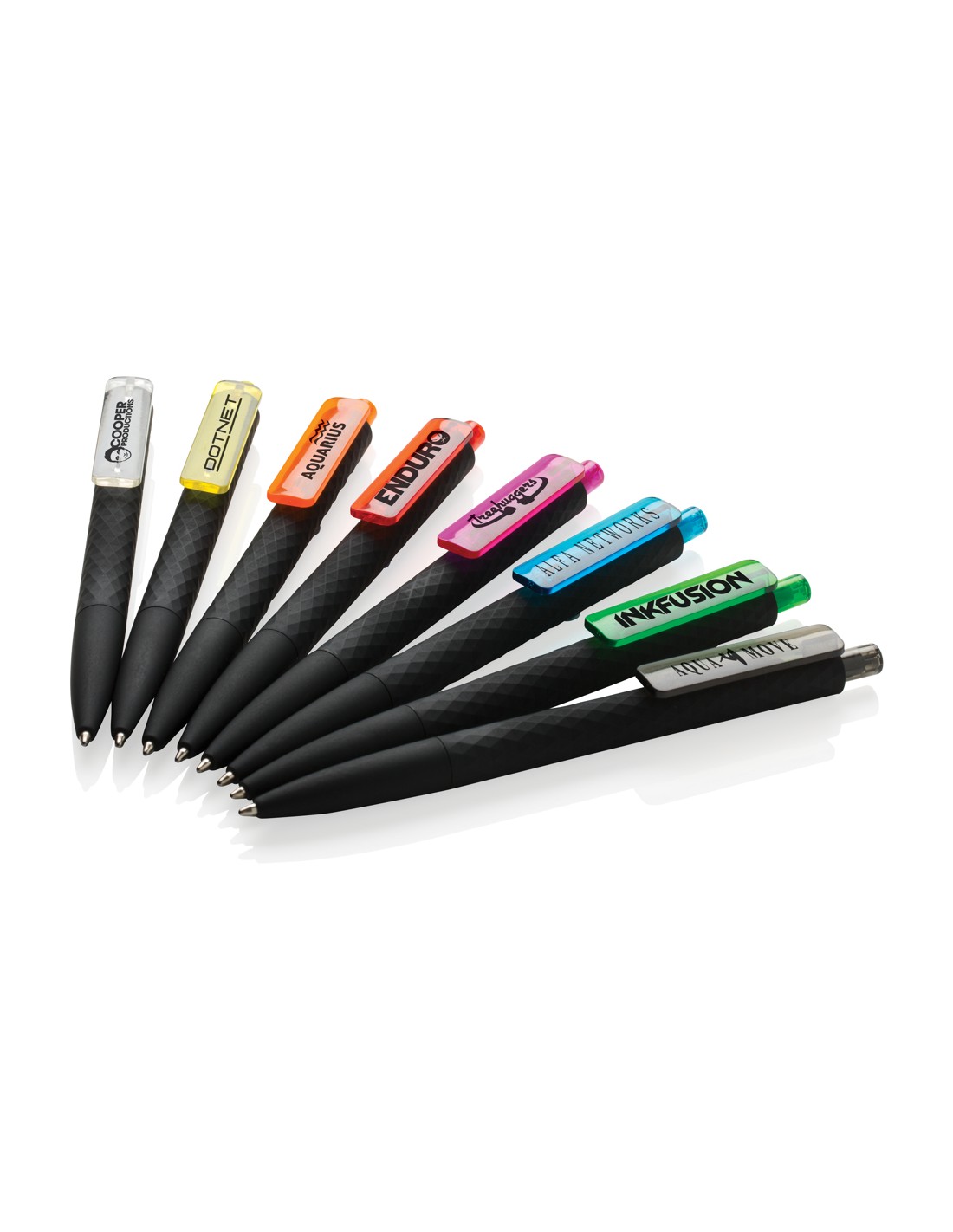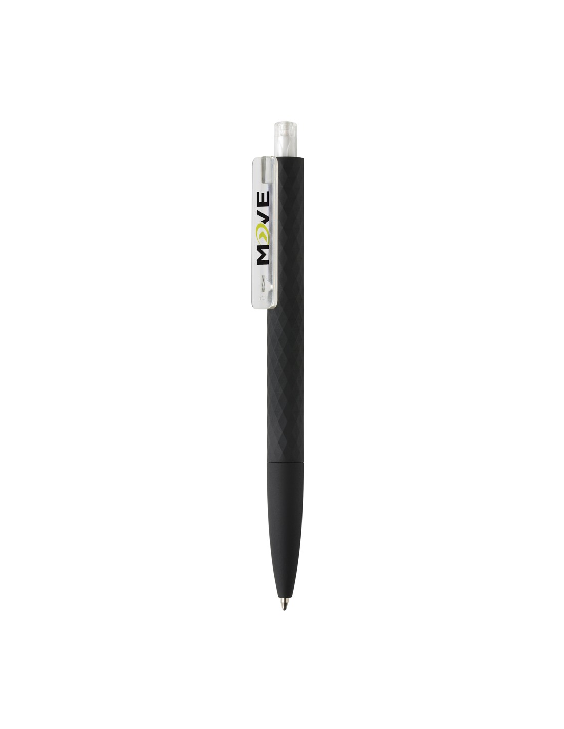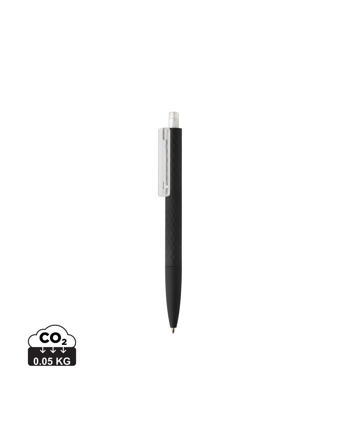 La penna X3 smooth touch black in ABS riciclato certificato RCS è una penna a sfera unica nel suo genere, caratterizzata da un affascinante motivo a rombi. Nuova versione con finitura liscia al tatto per un comfort di scrittura ancora maggiore. Include refill blu German Dokumental® con una lunghezza di scrittura di circa 1200 m e una sfera TC per una scrittura ultra fluida. La penna è realizzata con il 54% di ABS riciclato, certificato per la sostenibilità.