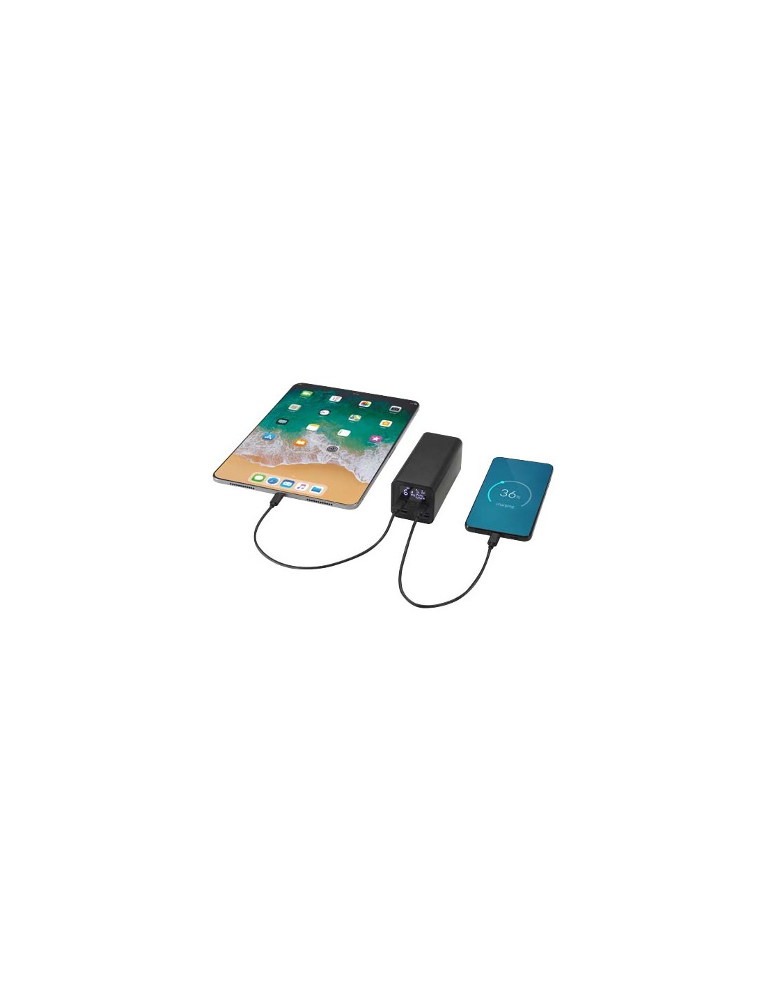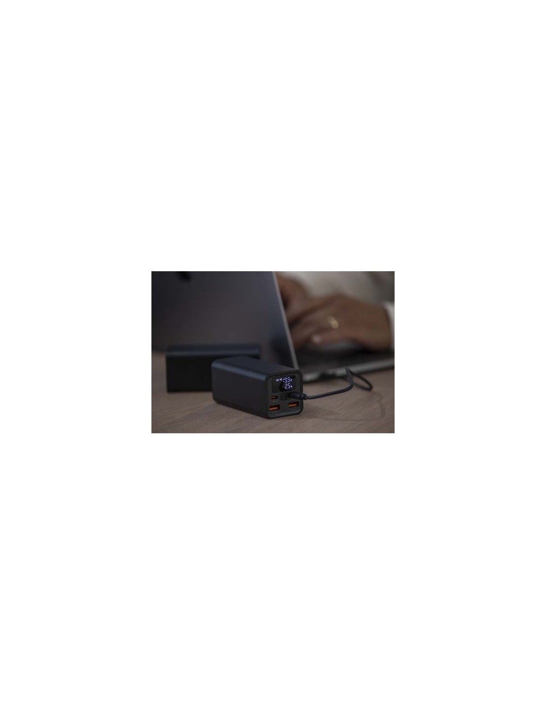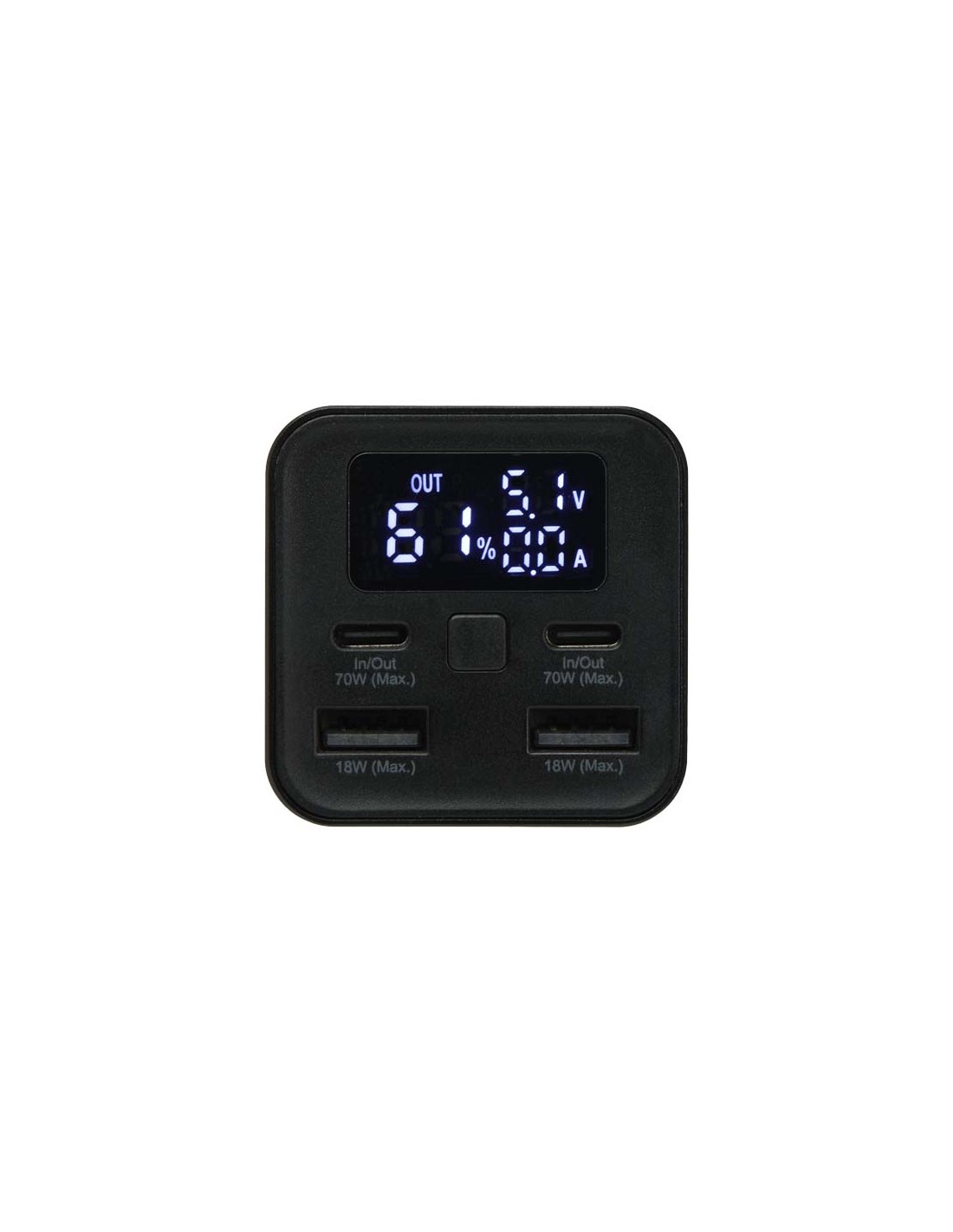 Il power bank Acamar da 20.000 mAh, realizzato in alluminio riciclato, consente di alimentare i dispositivi anche durante gli spostamenti. Progettato per essere versatile, è dotato di due porte di Tipo-C da 70 W ad alta velocità e di due porte USB-A da 18 W, perfette per ricaricare la maggior parte dei computer portatili, tablet e smartphone. Il display integrato mostra le informazioni sull'alimentazione in tempo reale, includendo la percentuale di ricarica e i dati sulla potenza erogata. È incluso un cavo Tipo-C da 70 W, per poter caricare i dispositivi o per la ricarica del power bank.