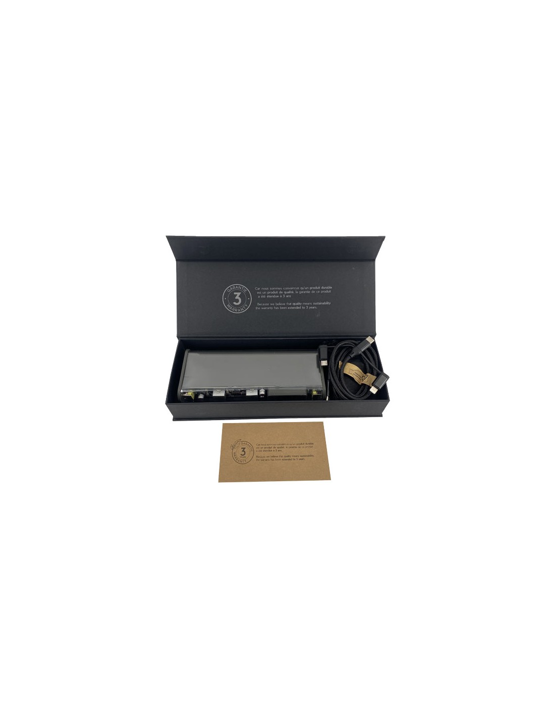 Questo power bank trasparente e portatile da 20.000 mAh è il compagno perfetto per ricaricare un laptop mentre viaggi o lavori da remoto. Il power bank include un cavo di ricarica 3 in 1 da 5 A, una doppia uscita USB-A e una porta USB-C. Fornito con una custodia in cotone riciclato per riporlo facilmente durante i viaggi o gli spostamenti. Dimensioni del power bank: 15,4 x 6,6 x 3,2 cm. Fornito in una confezione regalo in carta riciclata (23,15 x 8,75 x 3,9 cm) con chiusura magnetica. Garanzia di 3 anni inclusa.