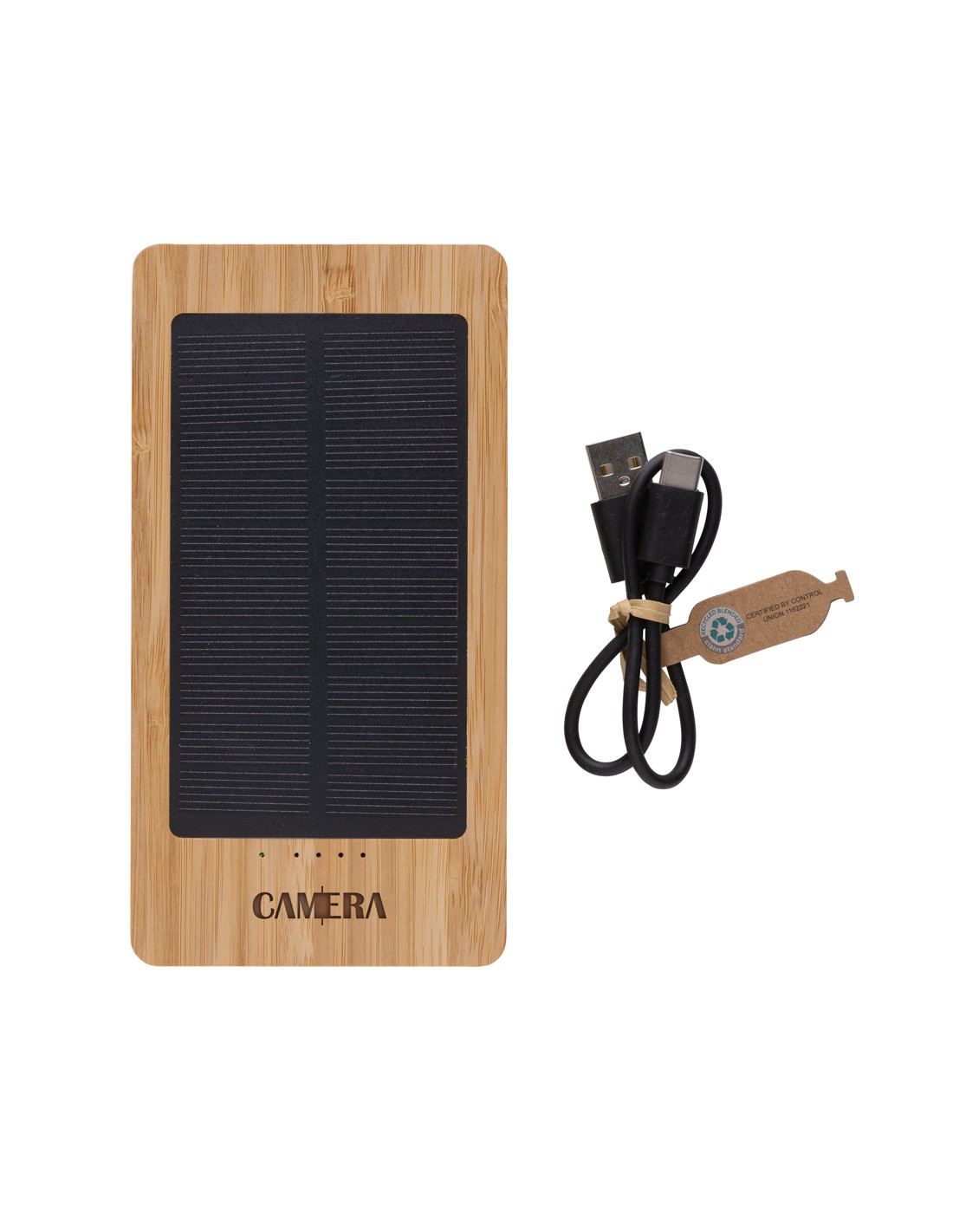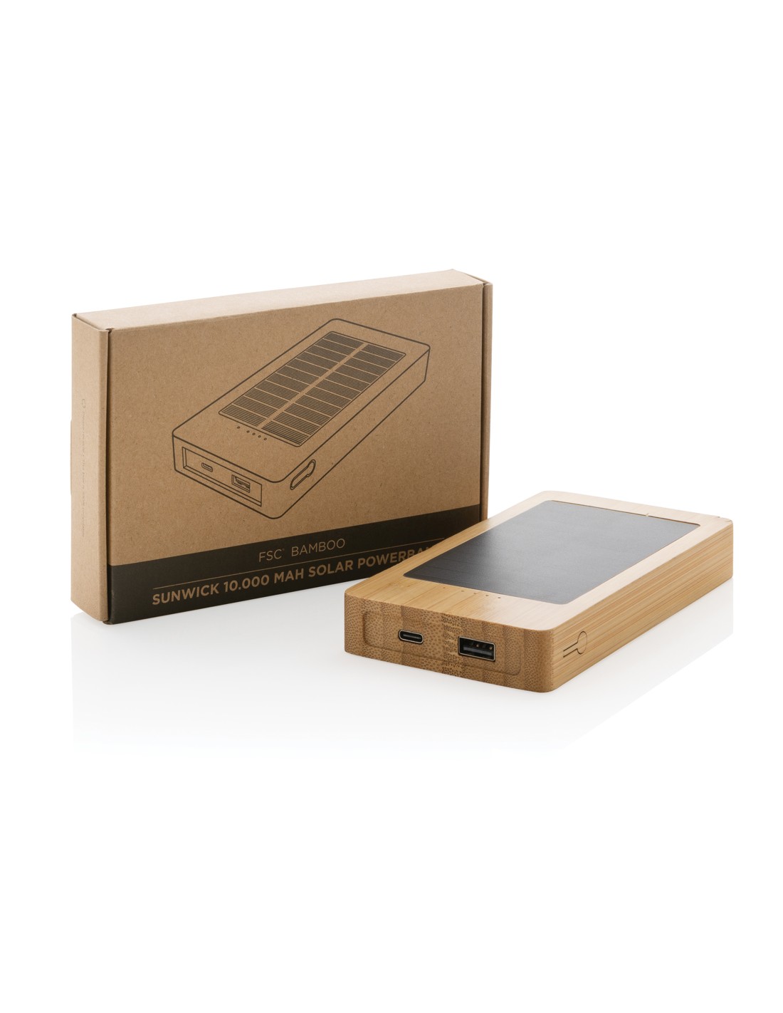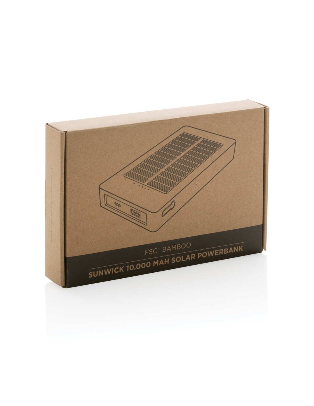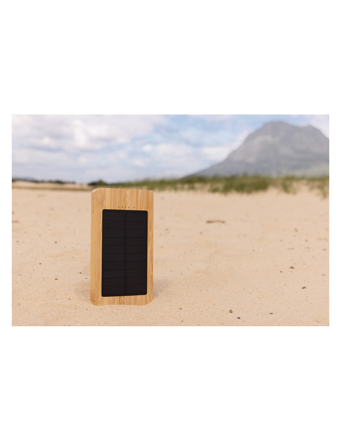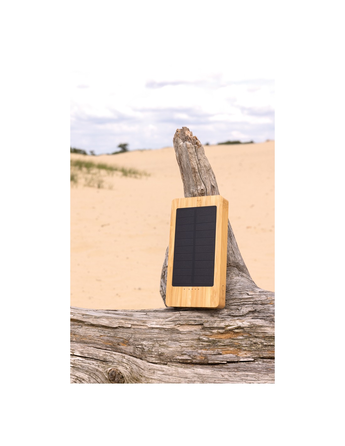 Powerbank solare da 10.000 mah realizzata con bambù FSC 100%. La powerbank utilizza pannelli solari monocristallini di alta qualità con un tasso di conversione del 19%. La velocità di carica dipende dalle condizioni atmosferiche. La powerbank contiene una batteria al litio di grado A da 10.000 mAh a lunga durata. Velocità di carica solare: 5V/180mA. Input type C: 5V/2A. Output: USB A: 5V/2A Type C: 5V/2A. Articolo e accessori senza PVC. Incluso cavo di ricarica in TPE riciclato certificato RCS. Imballato in una confezione FSC® mix.