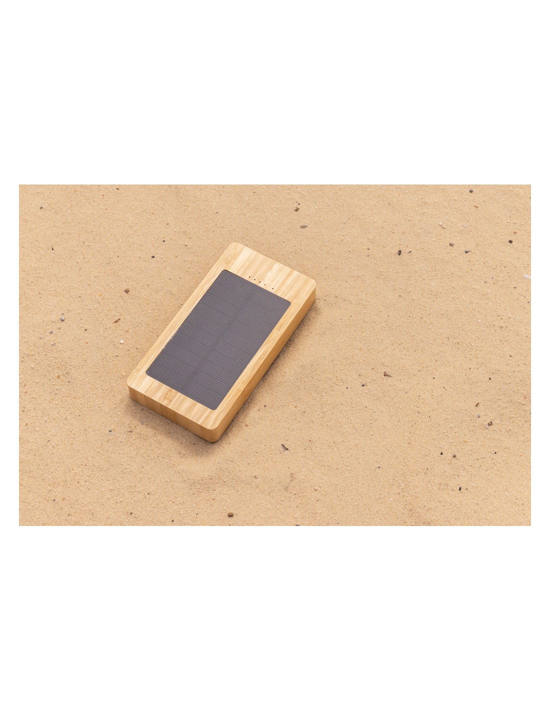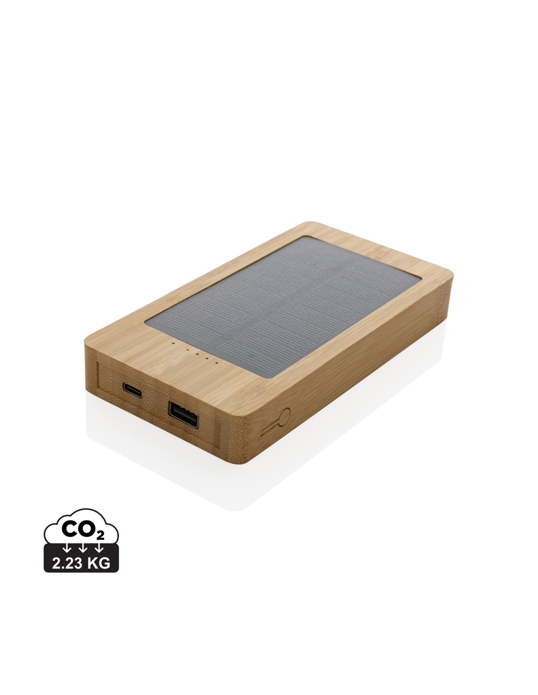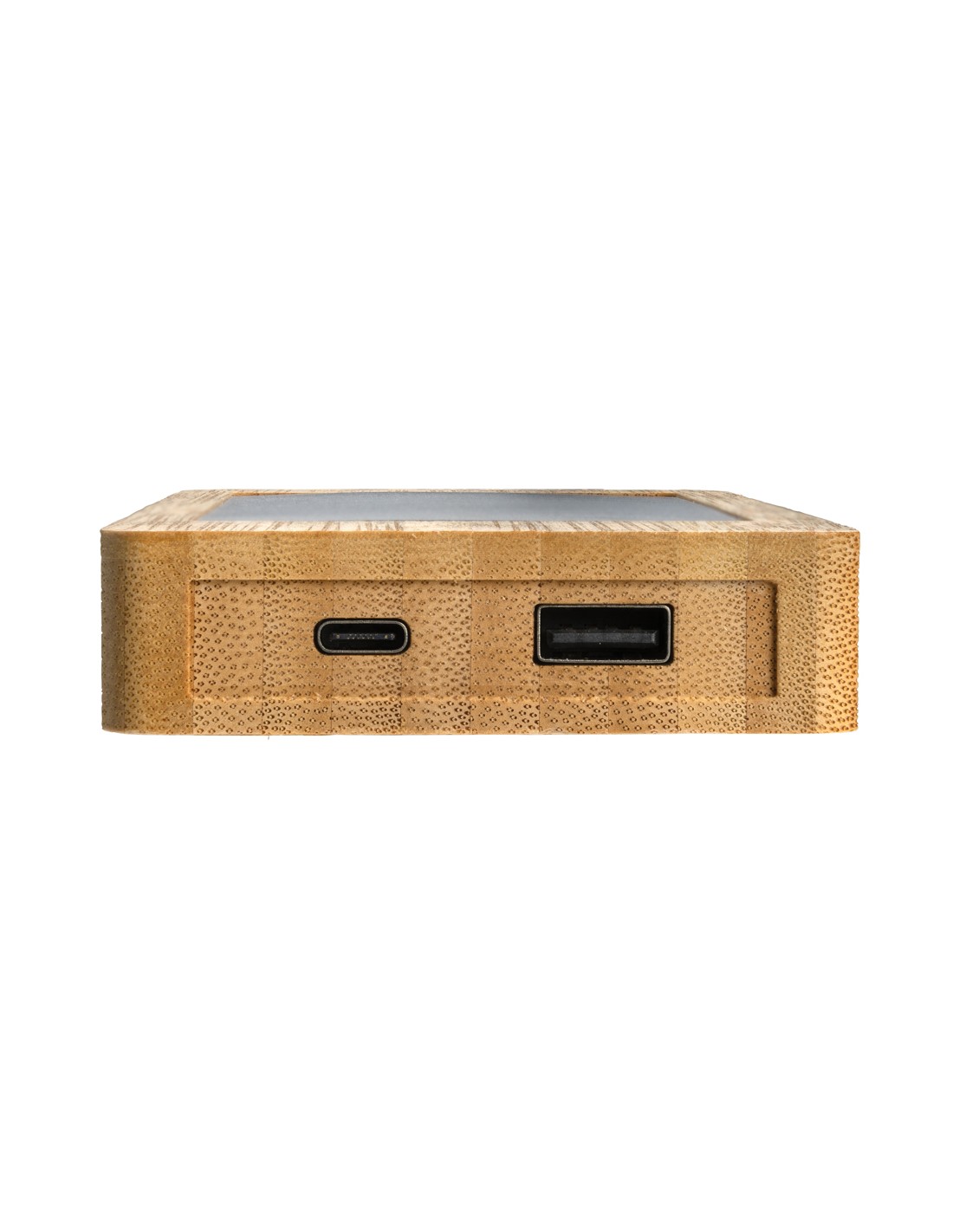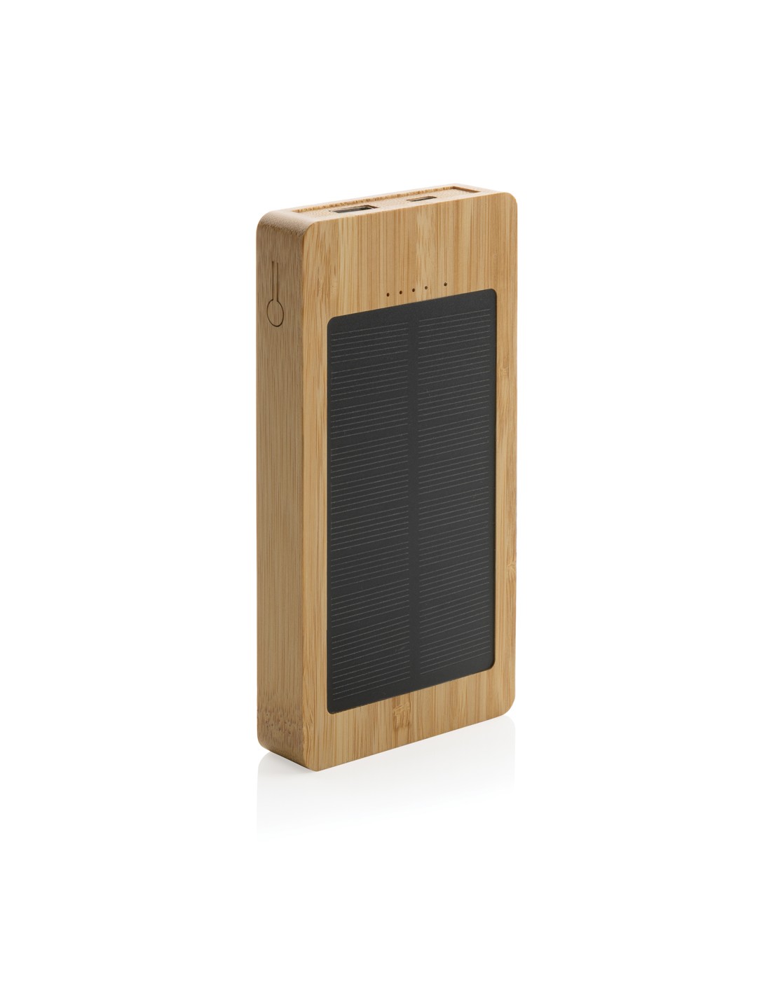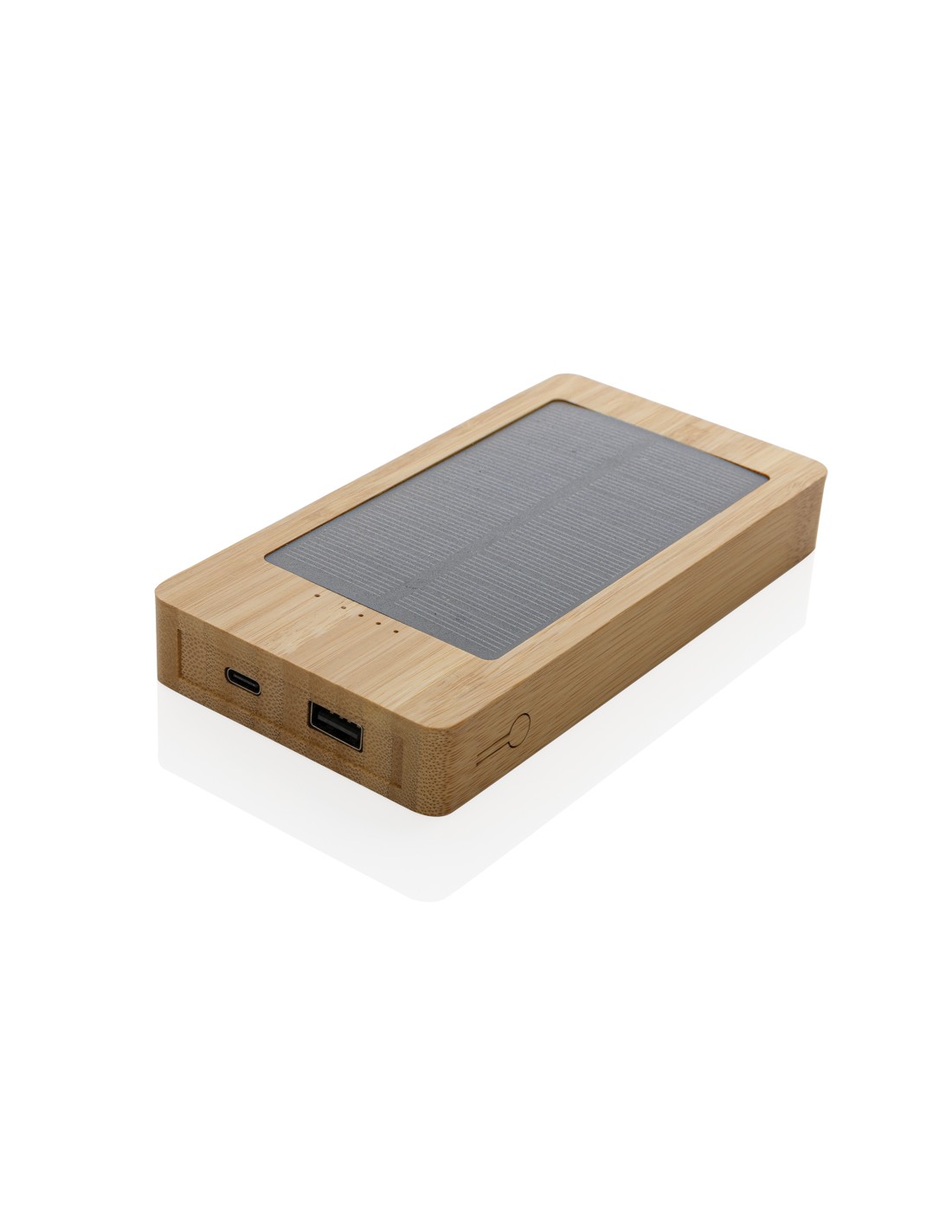 Powerbank solare da 10.000 mah realizzata con bambù FSC 100%. La powerbank utilizza pannelli solari monocristallini di alta qualità con un tasso di conversione del 19%. La velocità di carica dipende dalle condizioni atmosferiche. La powerbank contiene una batteria al litio di grado A da 10.000 mAh a lunga durata. Velocità di carica solare: 5V/180mA. Input type C: 5V/2A. Output: USB A: 5V/2A Type C: 5V/2A. Articolo e accessori senza PVC. Incluso cavo di ricarica in TPE riciclato certificato RCS. Imballato in una confezione FSC® mix.