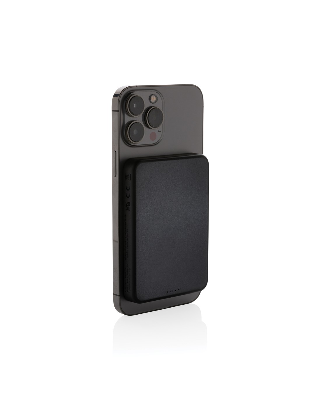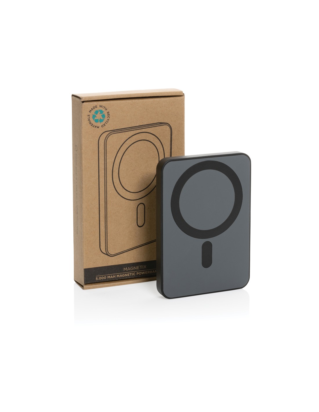 Powerbank tascabile da 5.000 mAh con caricatore wireless magnetico da 5W, la cui custodia è realizzata in plastica ABS riciclata certificata RCS. RCS (Recycled Claim Standard) è uno standard per verificare il contenuto riciclato di un prodotto lungo l'intera catena di fornitura. Contenuto riciclato totale: 20% in base al peso totale dell'articolo. La powerbank contiene una batteria ai polimeri di litio di grado A da 5.000 mAh a lunga durata. Gli indicatori di potenza indicano il livello di energia rimanente, in modo da sapere sempre quando è necessario ricaricare. Input Type-C 5V/2.4A; Output Type-C 5V/2A.4A. Articolo e accessori senza PVC. Include un cavo di ricarica in TPE riciclato certificato RCS. Confezionato in scatola FSC® mix.