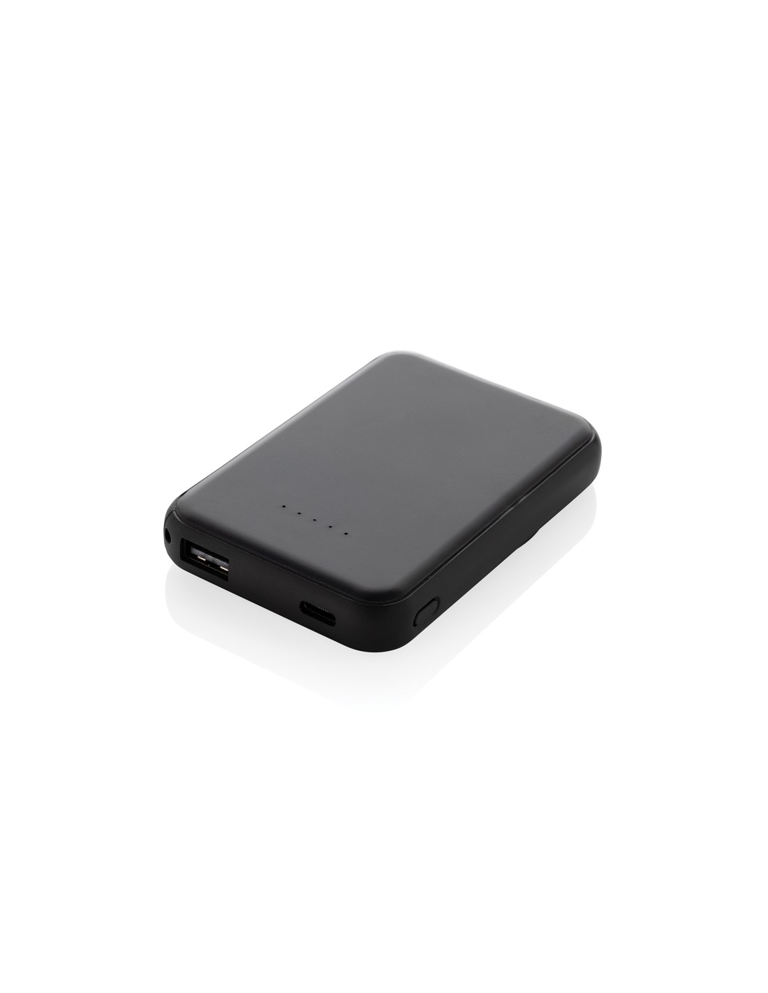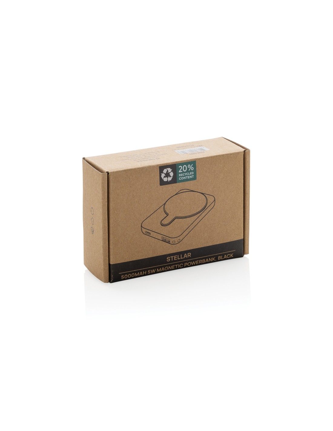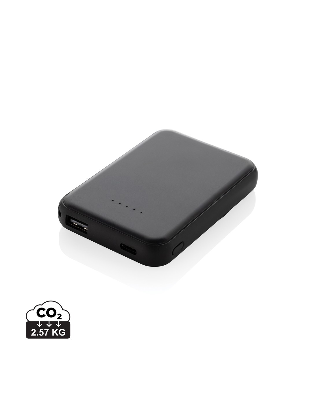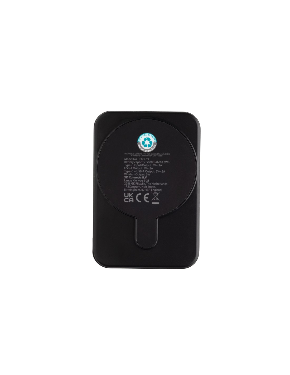 Powerbank tascabile da 5.000 mAh con caricatore wireless magnetico da 5W, la cui custodia è realizzata in plastica ABS riciclata certificata RCS. RCS (Recycled Claim Standard) è uno standard per verificare il contenuto riciclato di un prodotto lungo l'intera catena di fornitura. Contenuto riciclato totale: 20 % in base al peso totale dell'articolo. Con opzione di uscita USB A e una type C. La powerbank contiene una batteria ai polimeri di litio di grado A da 5.000 mAh a lunga durata. Gli indicatori di potenza indicano il livello di energia rimanente, in modo da sapere sempre quando ricaricare.; Input type C 5V/2.4A; uscita type C /USB A: 5V/2A.4A. Articolo e accessori privi di PVC. Incluso cavo di ricarica in TPE riciclato certificato RCS. Imballato in una confezione FSC® mix.