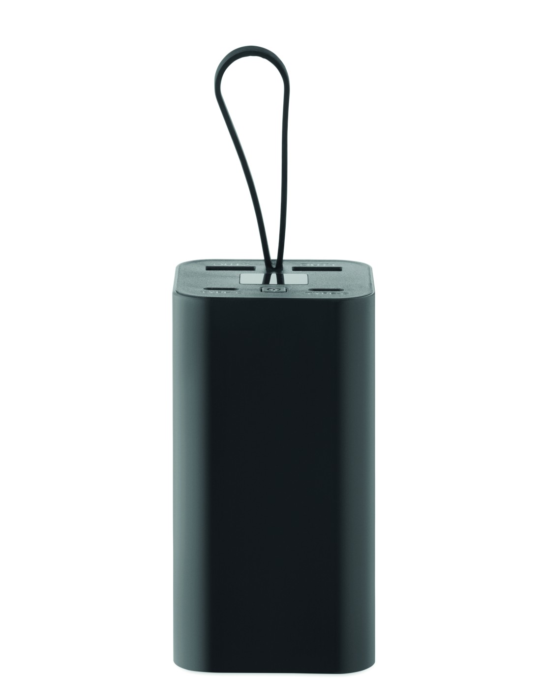 Powerbank da 20.000 mAh in alluminio riciclato con display di potenza digitale e gancio in silicone. Dispone di due uscite Type-C e due USB-A con ricarica rapida PD 65W.