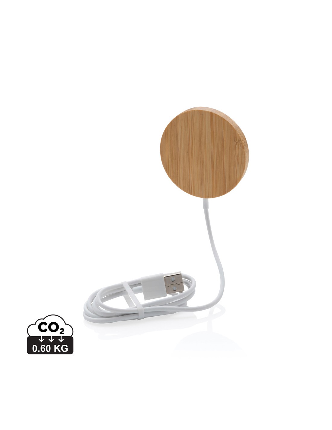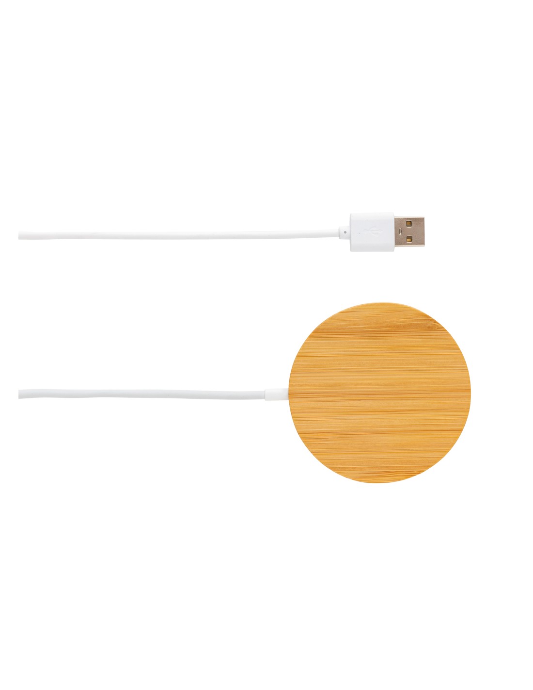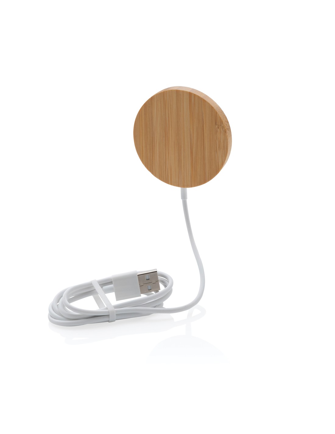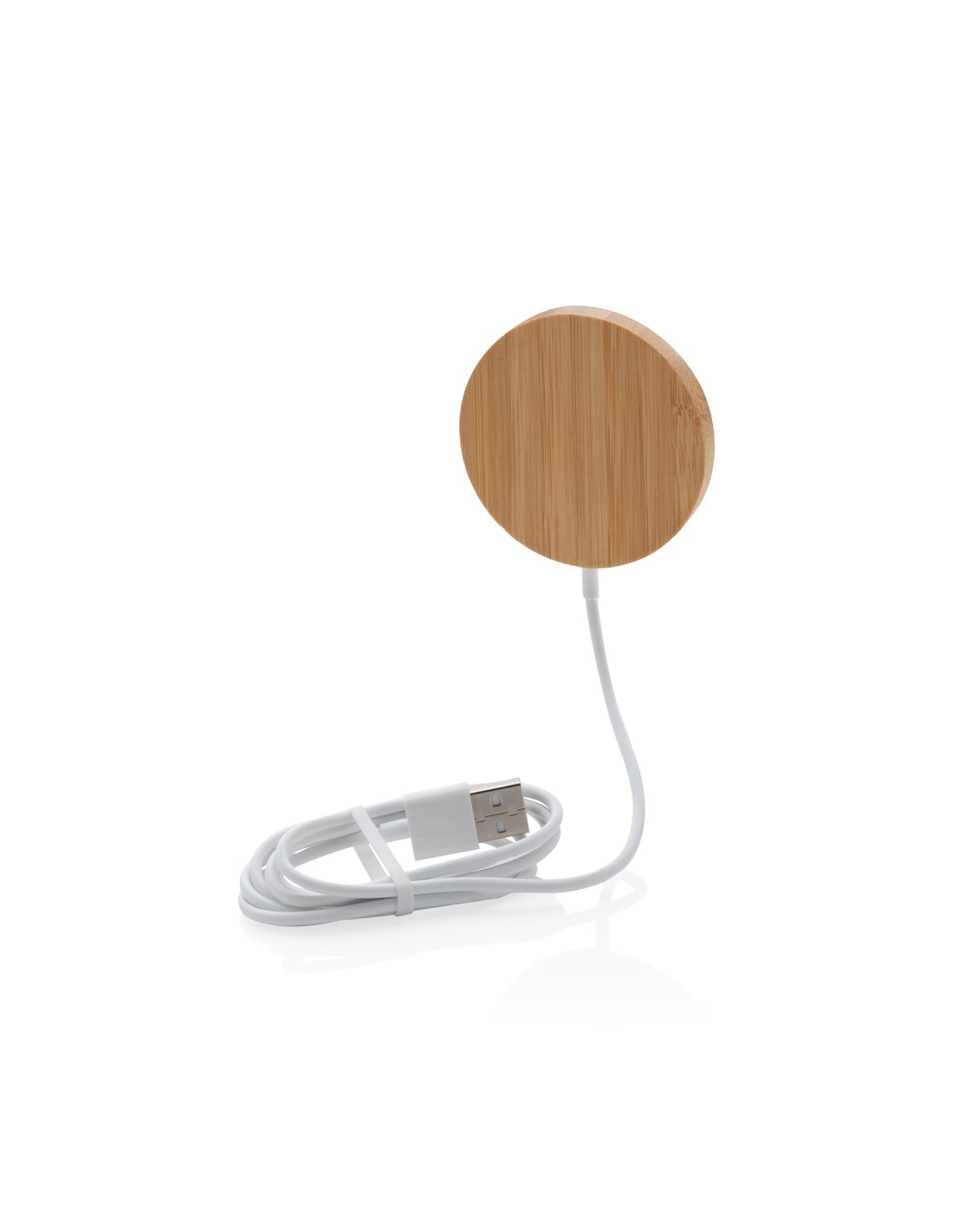 Stazione di ricarica in bambù in grado di ricaricare in modalità wireless tutti i dispositivi abilitati Qi a una velocità di ricarica massima di 15 W. Fornita con un cavo in TPE riciclato da 50 cm con connettori di ingresso di Tipo-C e USB-A. Il bambù utilizzato proviene da fonti responsabili.