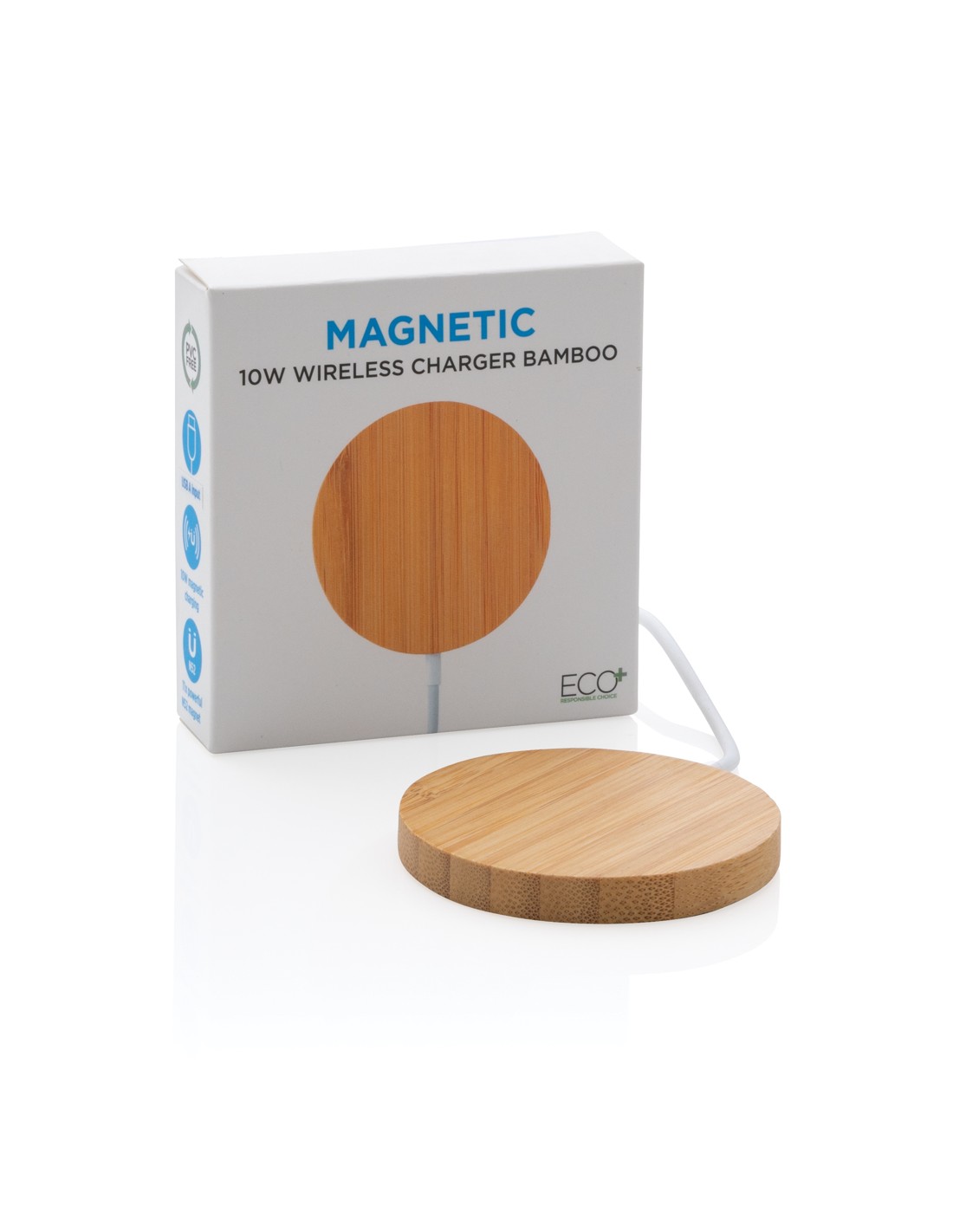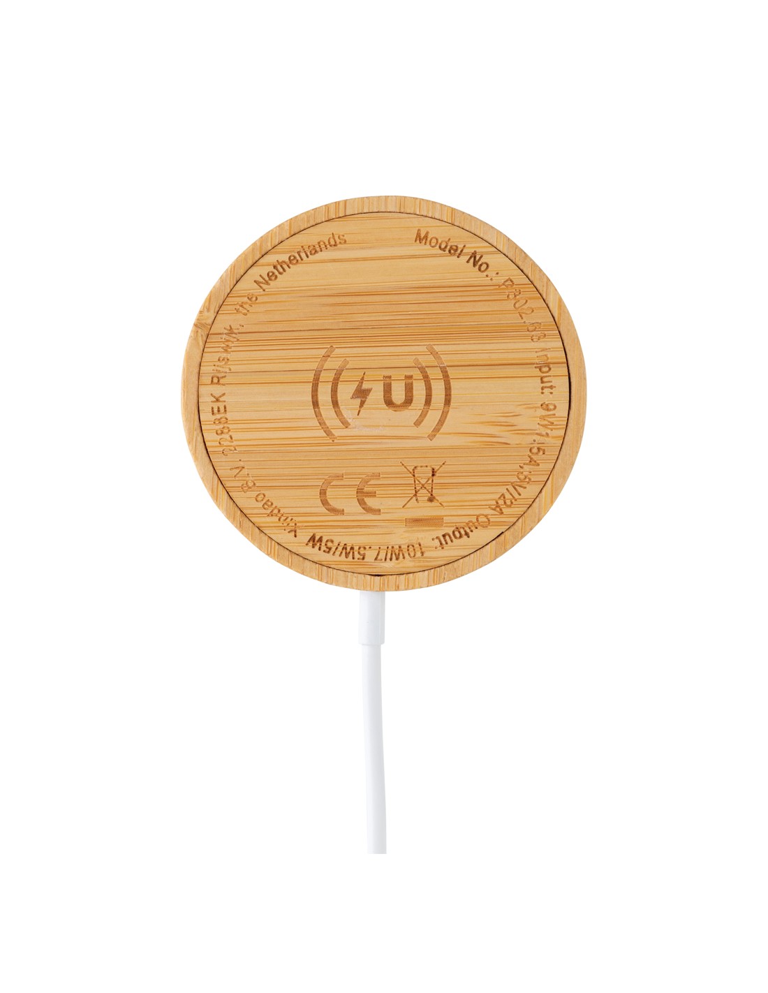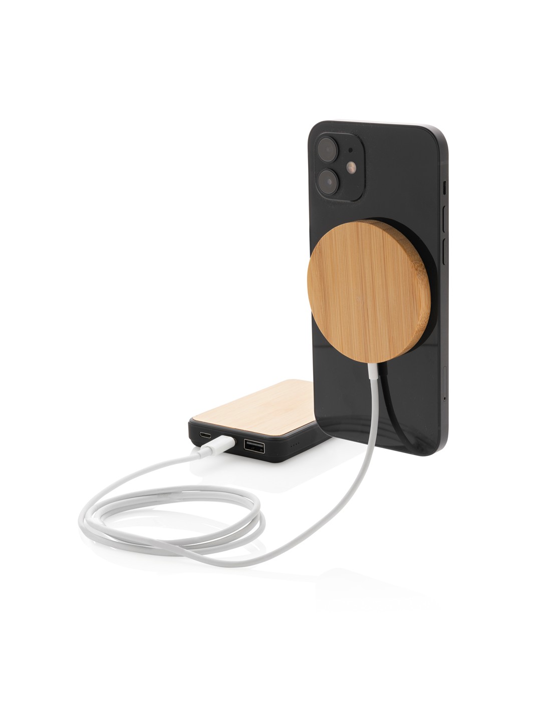 Stazione di ricarica in bambù in grado di ricaricare in modalità wireless tutti i dispositivi abilitati Qi a una velocità di ricarica massima di 15 W. Fornita con un cavo in TPE riciclato da 50 cm con connettori di ingresso di Tipo-C e USB-A. Il bambù utilizzato proviene da fonti responsabili.