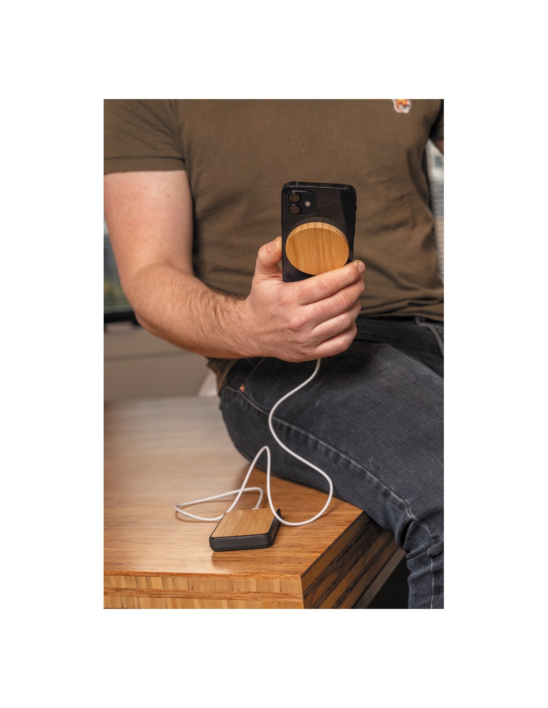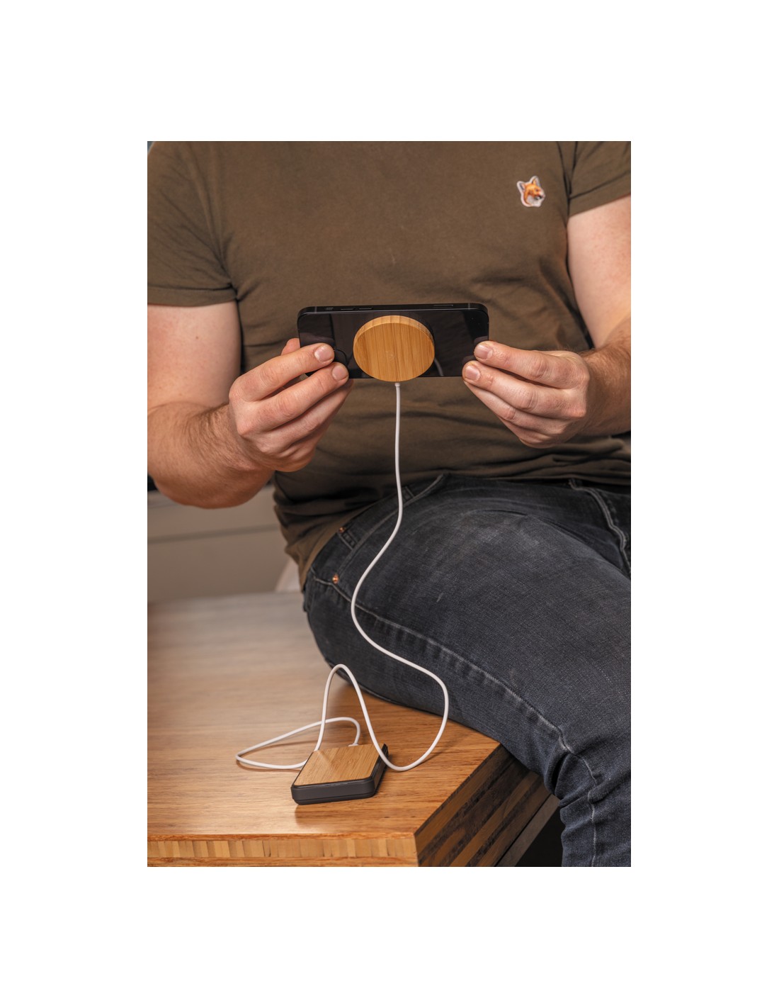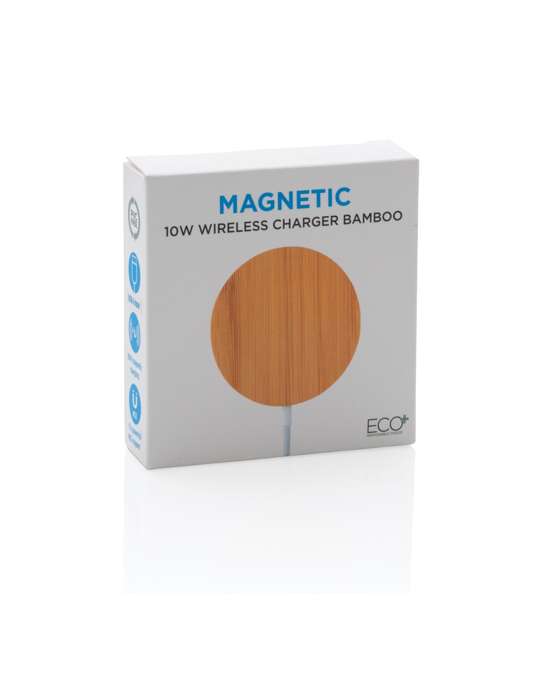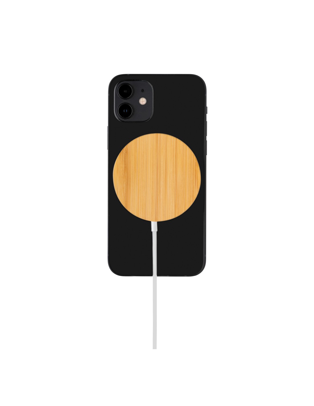 Stazione di ricarica in bambù in grado di ricaricare in modalità wireless tutti i dispositivi abilitati Qi a una velocità di ricarica massima di 15 W. Fornita con un cavo in TPE riciclato da 50 cm con connettori di ingresso di Tipo-C e USB-A. Il bambù utilizzato proviene da fonti responsabili.