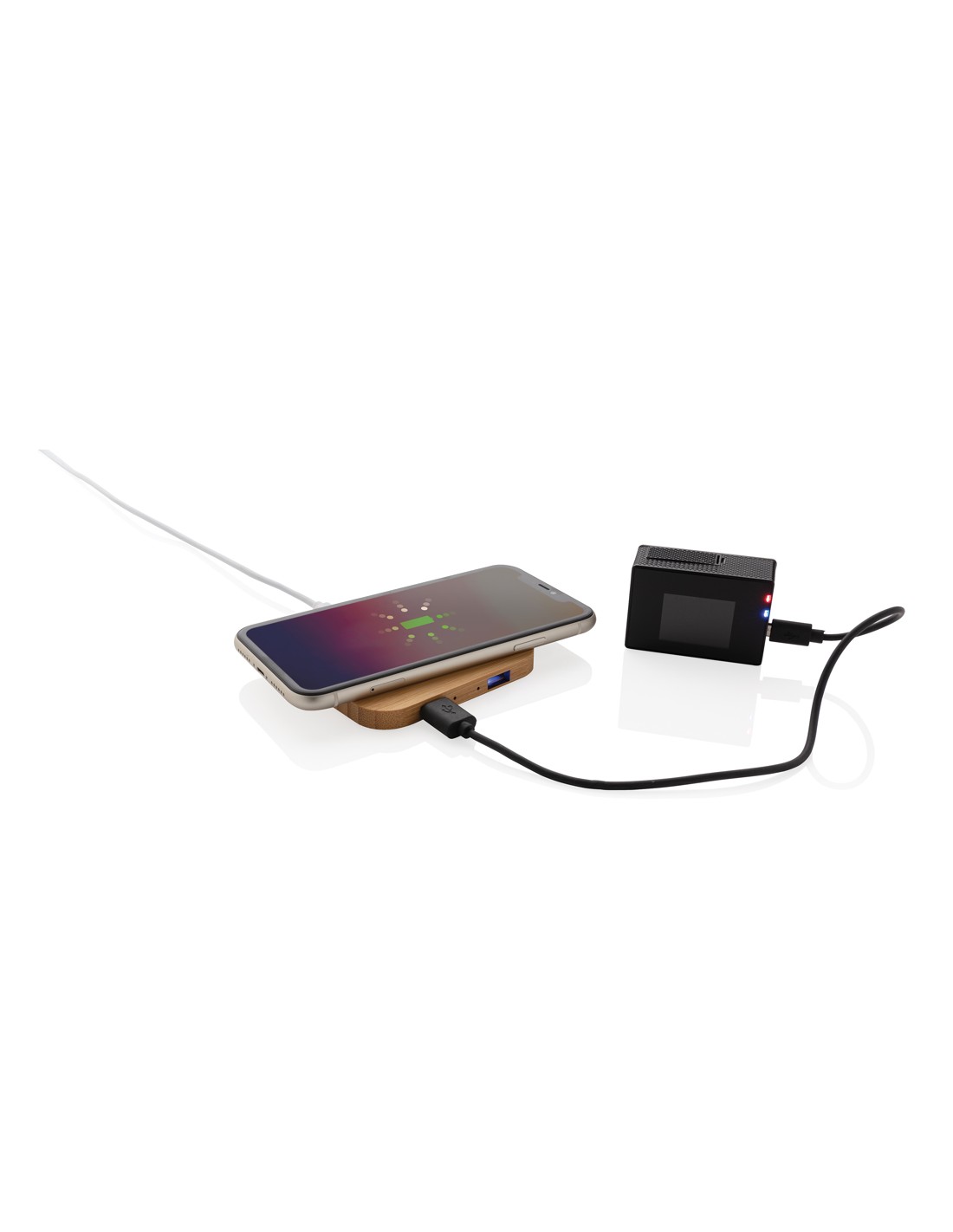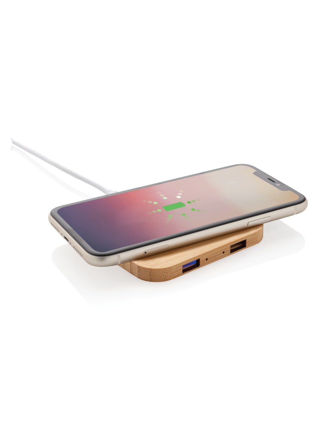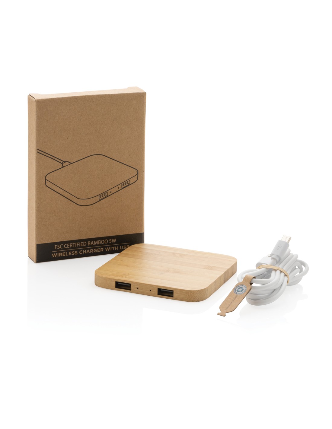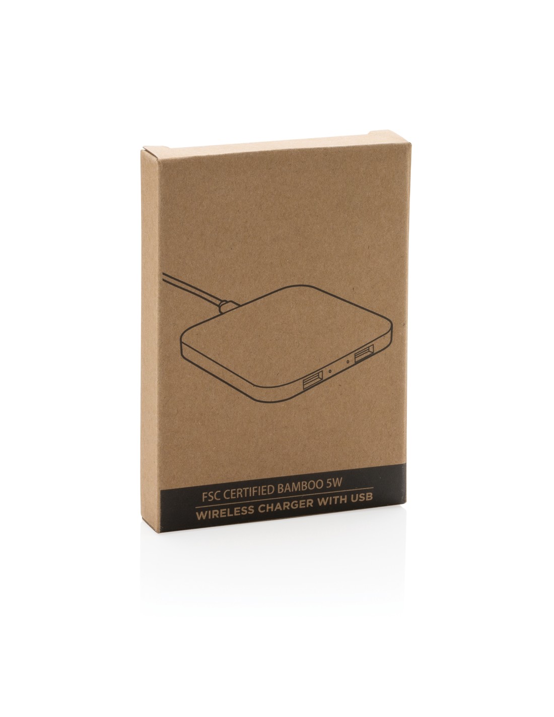 Caricatore wireless da 5W realizzato in bambù certificato FSC al 100% con due porte USB integrate. Include cavo micro USB in TPE da 150 cm. Compatibile con tutti i dispositivi abilitati QI come Android di ultima generazione, iPhone 8 e versioni successive. Input: 5V/2A; Output USB, 5V/2A; output wireless: 5V/1A - 5W. Articolo e accessori 100% senza PVC. Confezionato in scatolina FSC mix.