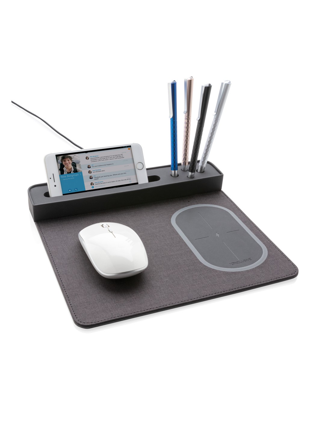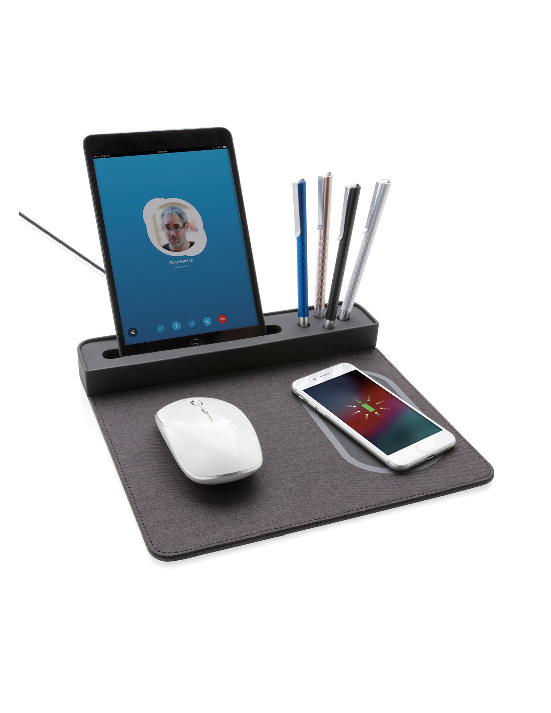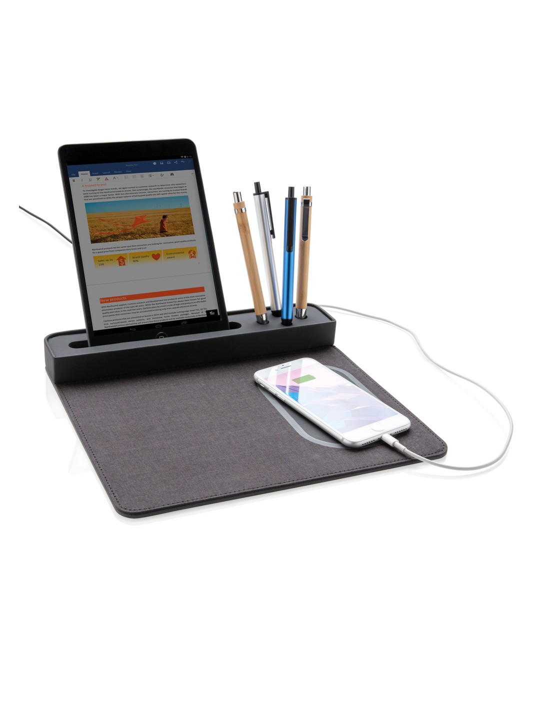 Portapenne e supporto per smartphone realizzato in bambù certificato FSC 100 con caricatore wireless da 10W realizzato con ABS riciclato certificato RCS (Recycled Claim Standard). Contenuto totale riciclato: 6% in base al peso totale dell'articolo (compresa la parte in bambù). Include cavo di...