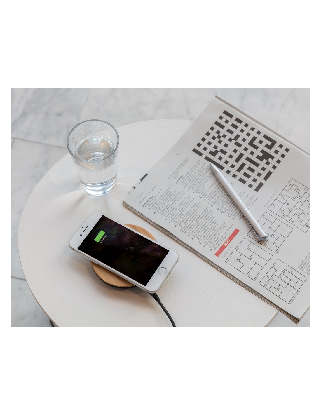 Stazione di ricarica wireless da 5W realizzata con un mix di plastica e paglia di grano, per ridurre la quantità di plastica necessaria. Per caricare un dispositivo senza la tecnologia wireless serve un ricevitore di ricarica wireless o una custodia ricevitore esterna. Confezionato in una scatola...