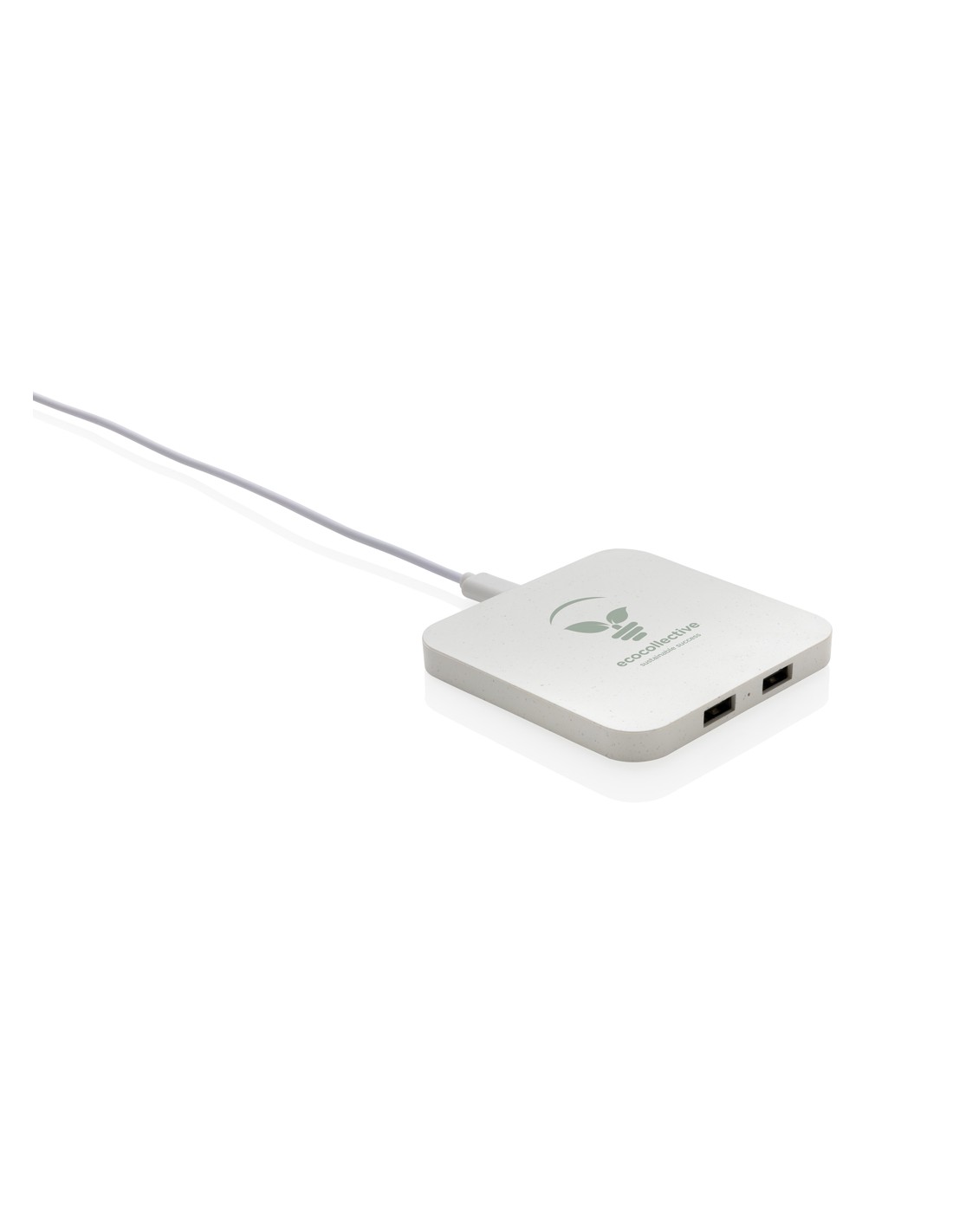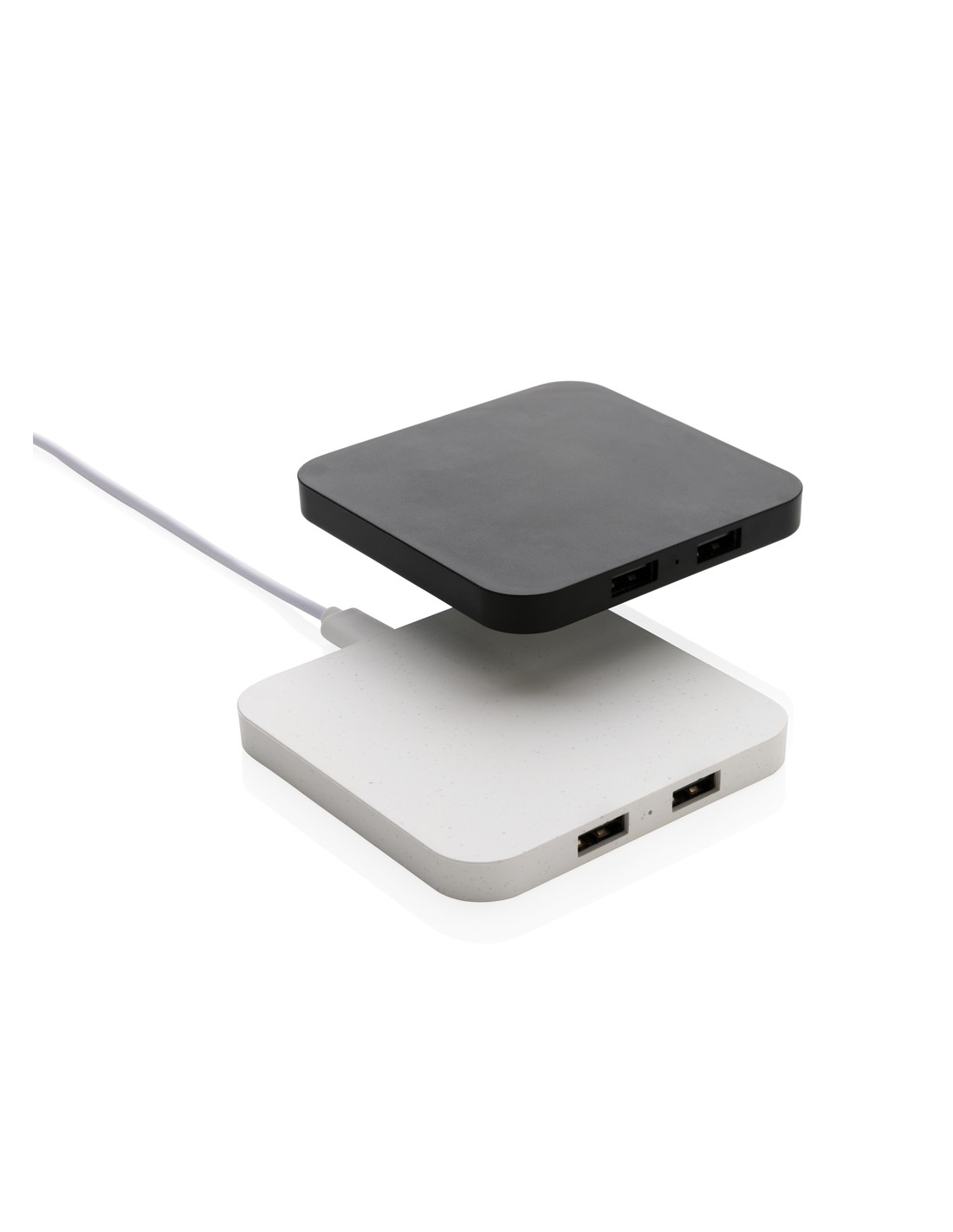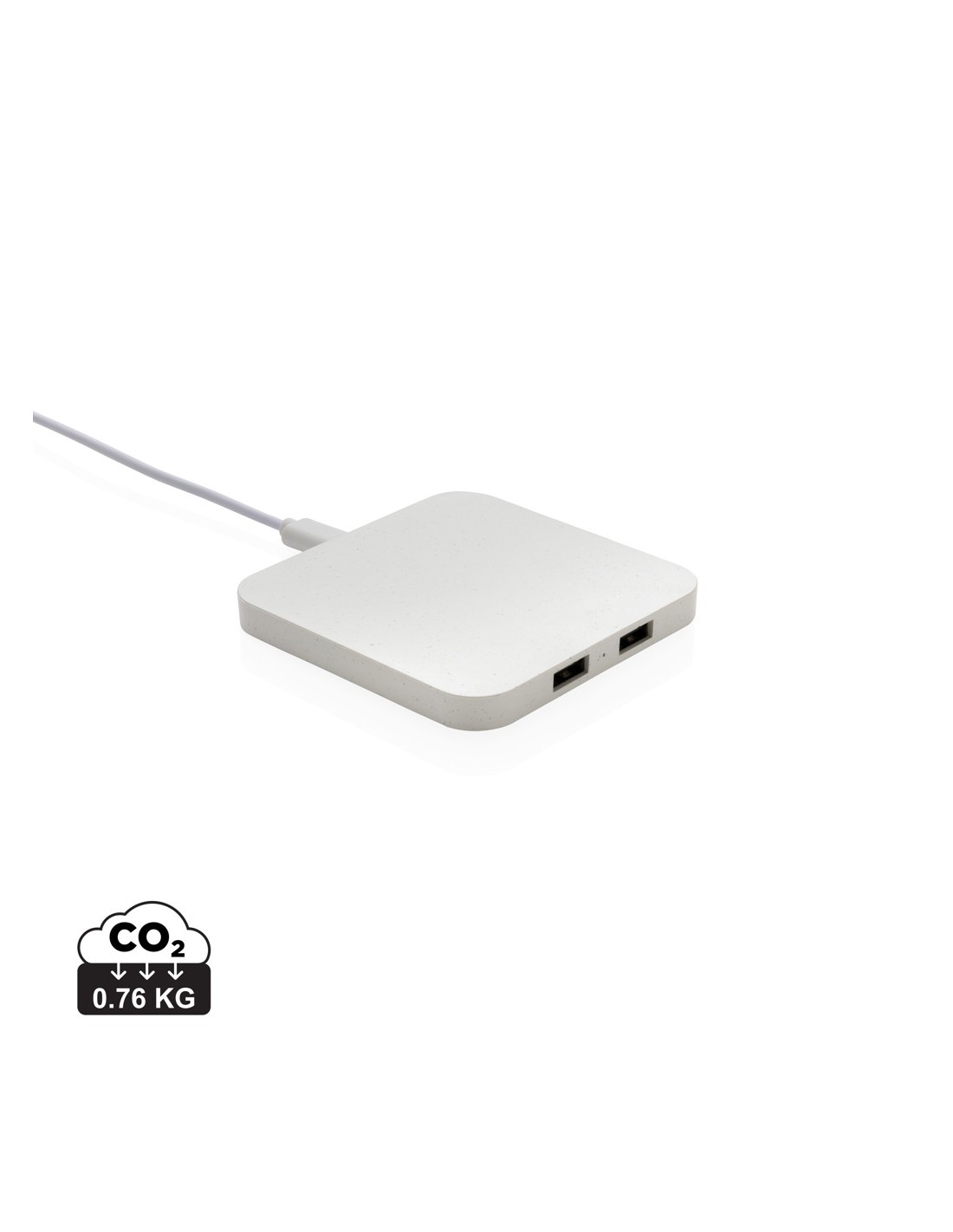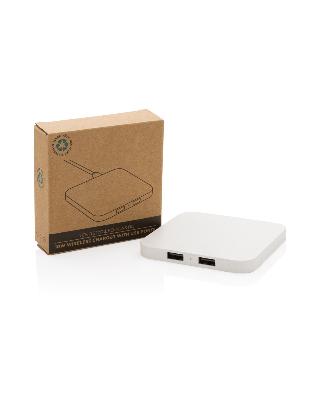 Caricatore wireless da 10W con due porte USB realizzato con ABS riciclato certificato RCS (Recycled Claim Standard). Contenuto totale riciclato: 57% in base al peso totale dell'articolo. La certificazione RCS garantisce una filiera completamente certificata dei materiali riciclati. Ricarica wireless compatibile con Android di ultima generazione, iPhone 8 e superiori. Articolo e accessori non contengono PVC. Include cavo di ricarica type C da 120 cm in TPE riciclato certificato RCS. Confezionato in scatola FSC mix. Type C in; input 5V/2A; 9V/1.67A. Output wireless 5V/1A; 9V/1,1A (10 W).
