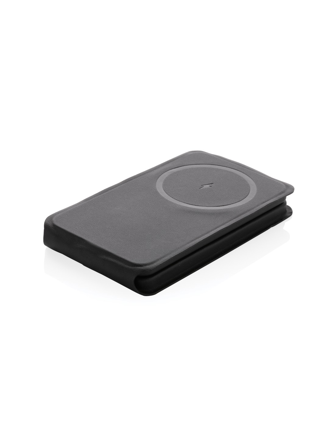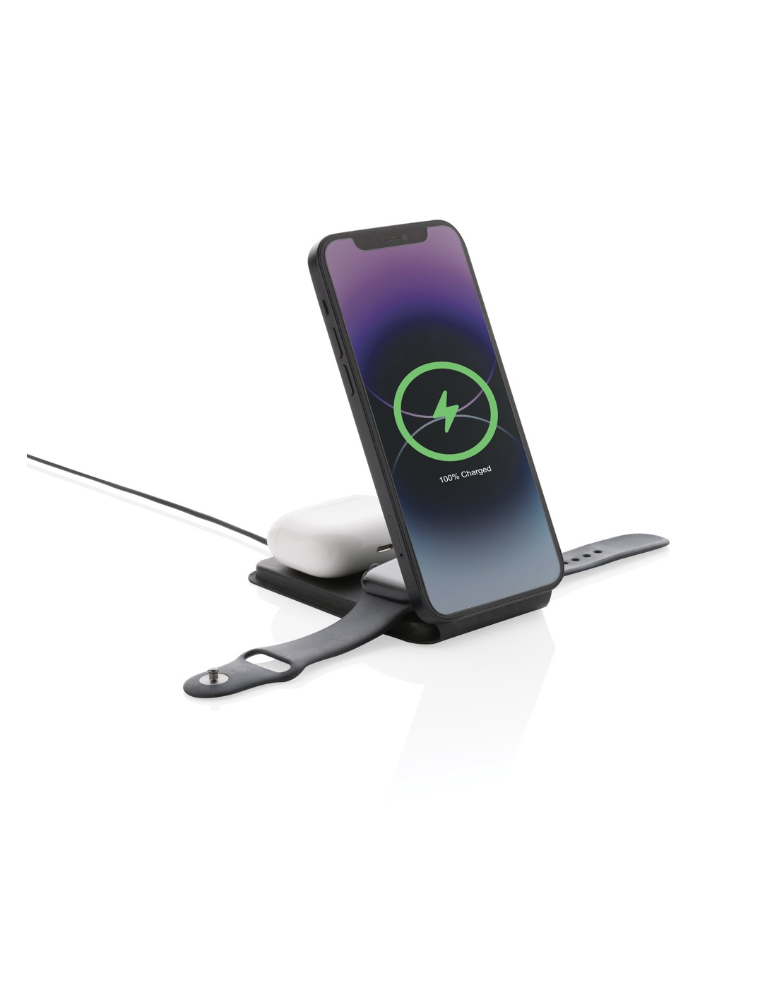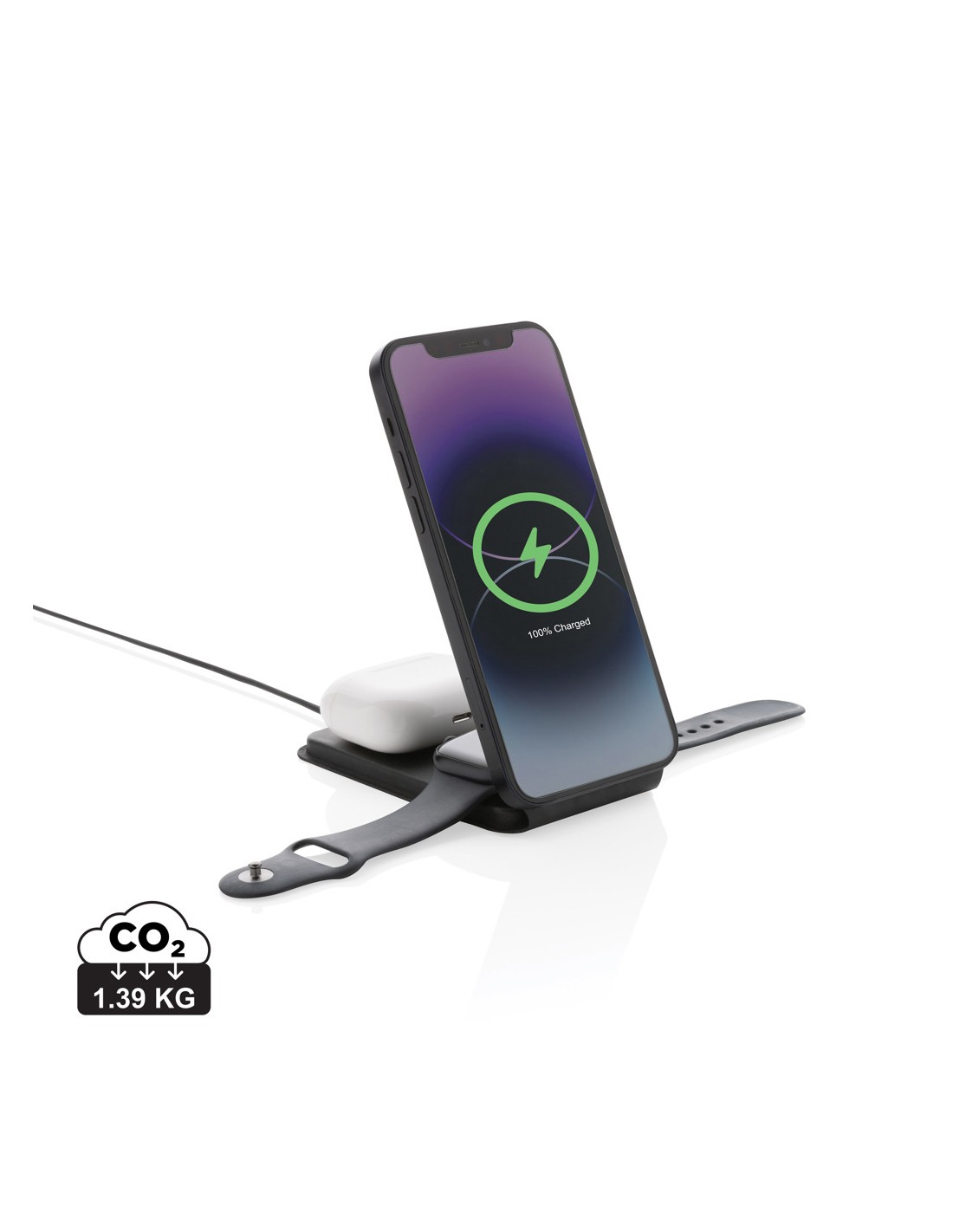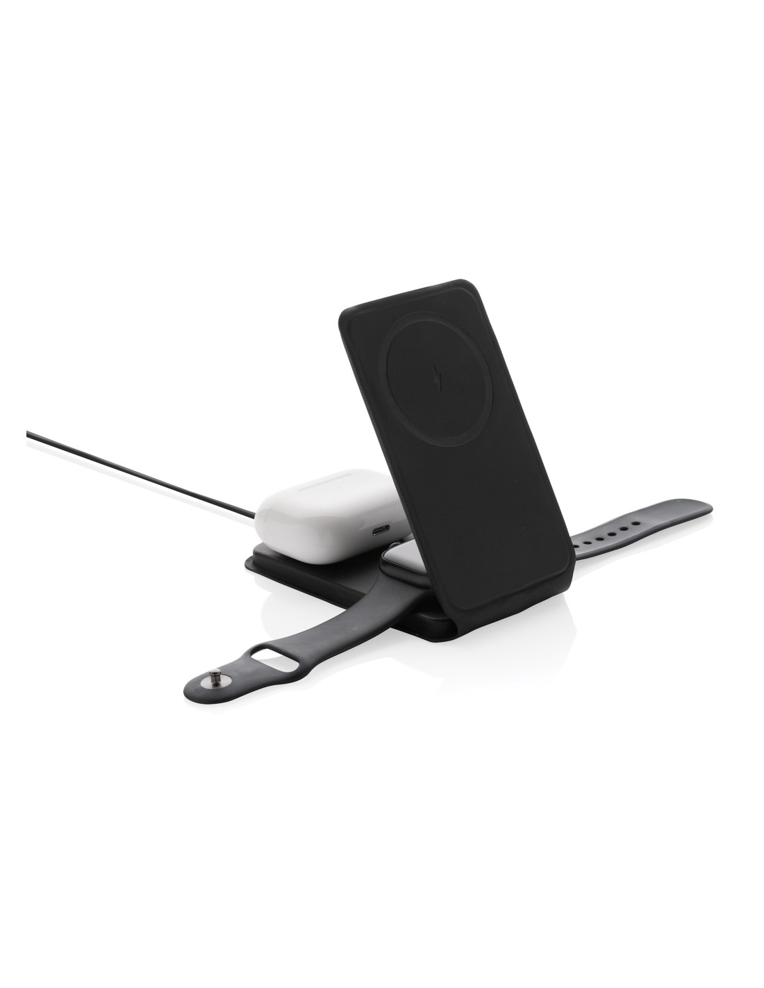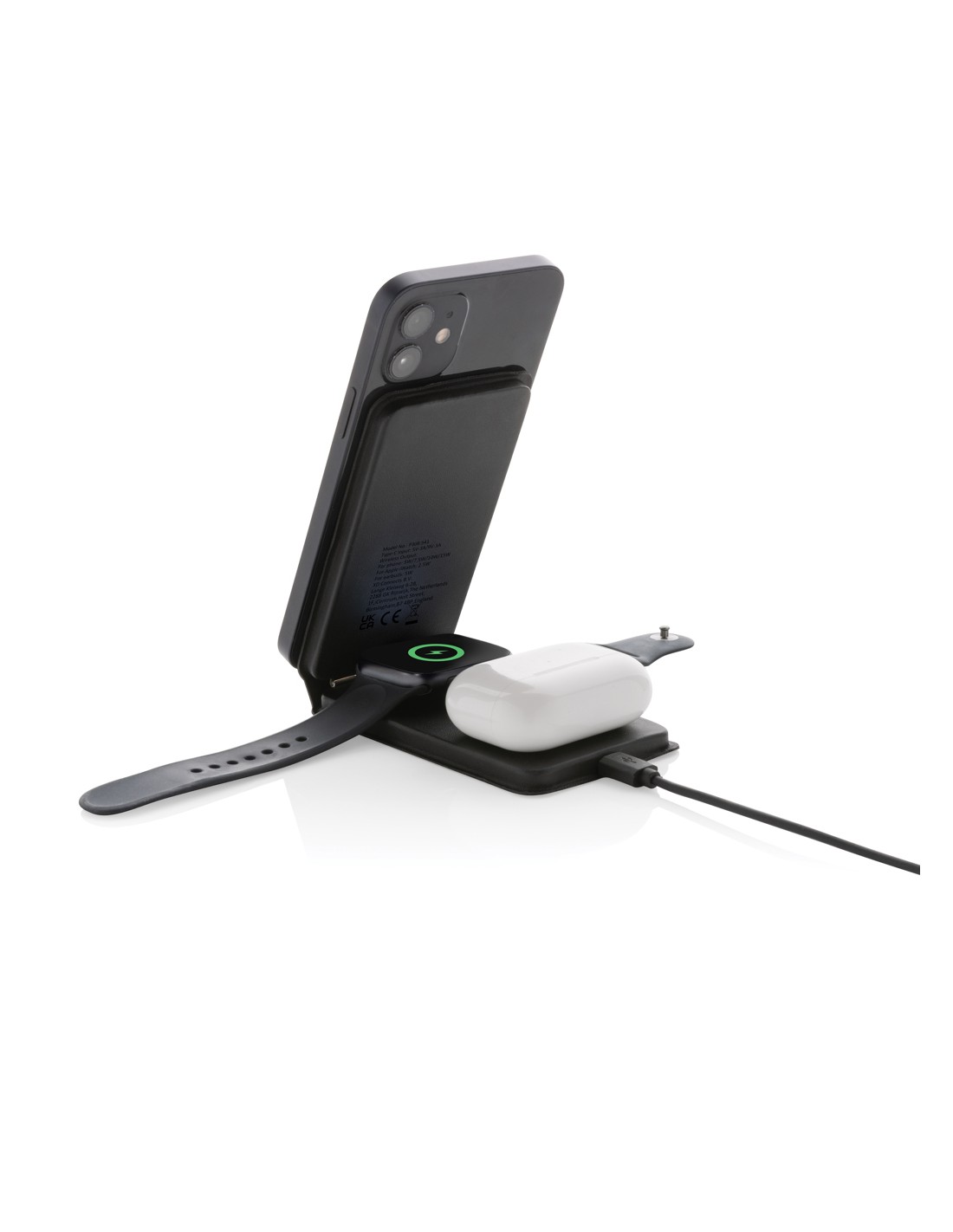 Caricabatterie wireless 3 in 1 elegante e pieghevole, realizzato in PU riciclato certificato RCS. Contenuto riciclato totale: 5% in base al peso totale dell'articolo. La certificazione RCS garantisce una catena di approvvigionamento dei materiali riciclati completamente certificata. E' dotato di un caricabatterie wireless magnetico da 15W sulla parte anteriore. Sul retro è presente un caricatore wireless aggiuntivo da 5W adatto alle custodie degli auricolari o ad altri piccoli dispositivi ricaricabili in modalità wireless e un caricatore wireless da 2,5W per gli smartwatch (solo per gli orologi Apple). Confezionato in scatola kraft FSC® mix. Articolo e accessori 100% senza PVC. Input: 9V/3A per un utilizzo ottimale. Output: Anteriore: 9V/1.1A; 9V/1.67 A/(15W), Auricolari: 5V/1A (5W), Orologio: 5V/0,5A.