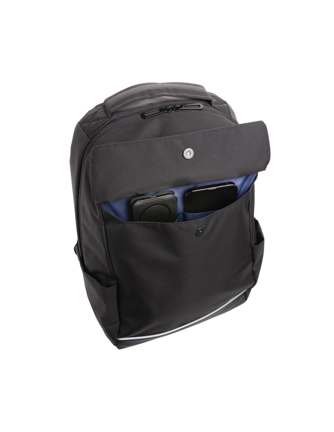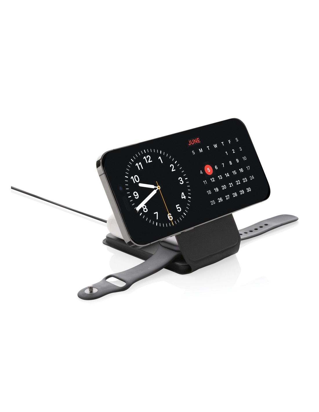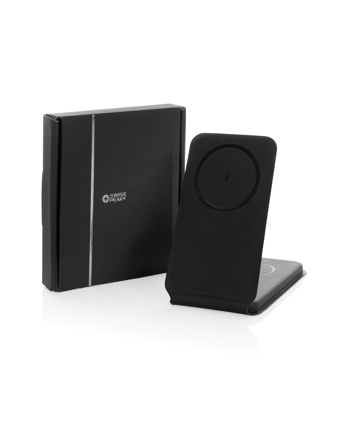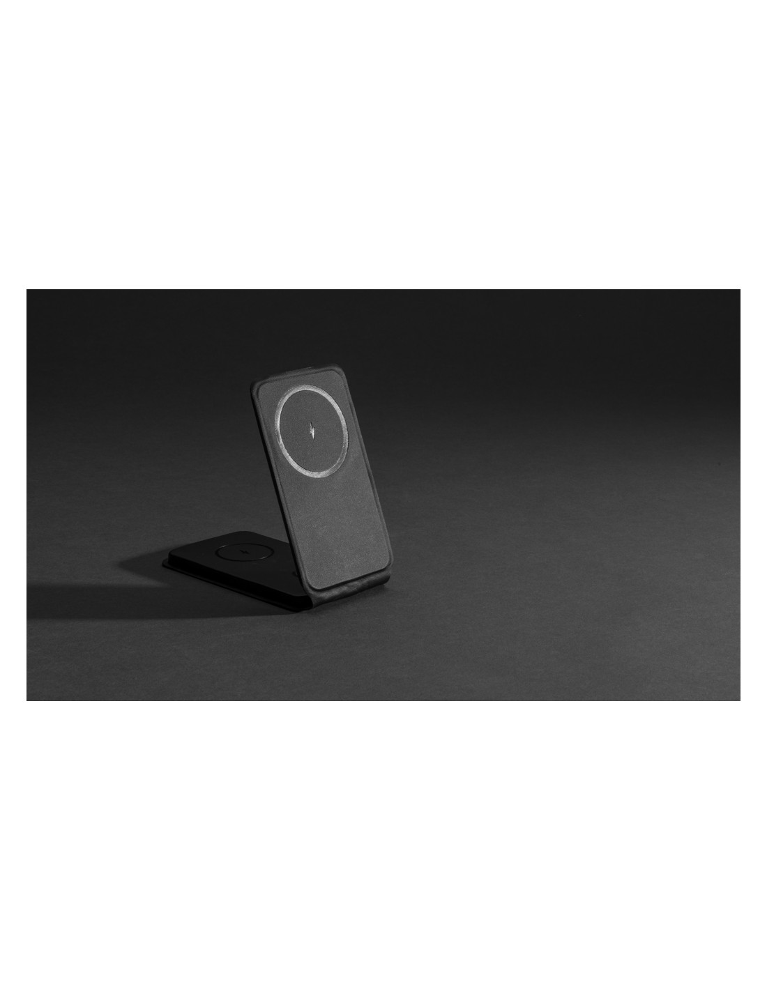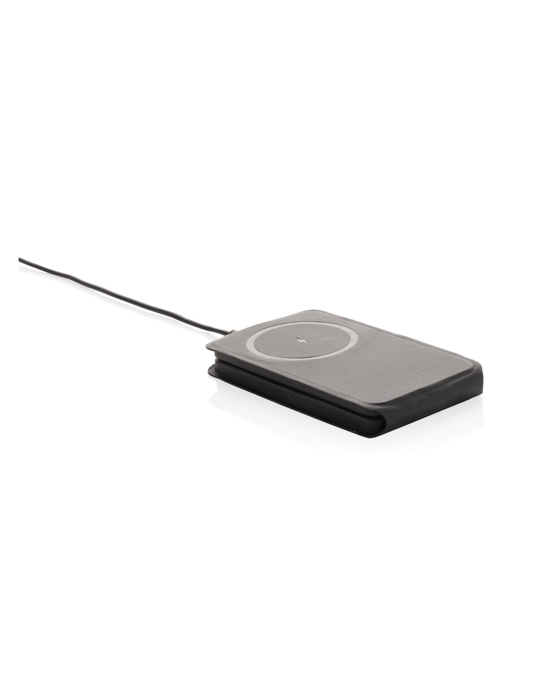 Caricabatterie wireless 3 in 1 elegante e pieghevole, realizzato in PU riciclato certificato RCS. Contenuto riciclato totale: 5% in base al peso totale dell'articolo. La certificazione RCS garantisce una catena di approvvigionamento dei materiali riciclati completamente certificata. E' dotato di un caricabatterie wireless magnetico da 15W sulla parte anteriore. Sul retro è presente un caricatore wireless aggiuntivo da 5W adatto alle custodie degli auricolari o ad altri piccoli dispositivi ricaricabili in modalità wireless e un caricatore wireless da 2,5W per gli smartwatch (solo per gli orologi Apple). Confezionato in scatola kraft FSC® mix. Articolo e accessori 100% senza PVC. Input: 9V/3A per un utilizzo ottimale. Output: Anteriore: 9V/1.1A; 9V/1.67 A/(15W), Auricolari: 5V/1A (5W), Orologio: 5V/0,5A.